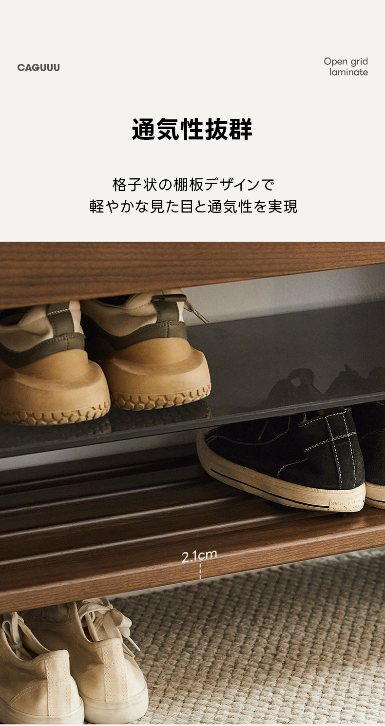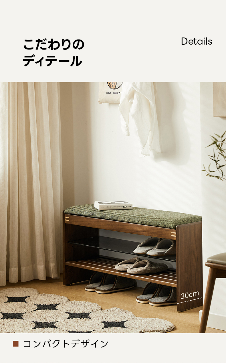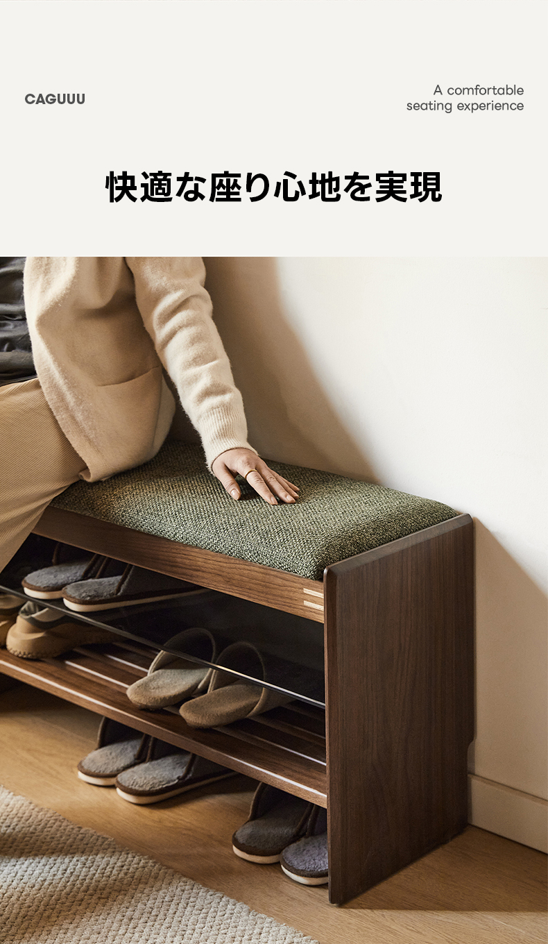 - 【優れた素材とデザイン】: 強化ガラス棚と合板突板仕上げでモダンな印象をプラス。オープン格子デザインにより通気性が良く、靴の湿気を防ぎます。高密度ウレタンクッションを使用した座面は快適な座り心地を提供します。