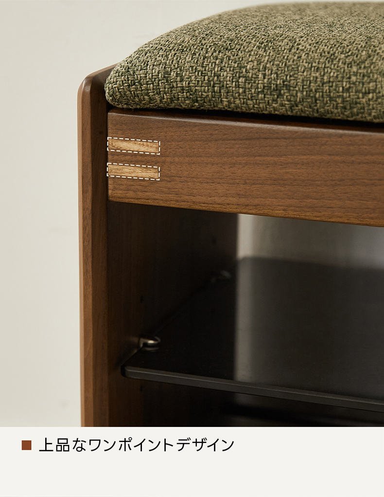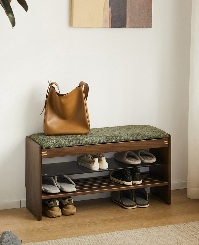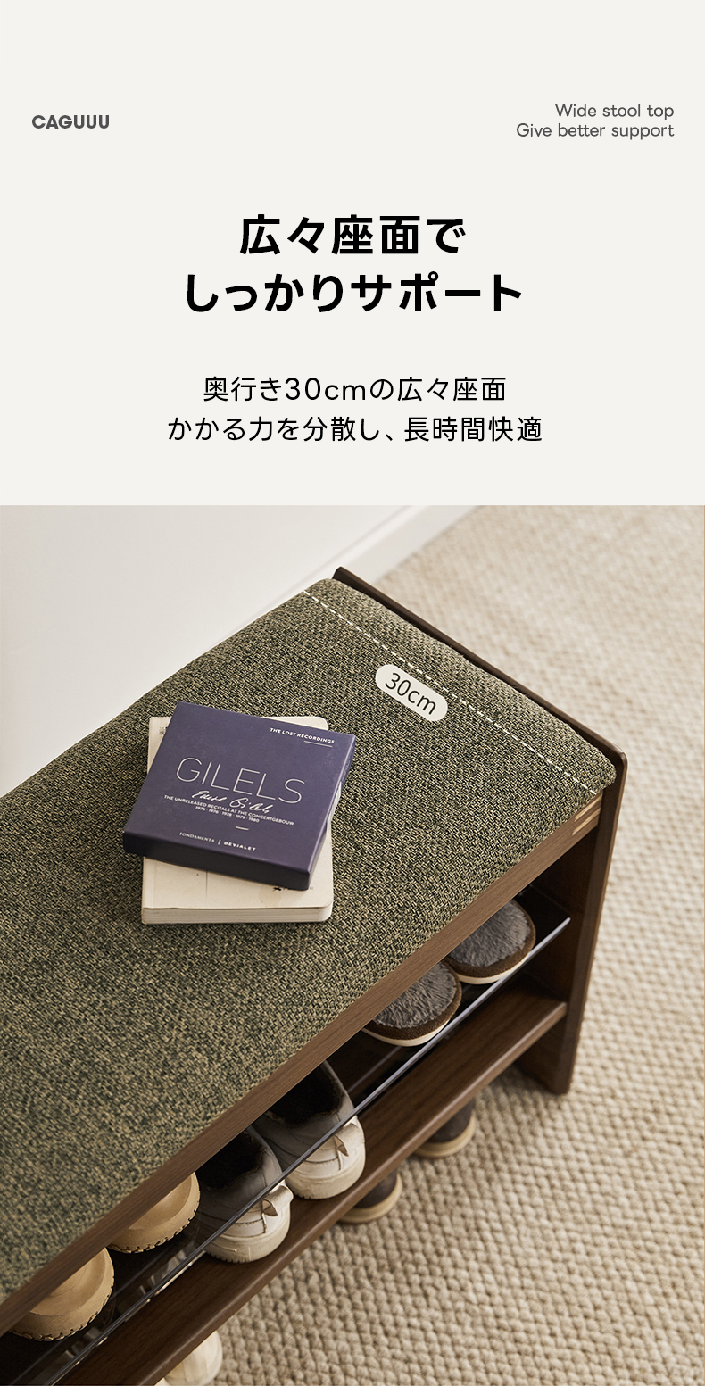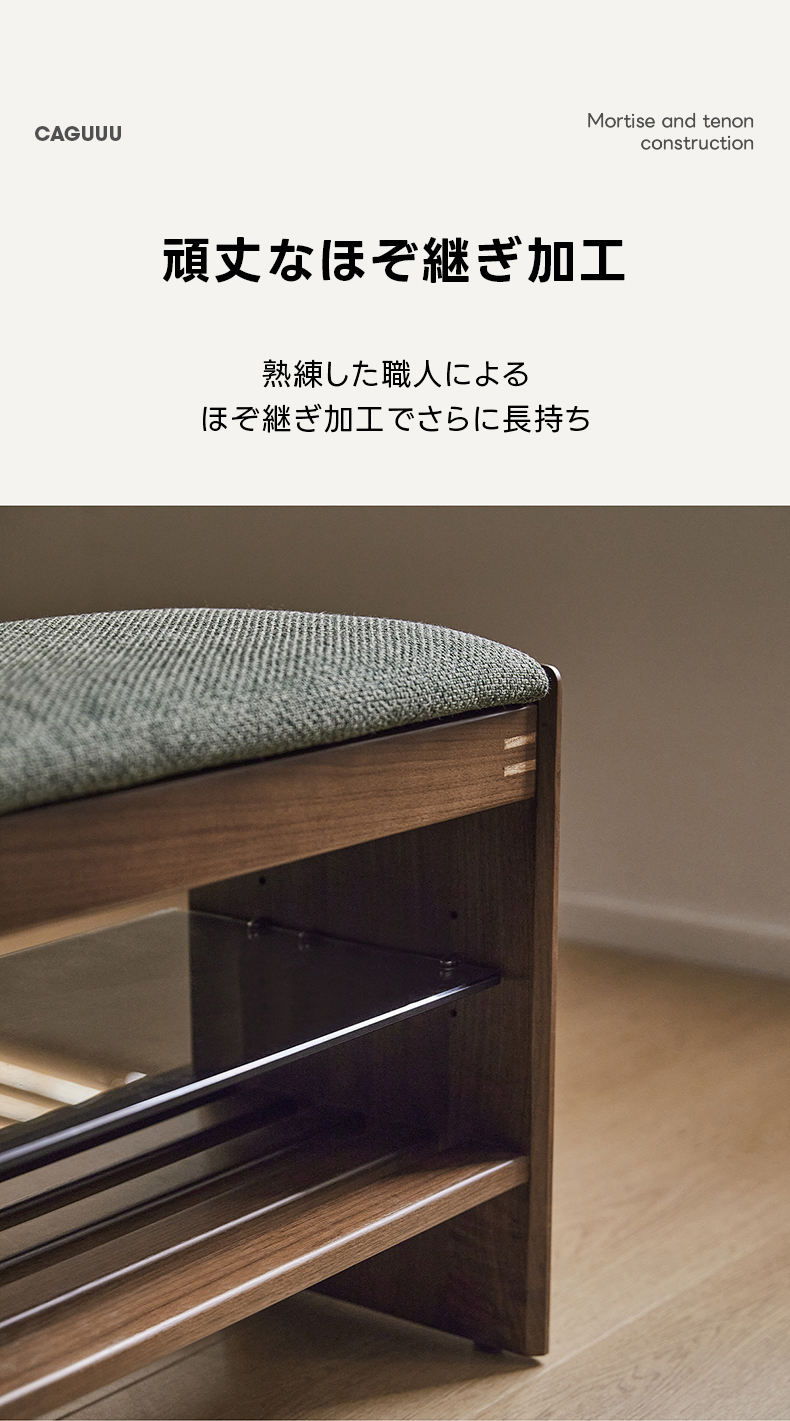 - 【優れた素材とデザイン】: 強化ガラス棚と合板突板仕上げでモダンな印象をプラス。オープン格子デザインにより通気性が良く、靴の湿気を防ぎます。高密度ウレタンクッションを使用した座面は快適な座り心地を提供します。