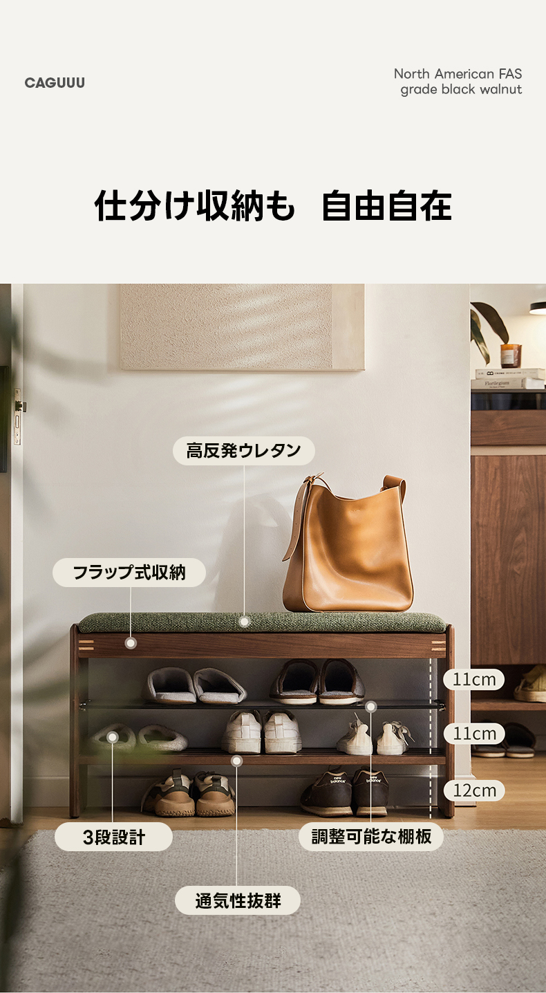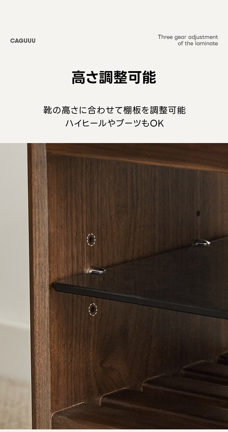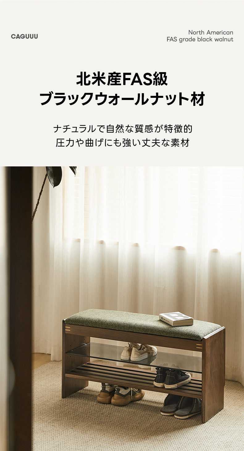 - 【高級感あふれるデザイン】: 北米産FAS級ブラックウォールナット材を使用し、耐久性と美しさを兼ね備えたシューズラックです。天然木の温かみと洗練されたデザインが玄関をスタイリッシュに演出します。