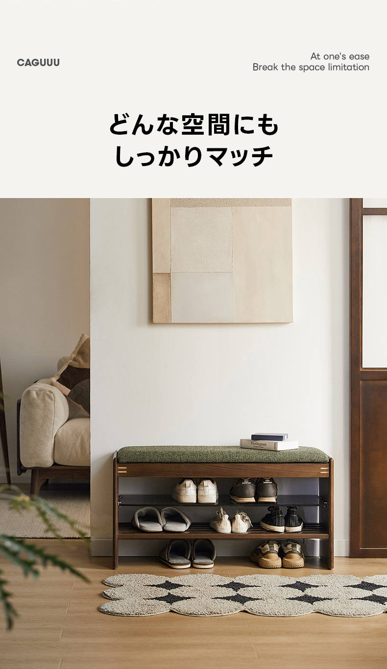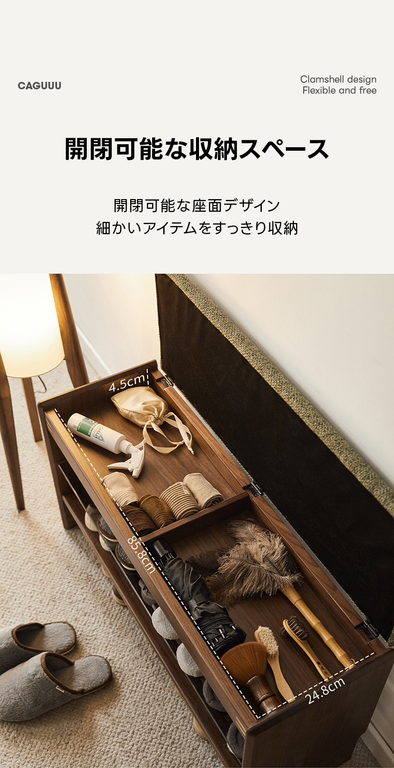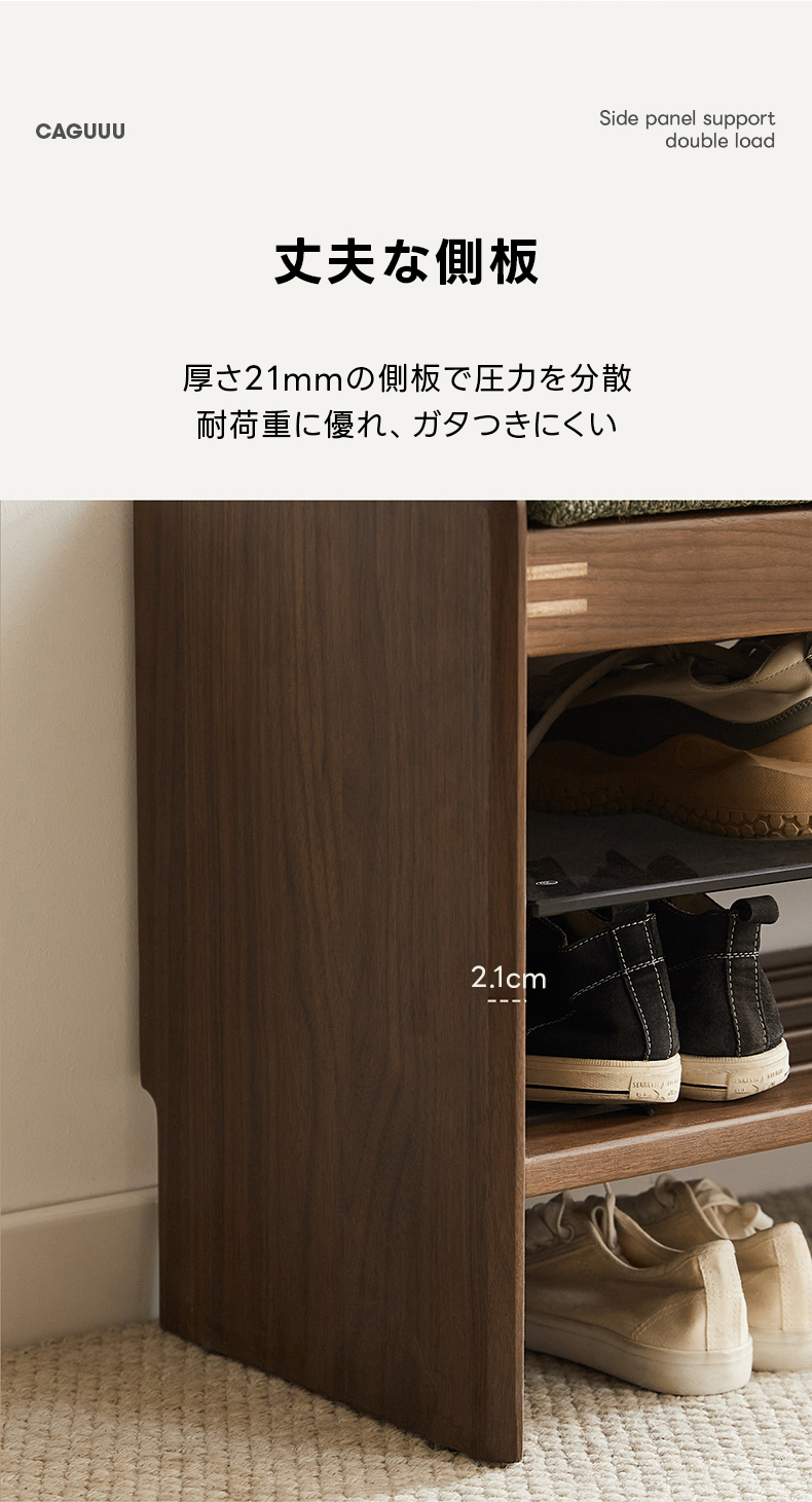 - 【高級感あふれるデザイン】: 北米産FAS級ブラックウォールナット材を使用し、耐久性と美しさを兼ね備えたシューズラックです。天然木の温かみと洗練されたデザインが玄関をスタイリッシュに演出します。