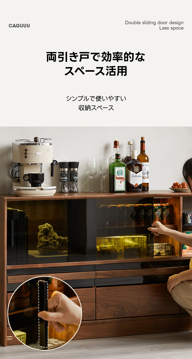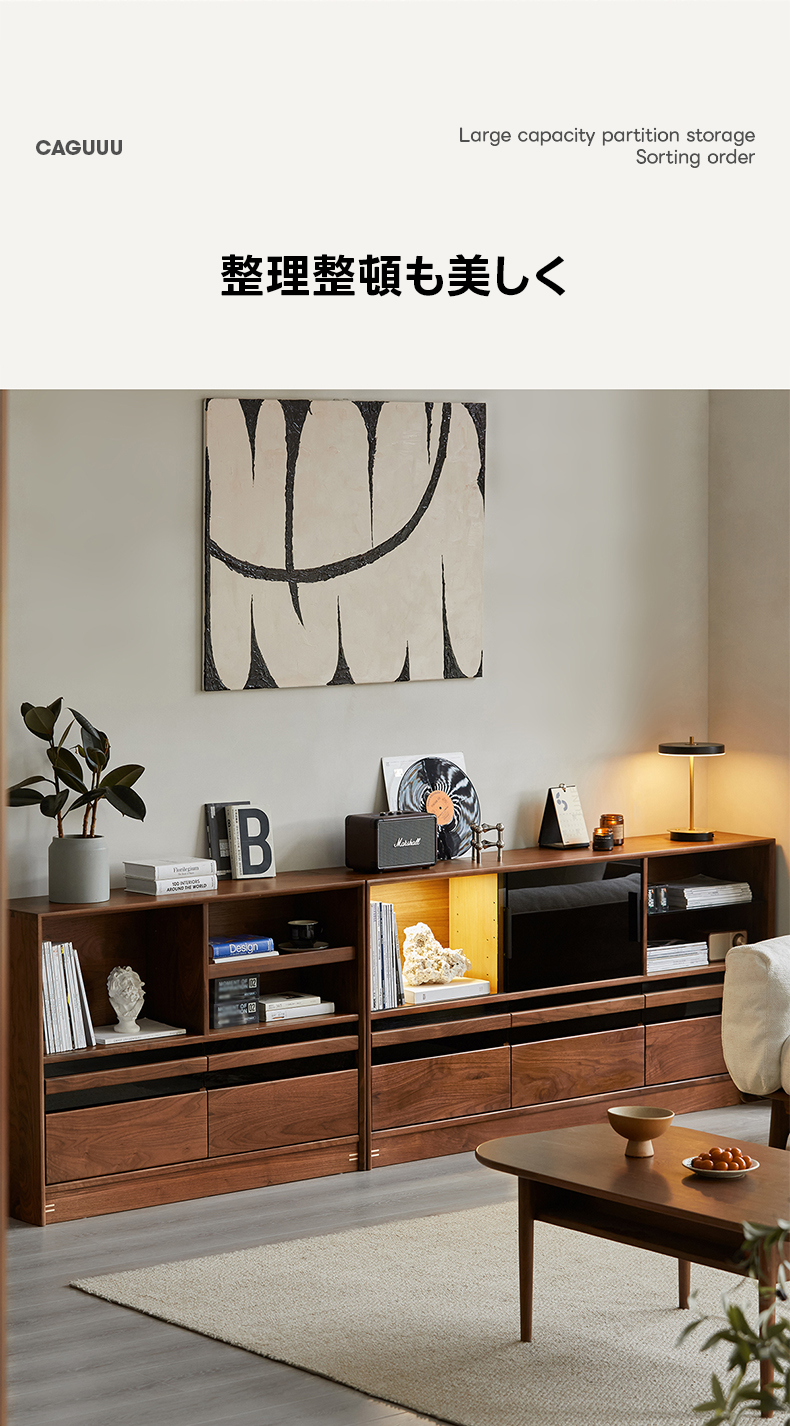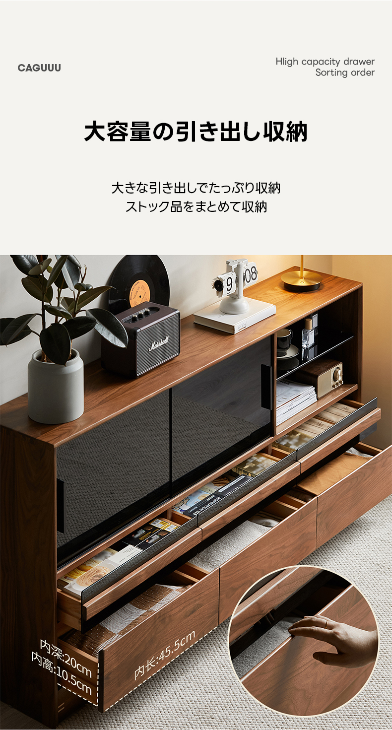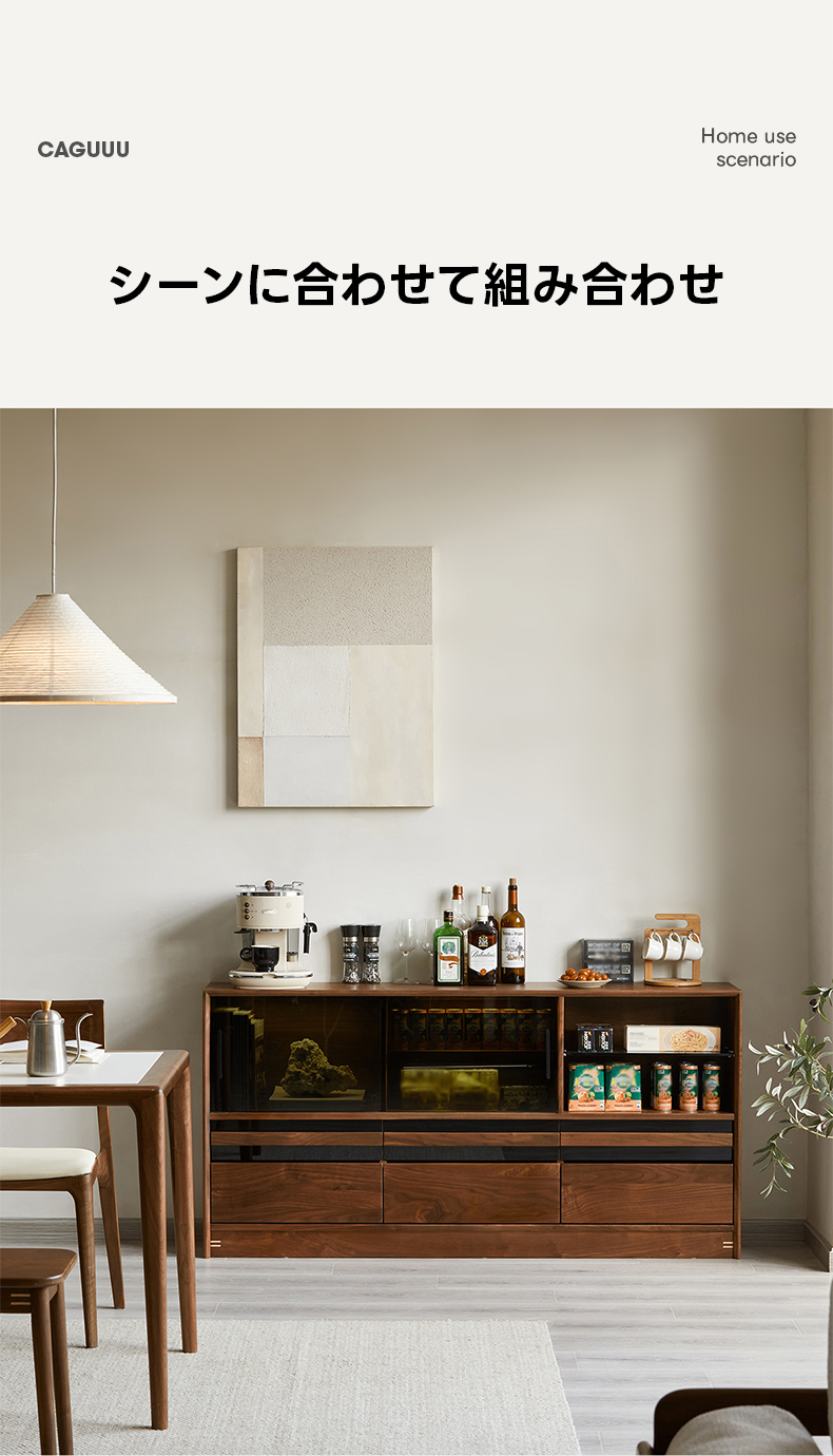 - 【自由な組み合わせと大容量収納】ウォールナット材サイドボードは、2種類のサイズから選べ、シーンに応じて自由に組み合わせが可能です。大容量の引き出しとオープンラックで、リビングやダイニングのアイテムを美しく整理整頓できます。