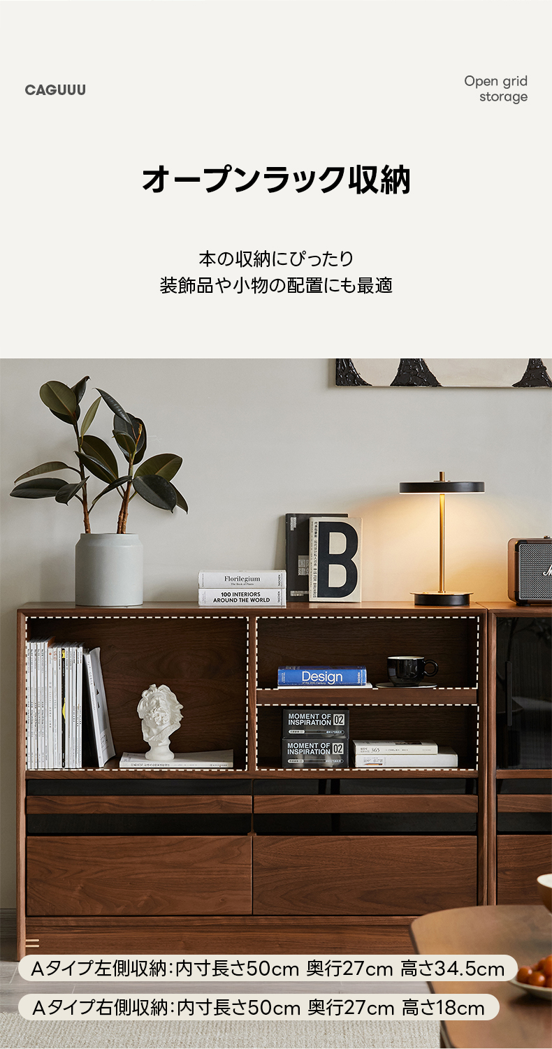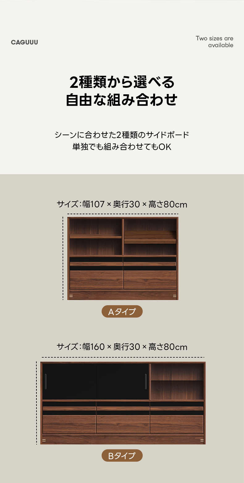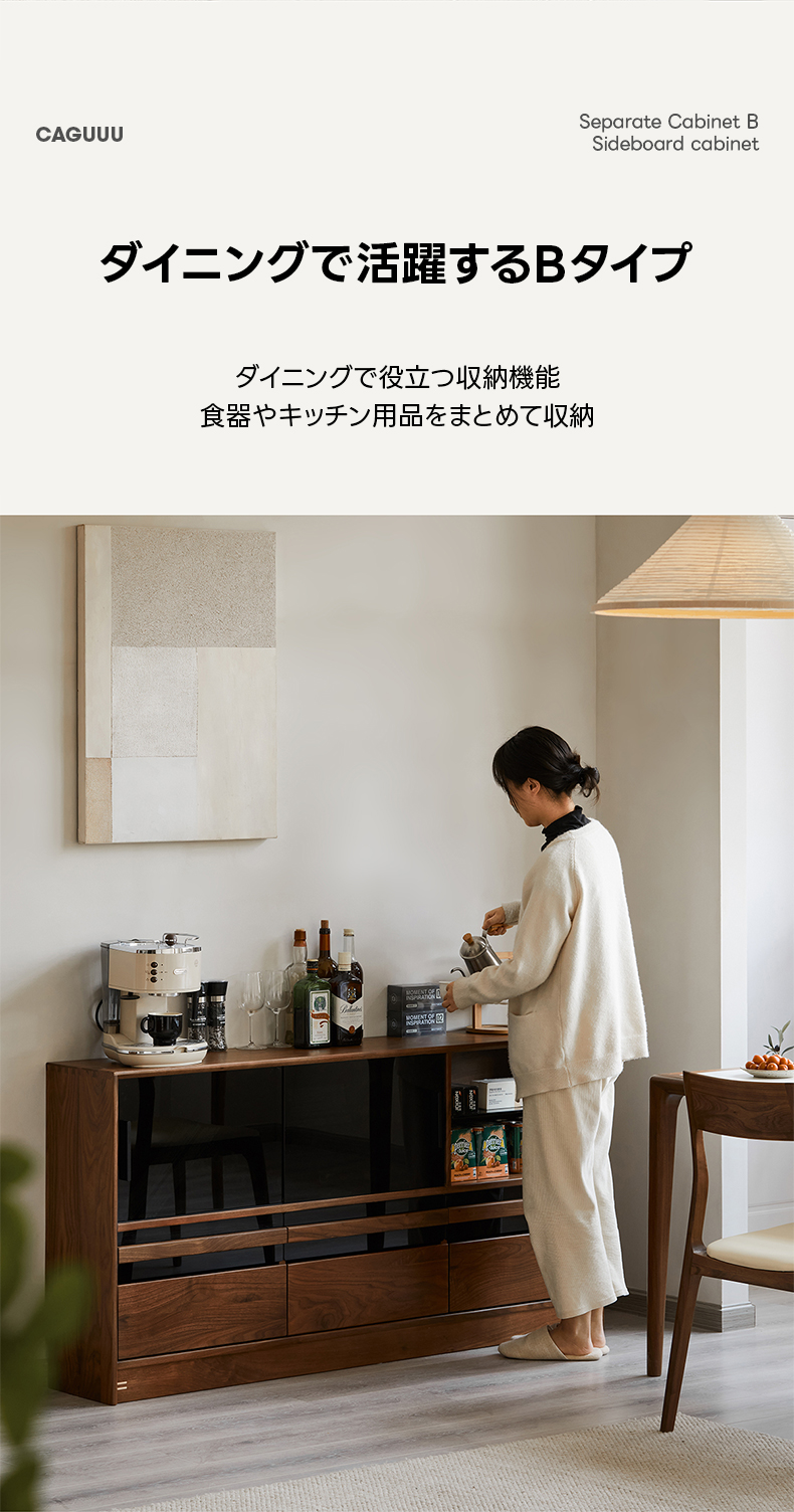 - 【自由な組み合わせと大容量収納】ウォールナット材サイドボードは、2種類のサイズから選べ、シーンに応じて自由に組み合わせが可能です。大容量の引き出しとオープンラックで、リビングやダイニングのアイテムを美しく整理整頓できます。