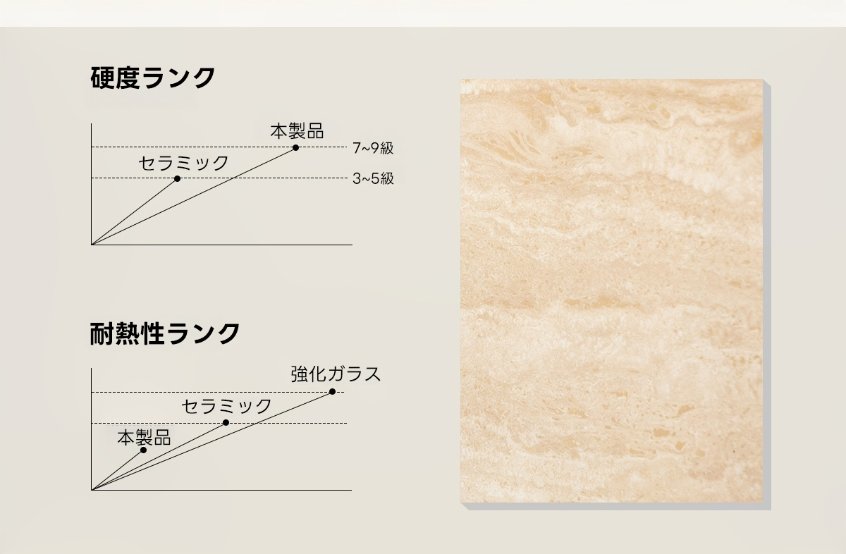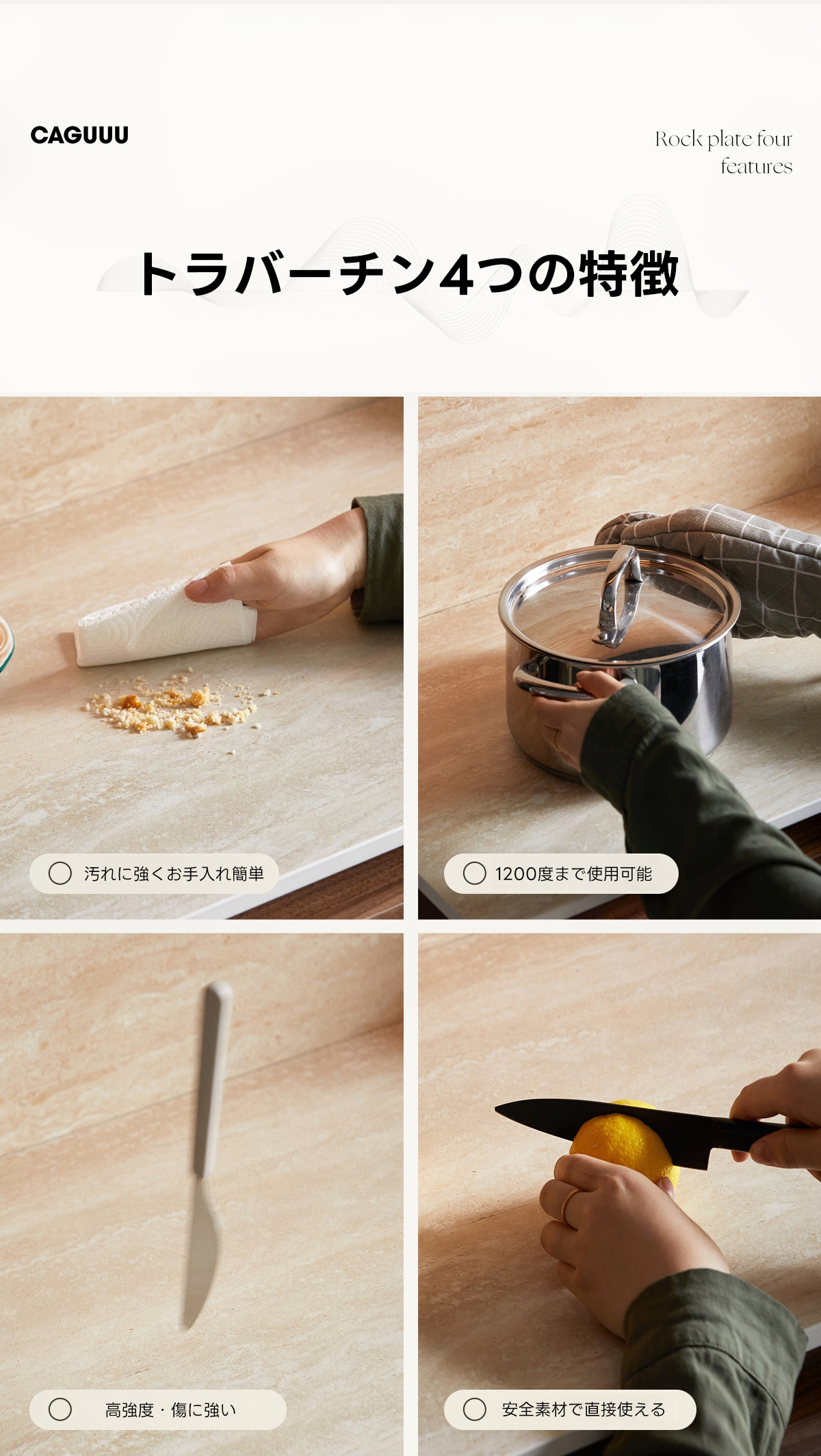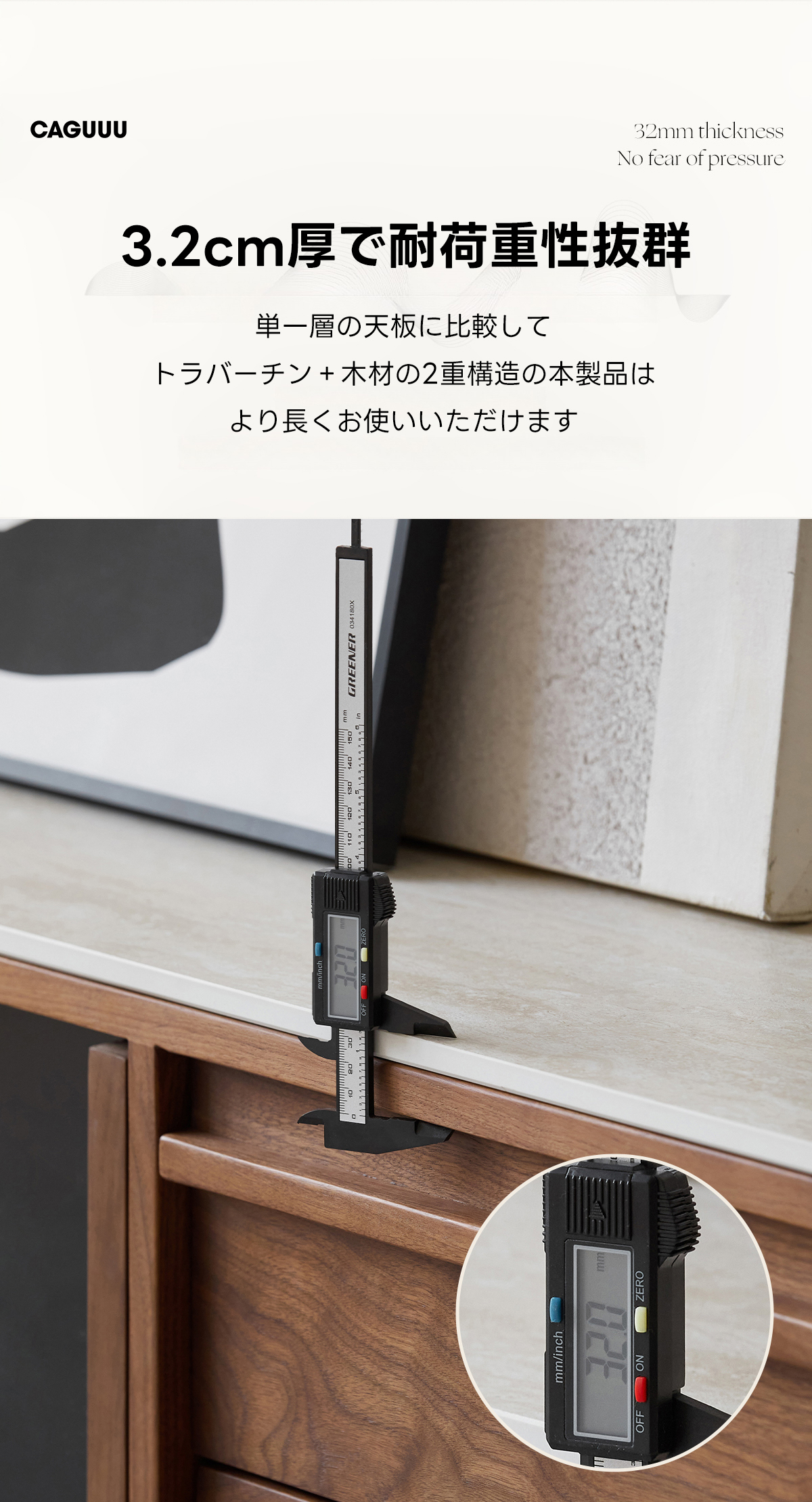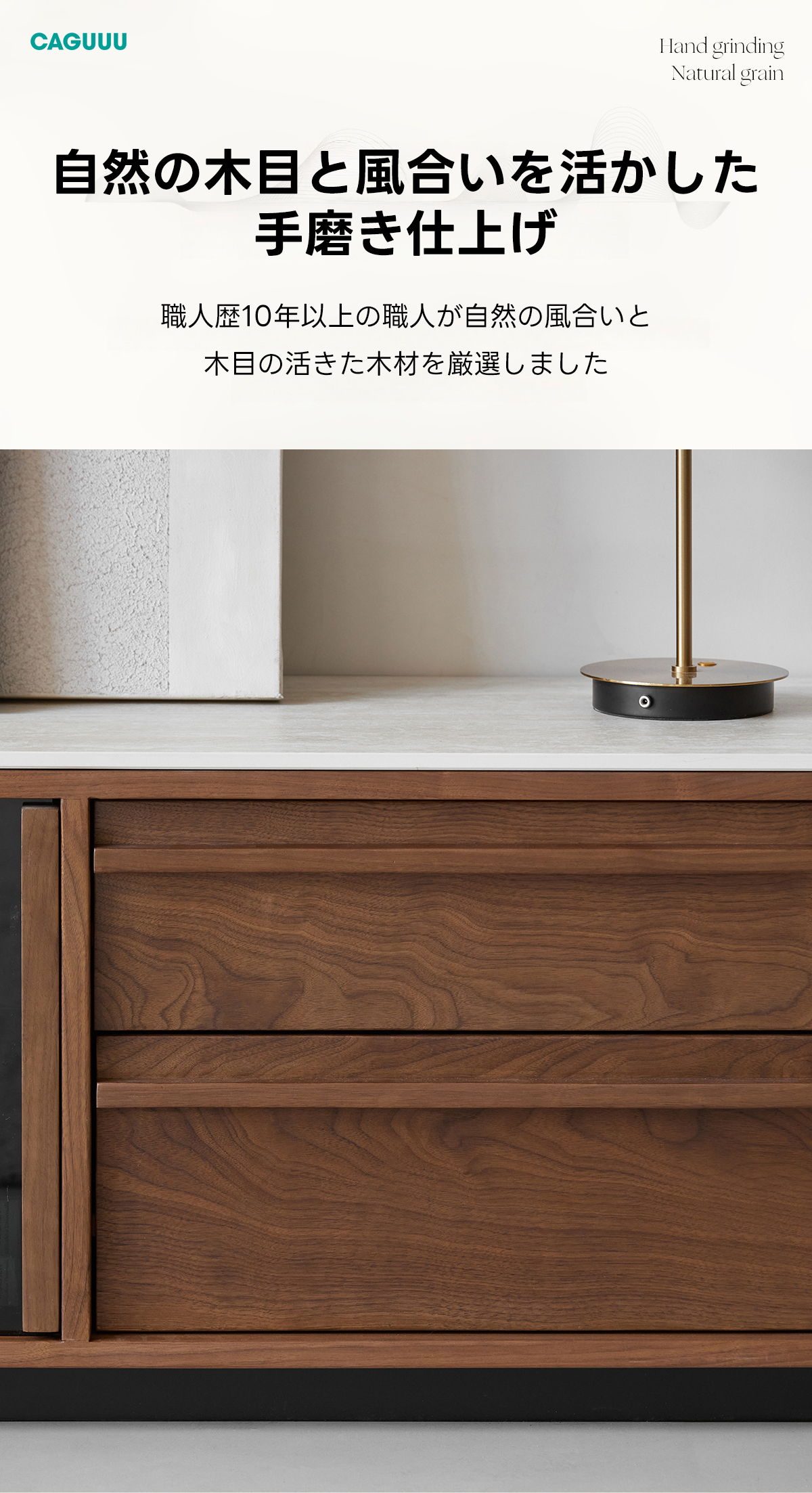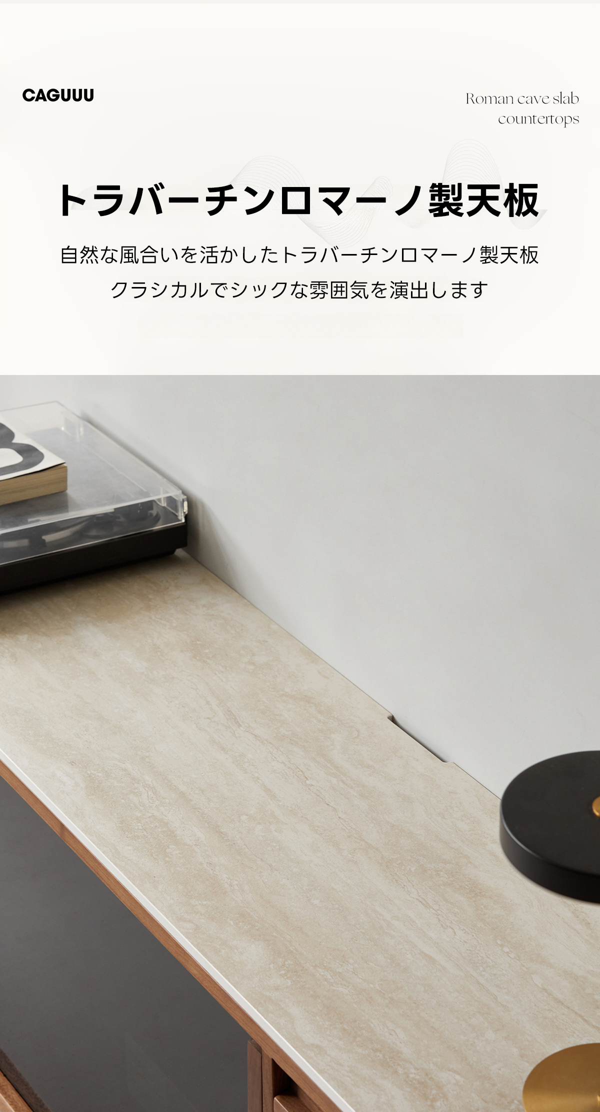 - 【高品質な素材とデザイン】:北米産のFAS級ブラックウォールナットを主材とし、美しい木目と均一な色合いが魅力です。職人による手磨き仕上げにより、自然の風合いを最大限に引き出しています。トラバーチンの天板は、耐熱性が高く、1200度まで使用可能で、傷にも強い特性を持っています。