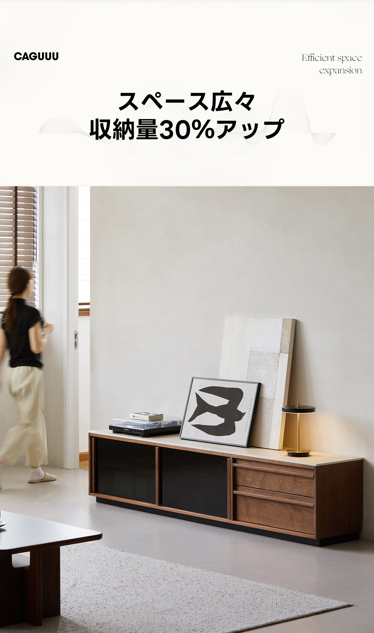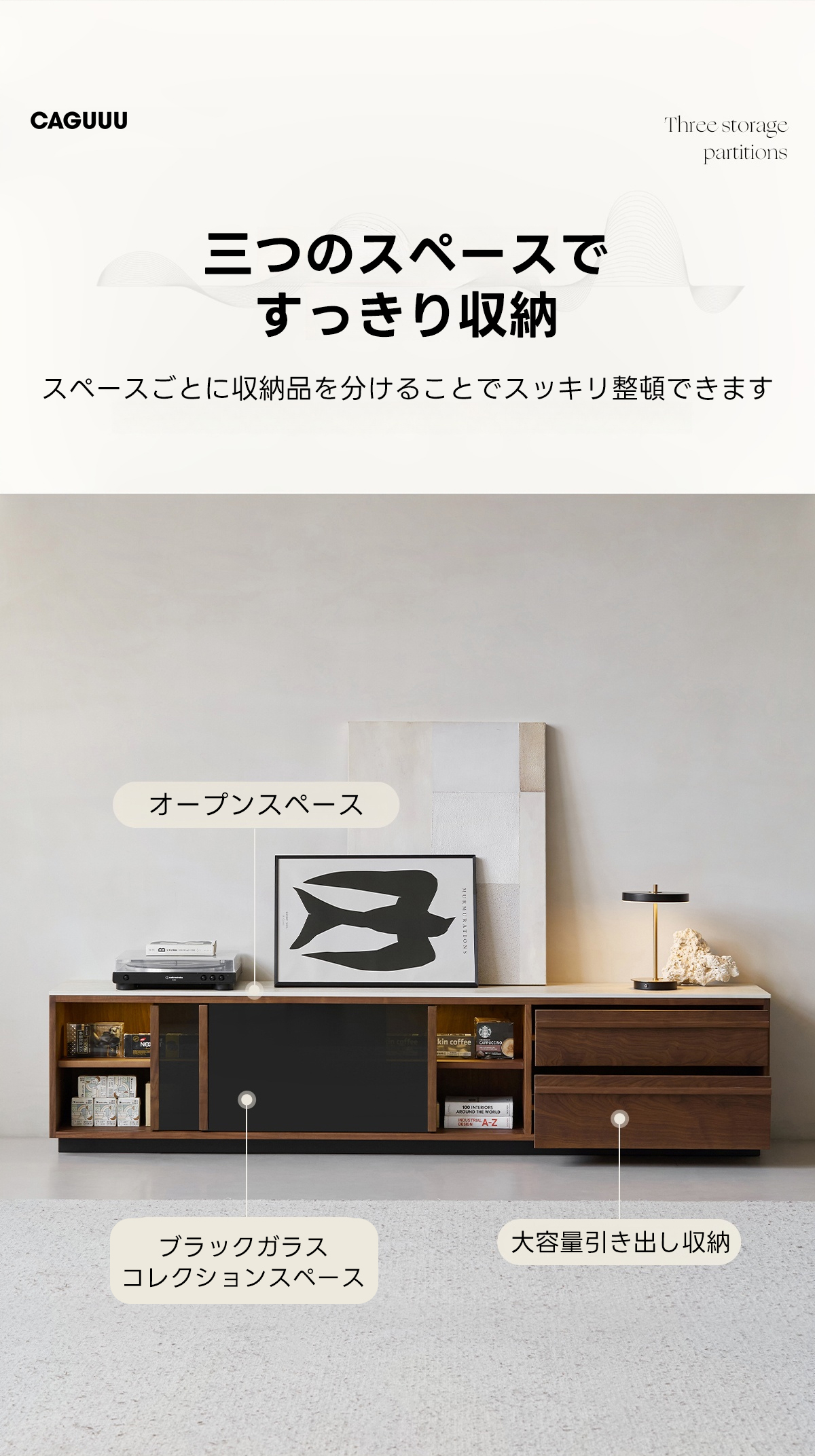 - 【優れた収納力と機能性】:このテレビボードは、大容量の引き出しとスライドタイプの収納スペースを備えており、整理整頓が簡単に行えます。3つの異なる収納スペースにより、効率的なスペース利用が可能です。さらに、ブラックガラスを使用した収納スペースは、視覚的にすっきりとした印象を与えます。