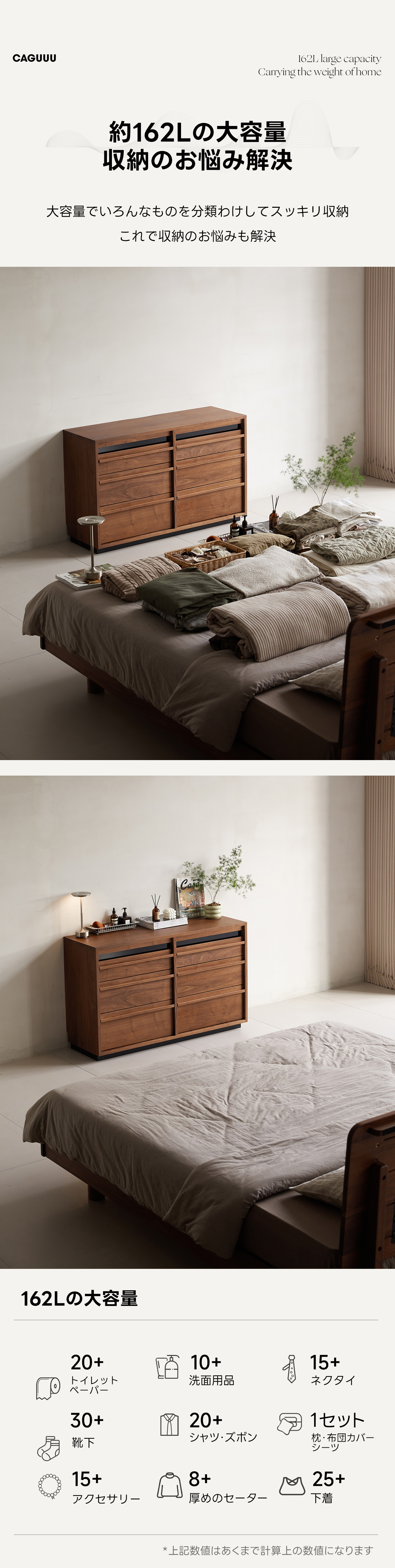 - 【優れた収納力】:約162Lの大容量で、衣類や小物をすっきりと収納可能。三段六杯の引き出しは、異なるサイズのアイテムを効率的に整理整頓できます。
