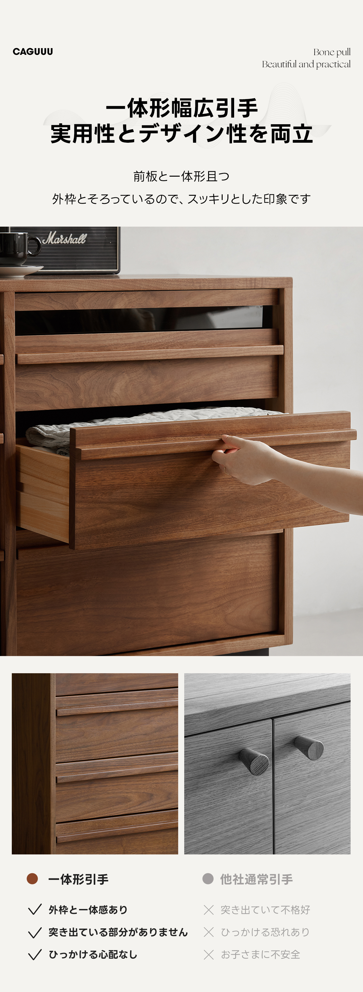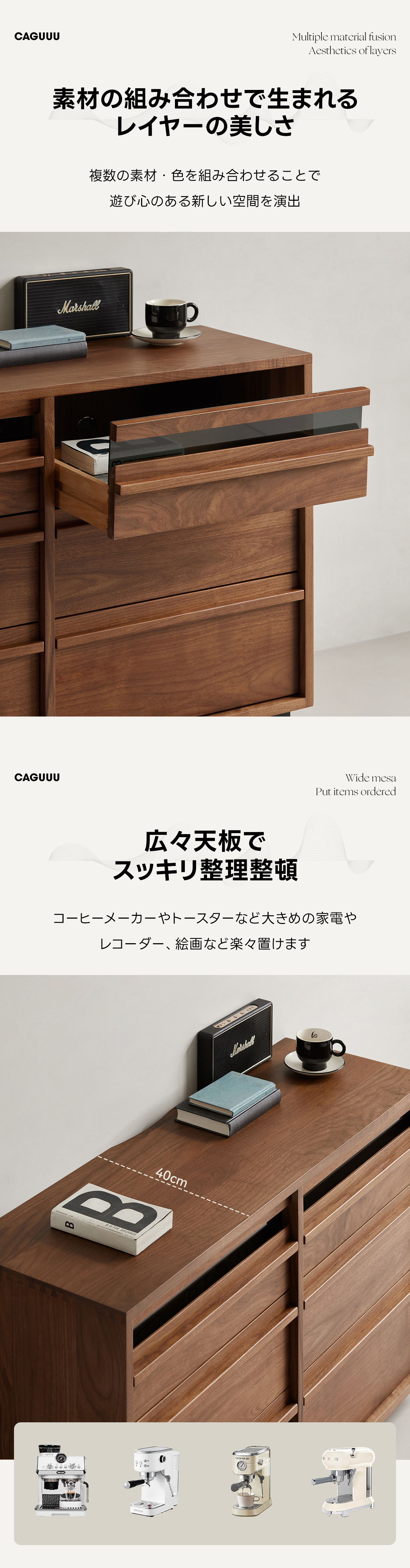 - 【使いやすさと機能性】:一体型幅広引手で開閉がスムーズ。広々とした天板は、コーヒーメーカーやレコードプレーヤーなどの家電を楽々置けます。