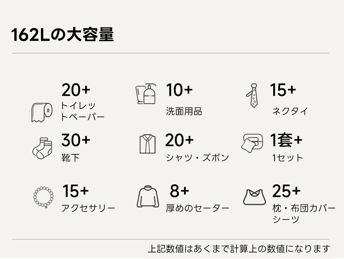 - 【優れた収納力】:約162Lの大容量で、衣類や小物をすっきりと収納可能。三段六杯の引き出しは、異なるサイズのアイテムを効率的に整理整頓できます。