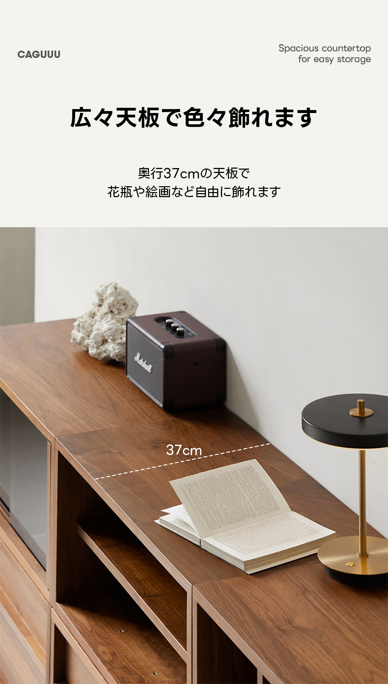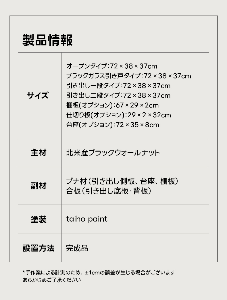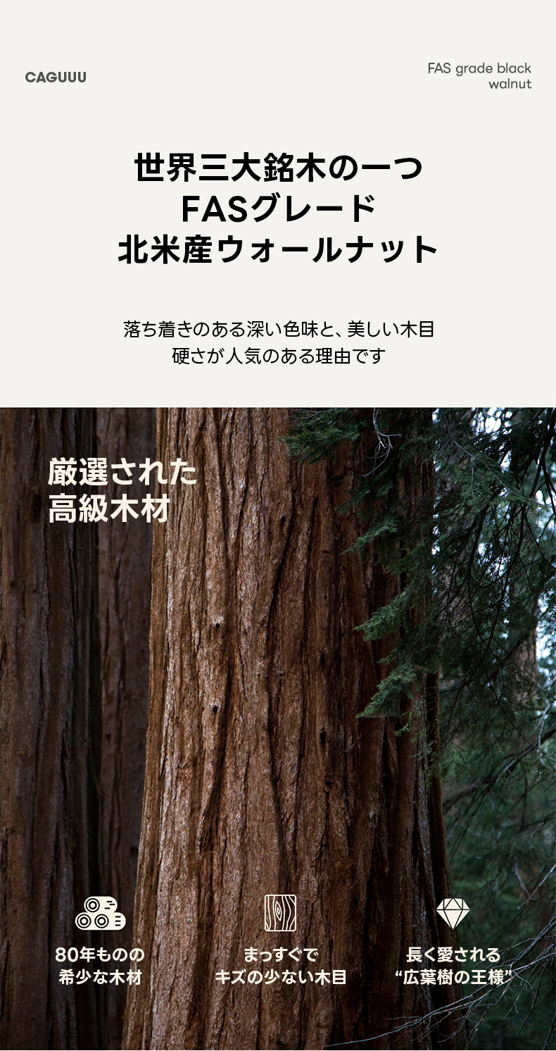 - 【高品質な素材とデザイン】:北米産のFASグレードブラックウォールナット材を使用し、職人が丁寧に加工しています。耐荷重テストをクリアし、安心して使用できる設計です。シックなブラックガラスとウォールナットの組み合わせが、部屋の雰囲気を一層引き立てます。