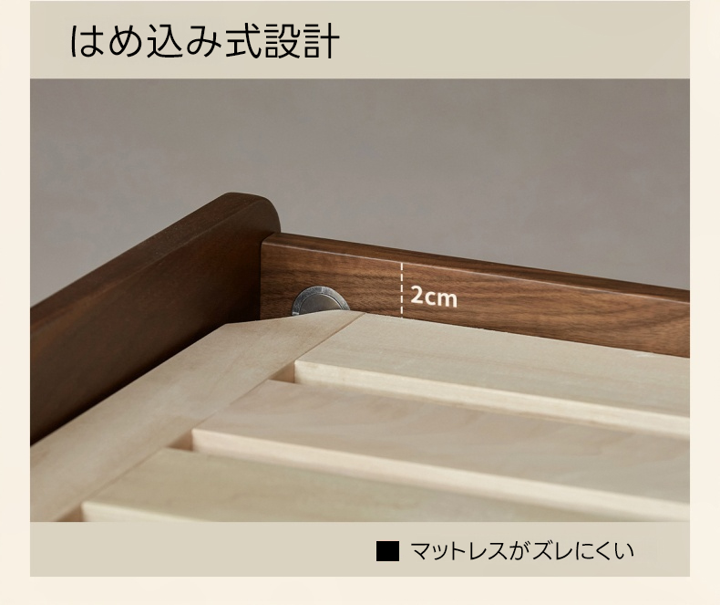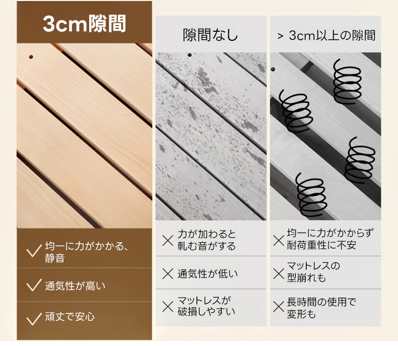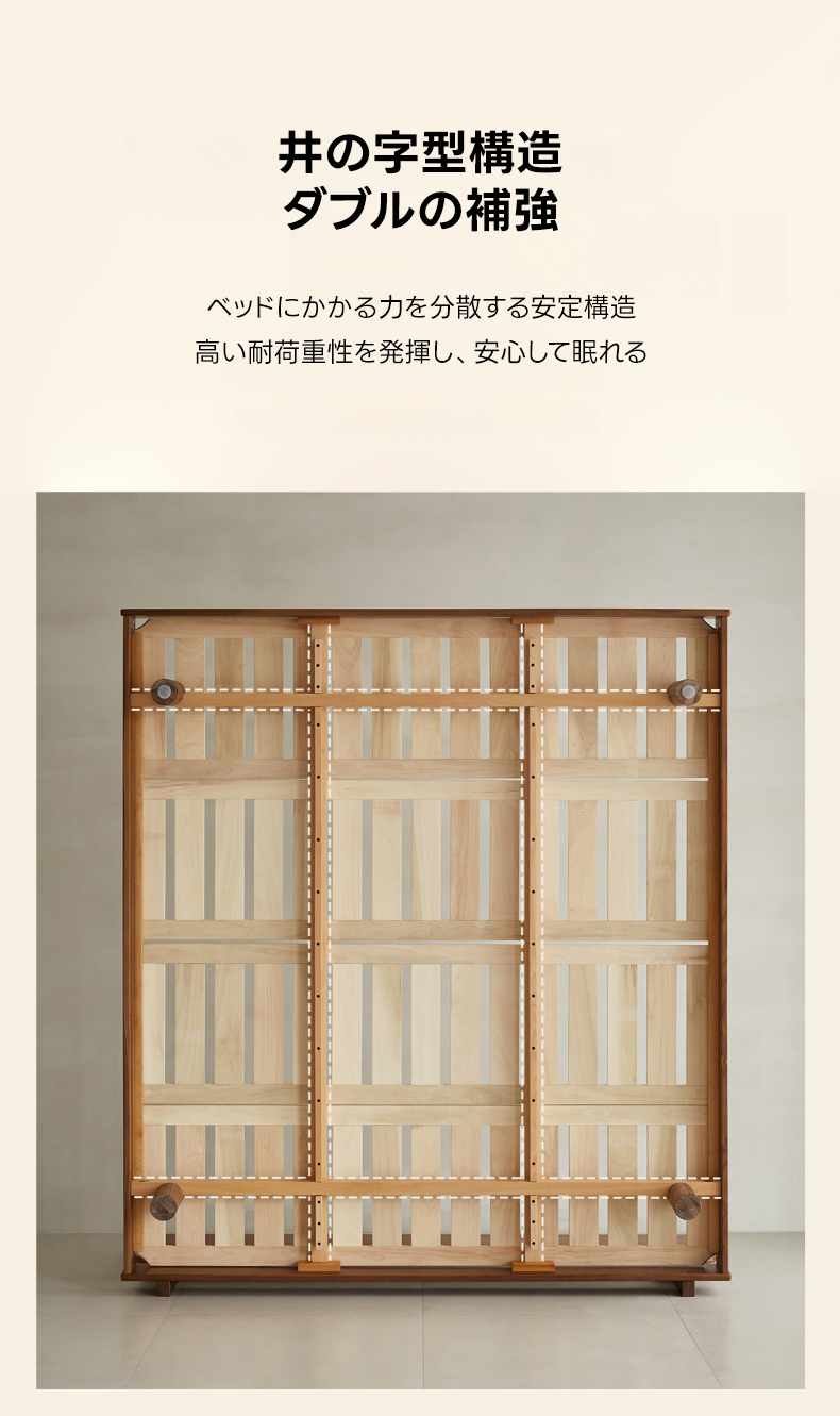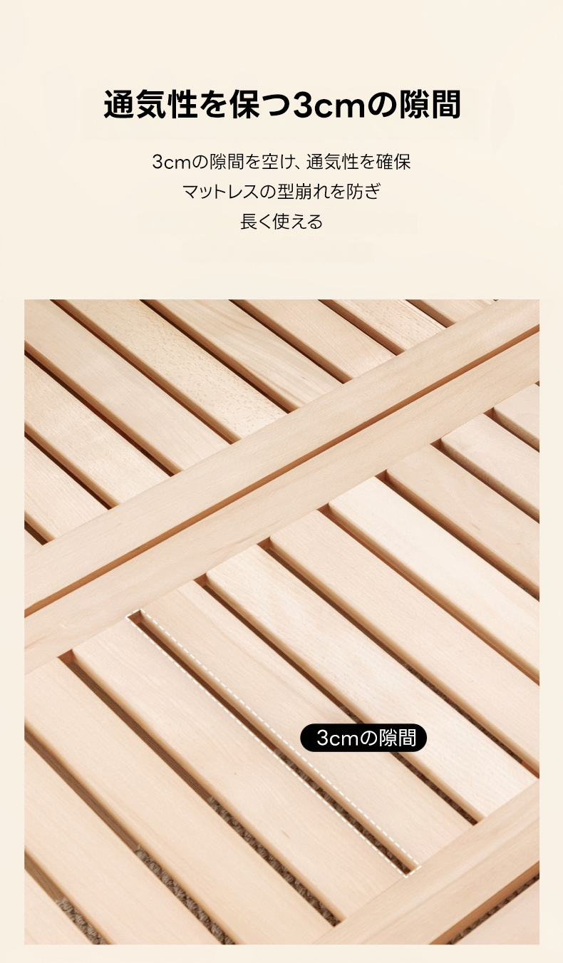 - 【環境に優しい仕上がり】健康・環境に優しいニスを使用し、化学物質を含まない安心・安全な仕上がり。通気性を保つ3cmの隙間があり、マットレスの型崩れを防ぎます。