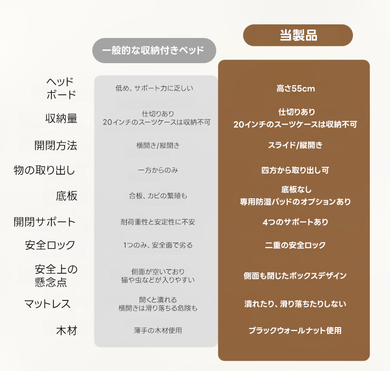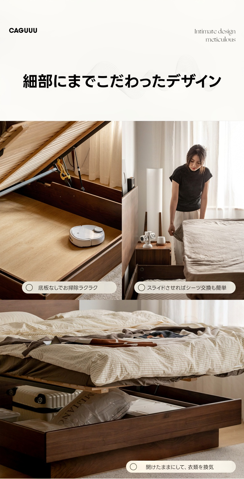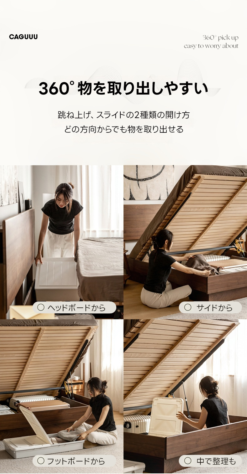 - 【大容量収納&360°アクセス】このベッドは、ワードローブ以上の収納力を持ち、衣類や布団、スーツケースなどをすっきり収納可能。ヘッドボード、サイド、フットボードからアクセスでき、どの方向からでも物を取り出せます。