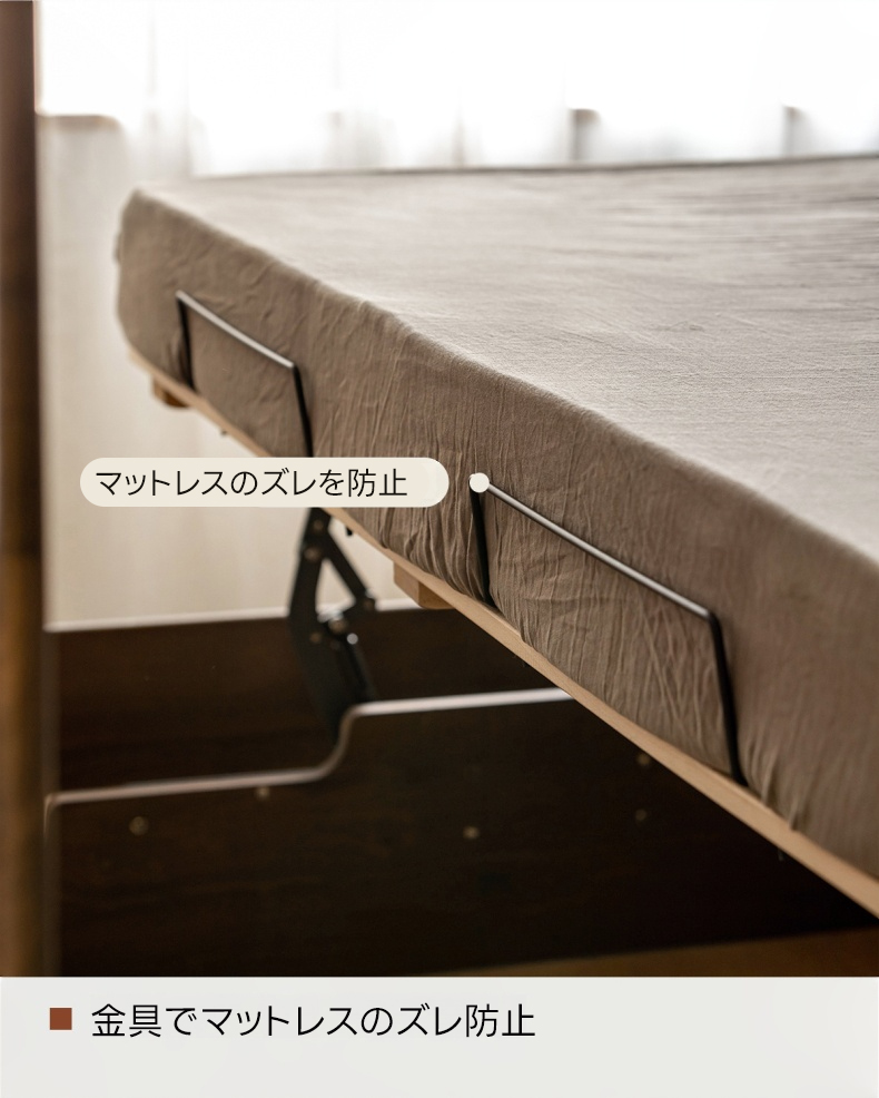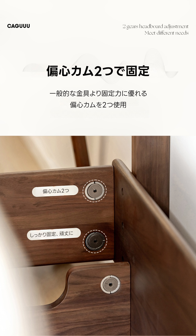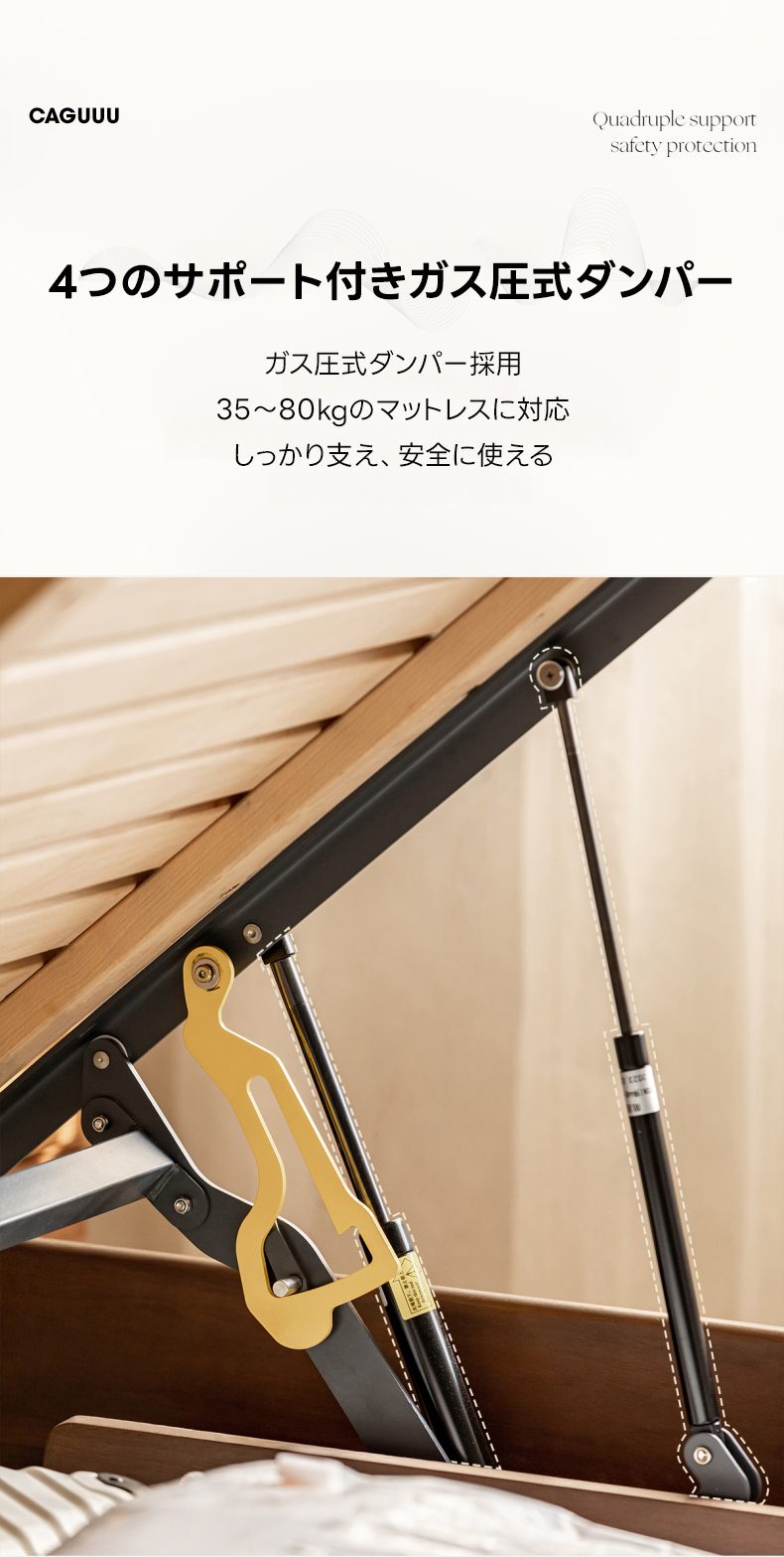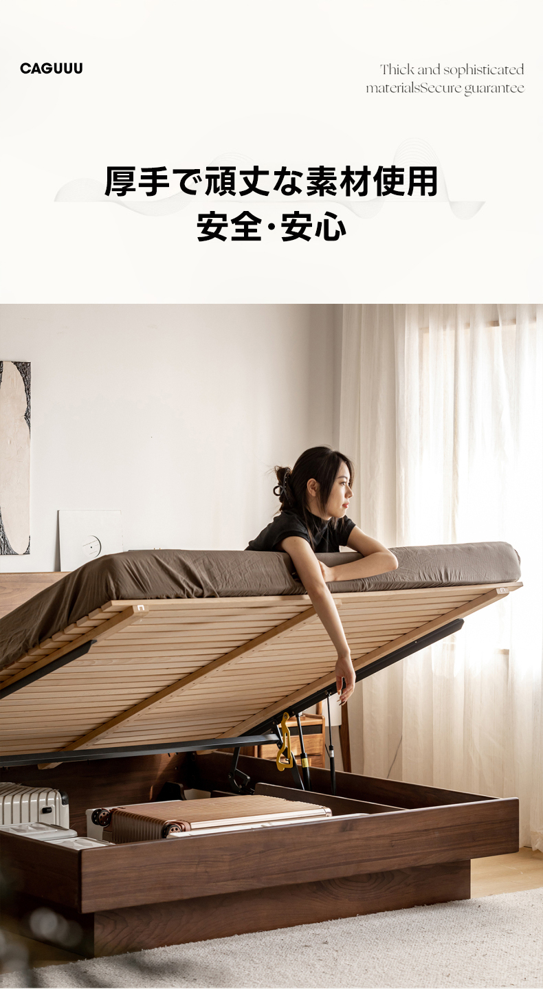 - 【高品質な材料とデザイン】北米産FAS級ブラックウォールナット材を使用し、美しい木目と温かみのある手触りが特徴。頑丈な構造で、ガス圧式ダンパーと4つのサポートにより、35〜80kgのマットレスをしっかり支えます。
