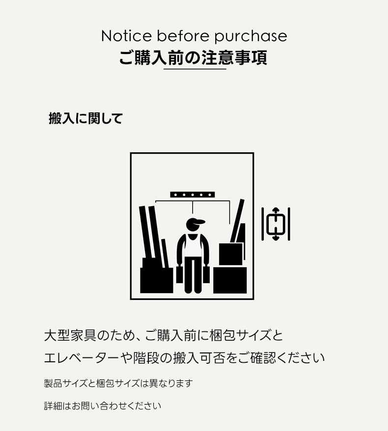 ※搬入不可等の理由による注文キャンセルは、ご返送にかかる費用をお客様にご請求いたします。ご注文前に大型家具の搬入方法をご確認ください。