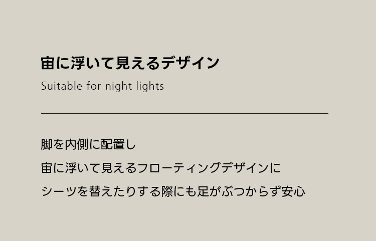 - 【フローティングデザインで広々空間】:足を内側に配置したフローティングデザインにより、シーツを替える際に足がぶつからず、安心して使用できます。空間を広く見せる効果もあり、寝室をスタイリッシュに演出します。