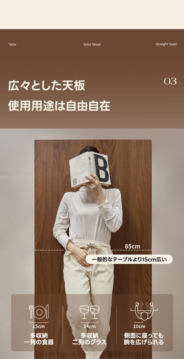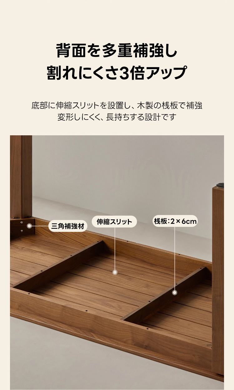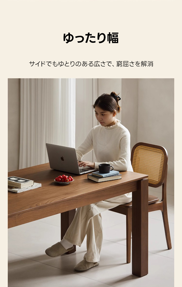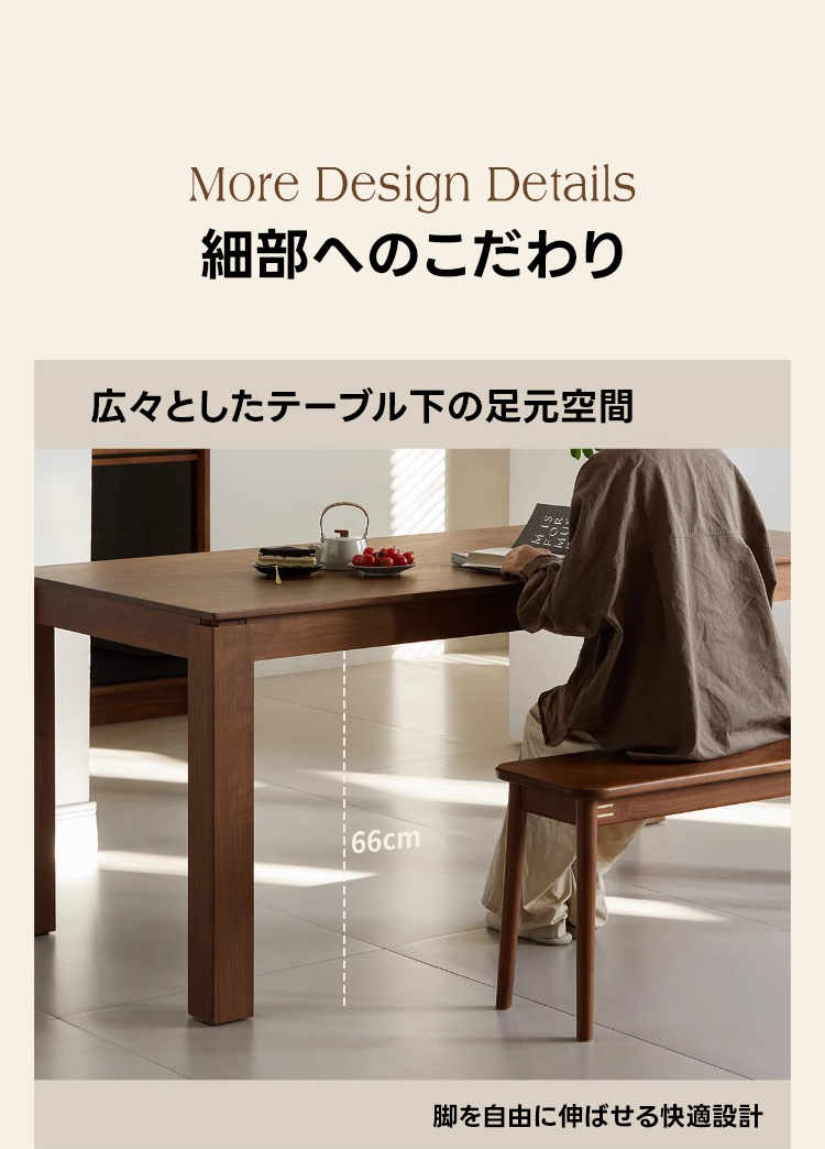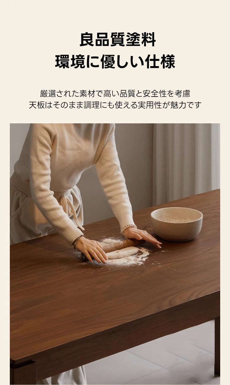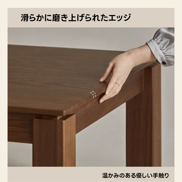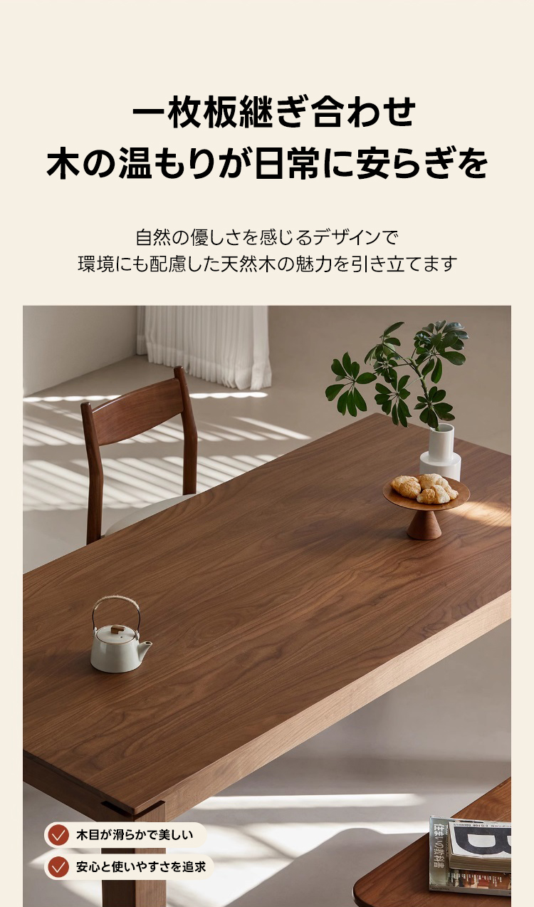 - 【ナチュラルな美しさ】:ウォールナット材の落ち着いた深みのある色合いと美しい木目が、リビングやダイニングに自然なアクセントを加えます。どんなインテリアにもマッチするナチュラルなベージュの色合いです。