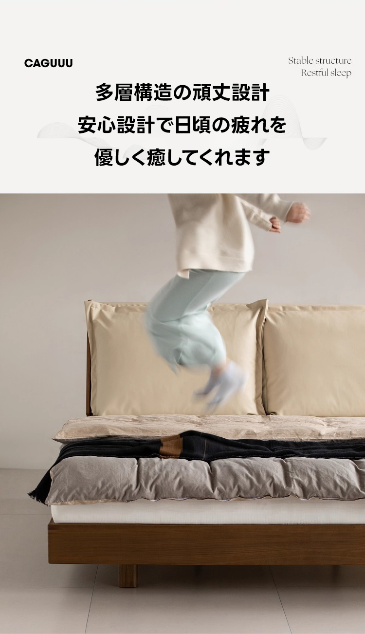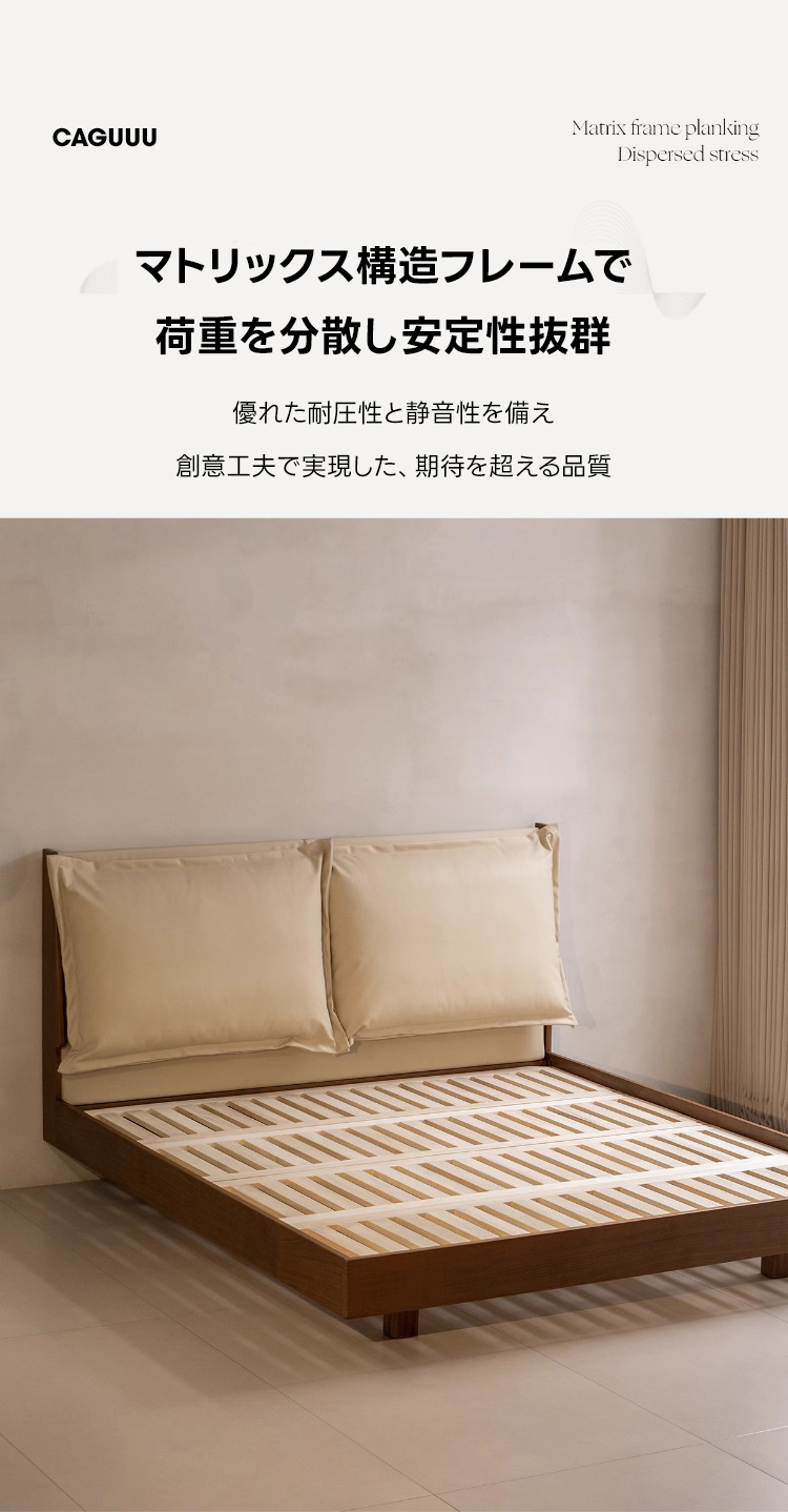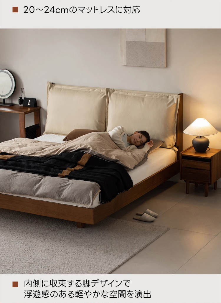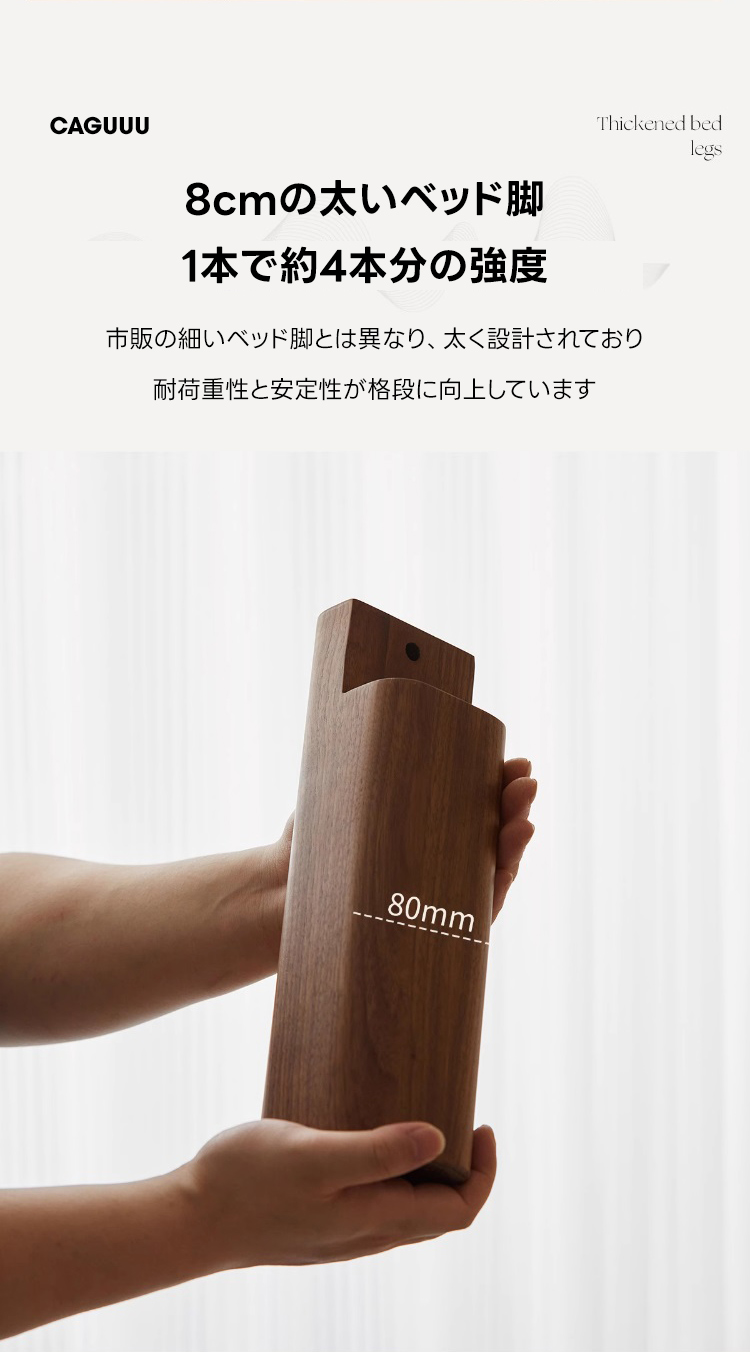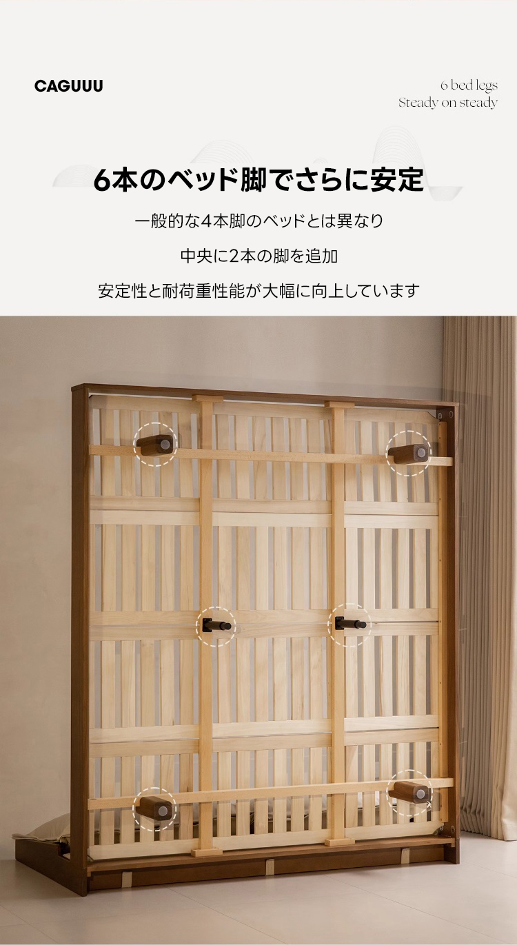 - 【厳選された素材と優れた構造】:フレームには北米産ブラックウォールナット材を使用し、耐久性と美しさを兼ね備えています。サイドフレームは2.1cmの厚みがあり、耐圧性が高く、安定感抜群です。6本の頑丈なベッド脚で、一般的な4本脚のベッドよりも安定性が向上しています。