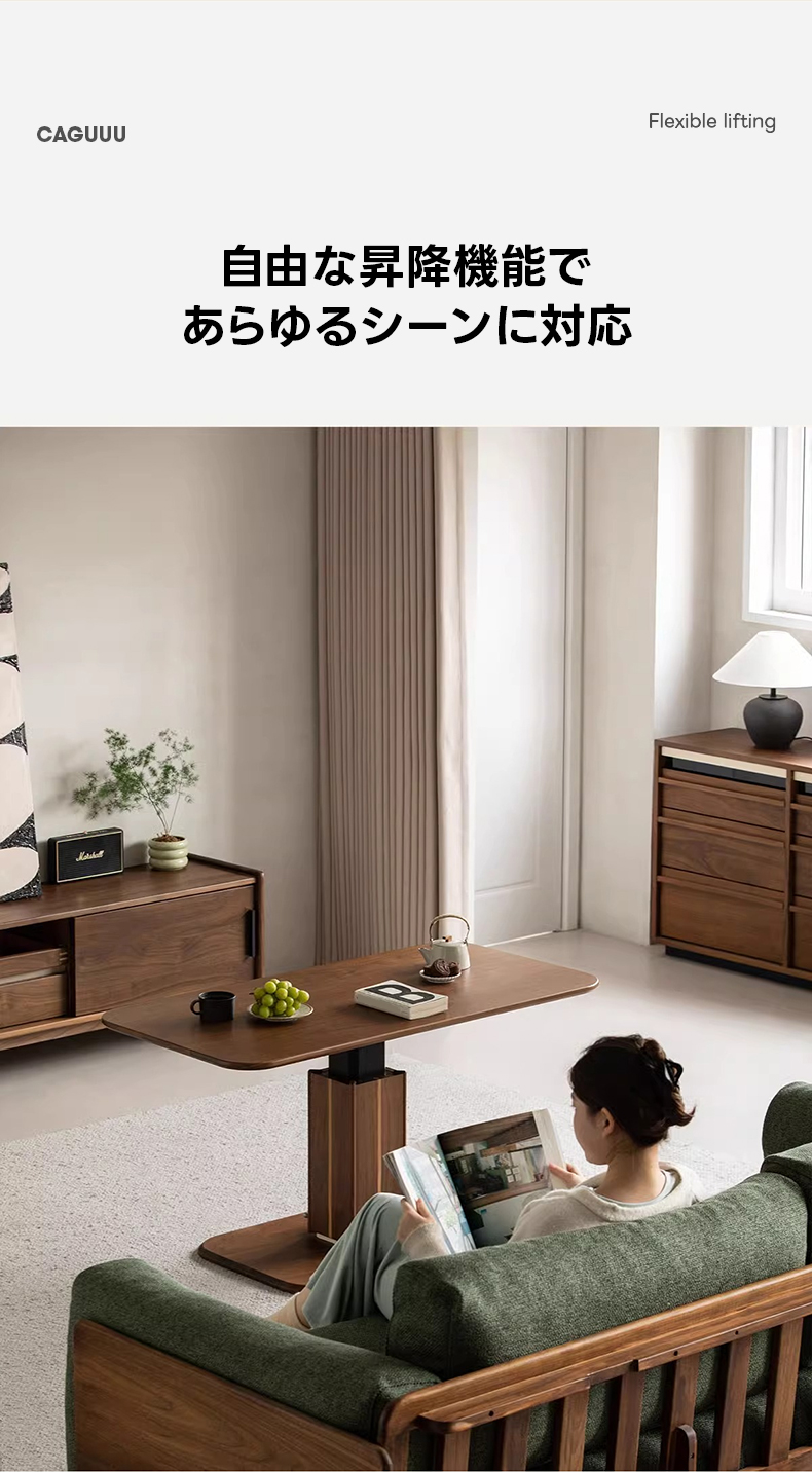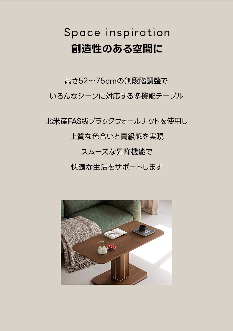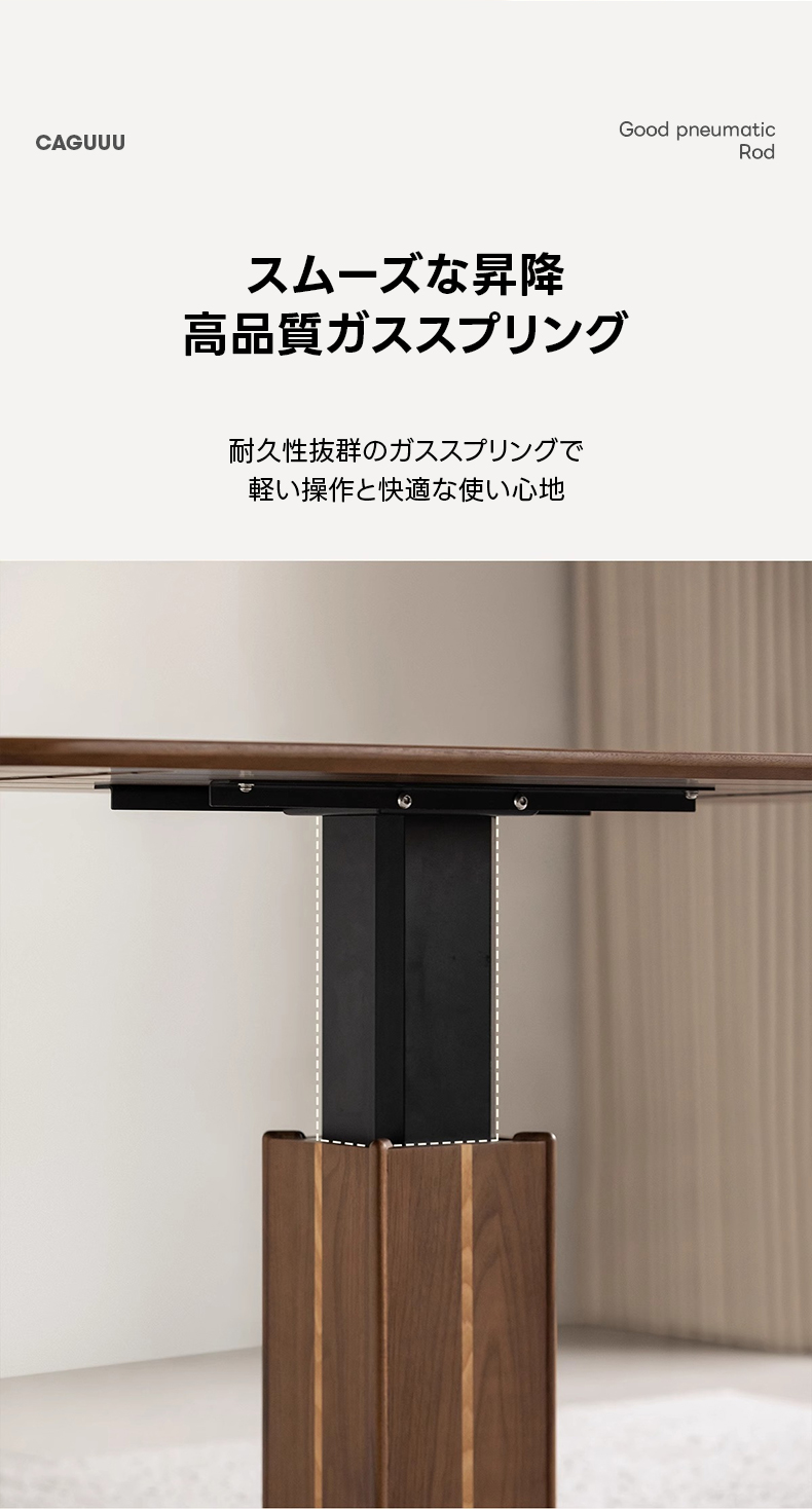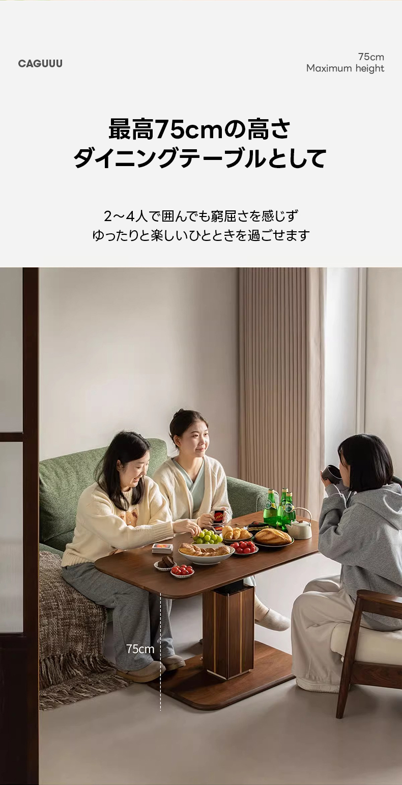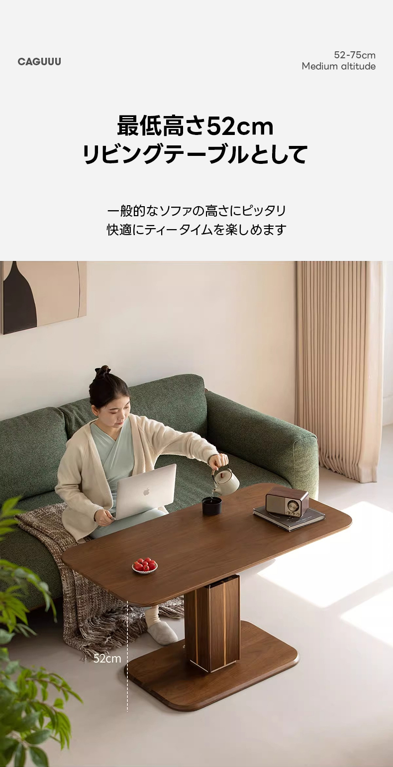 - 【多用途昇降機能】このリビングテーブルは、スムーズなガススプリング機構を搭載し、高さを52cmから75cmまで無段階で調整可能です。リビングテーブルとしてもダイニングテーブルとしても使用でき、様々なシーンで活躍します。