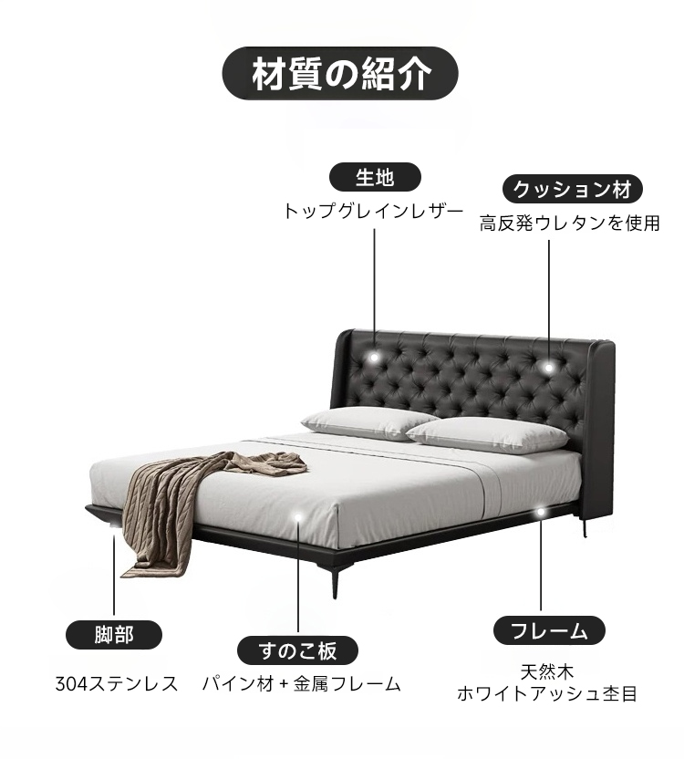 - 【安心のアフターサービス】このベッドは、耐久性抜群で長期間使用してもへたりにくい設計です。お客様の満足を第一に考え、安心してご使用いただけるよう、万全のアフターサービスを提供いたします。