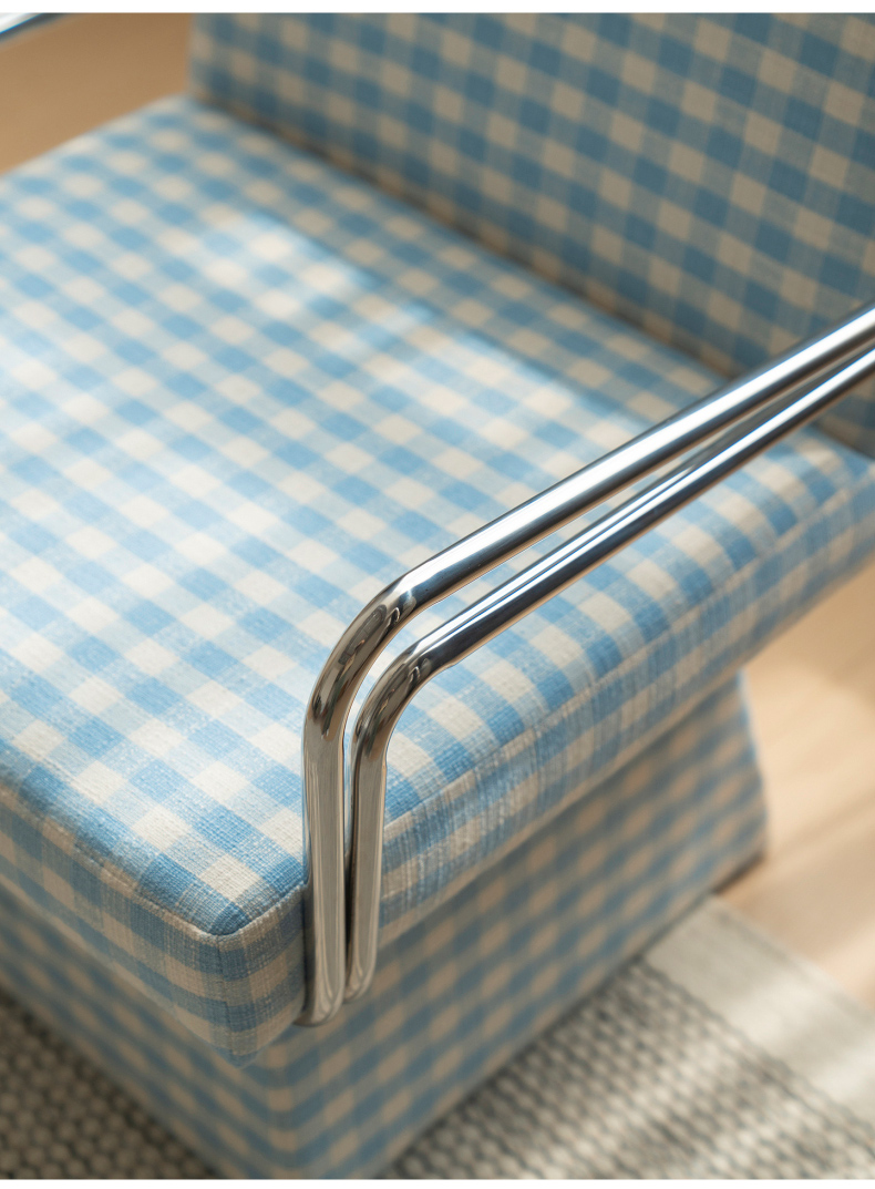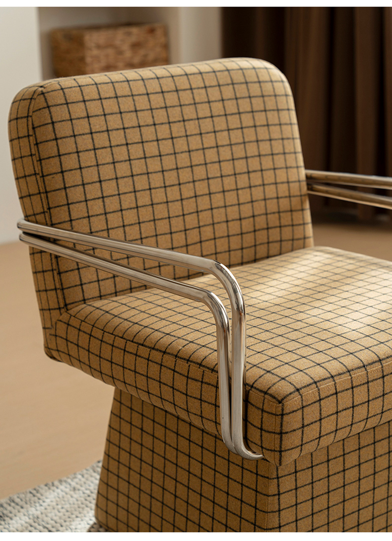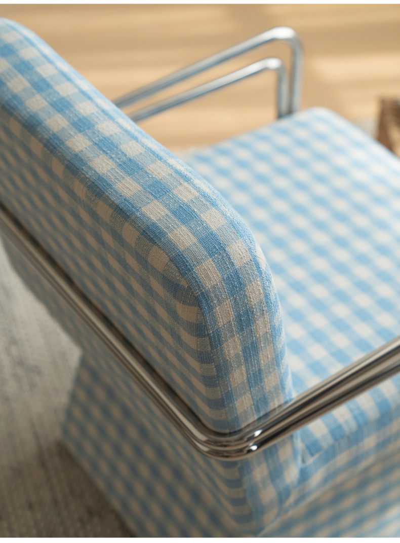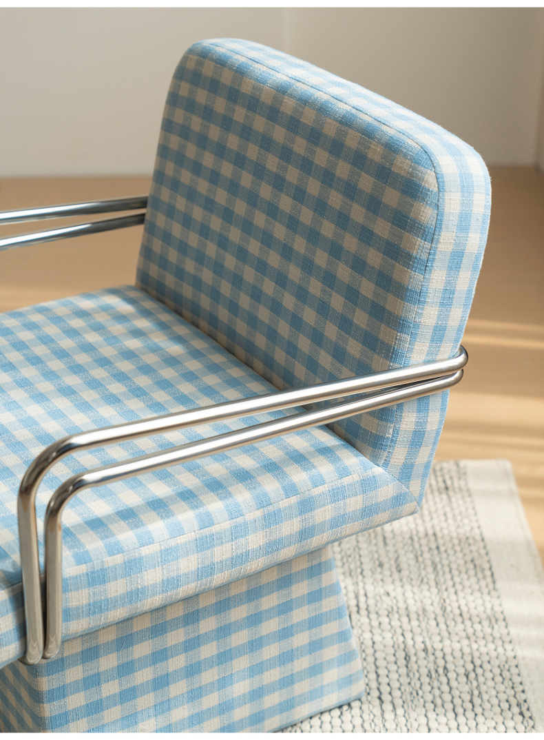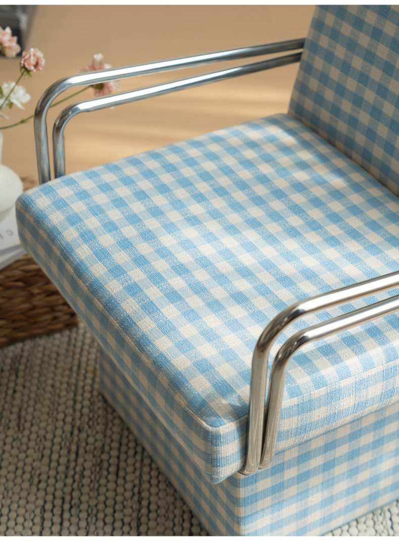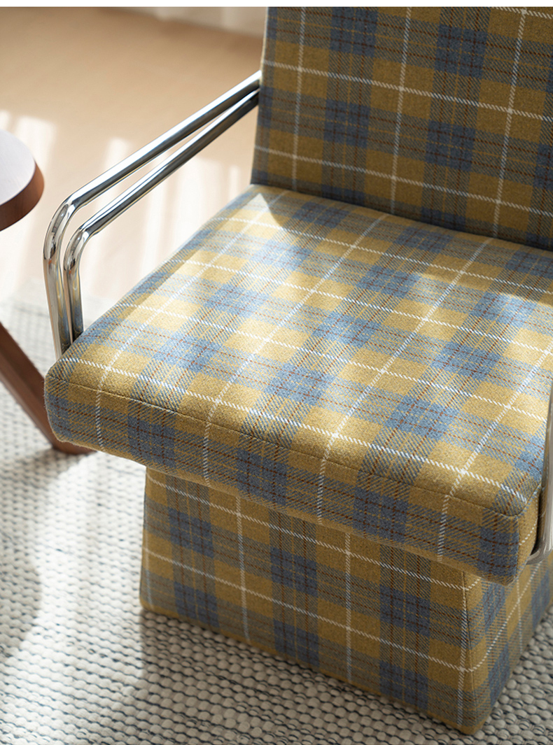 - 【高品質な素材とデザイン】ステンレス製の手すりと積層合板フレームを使用し、耐久性と安定性を兼ね備えています。レトロなチェック柄が施されたファブリックが魅力的です。