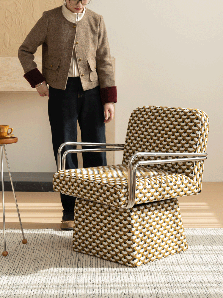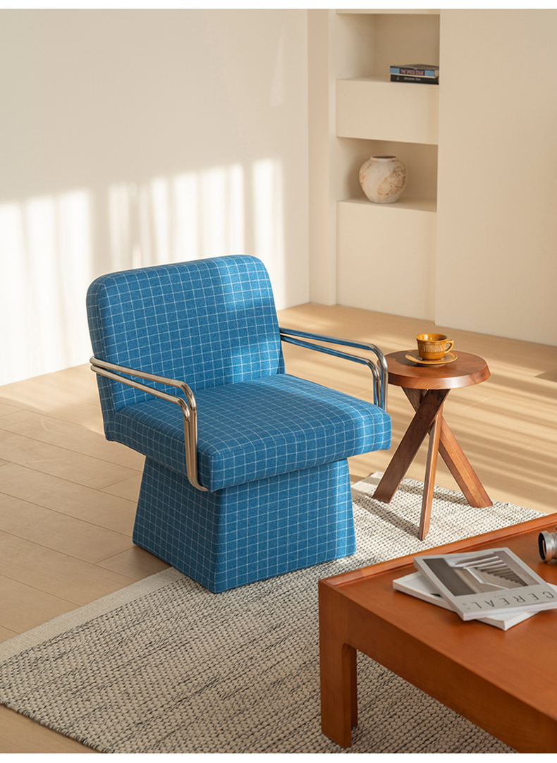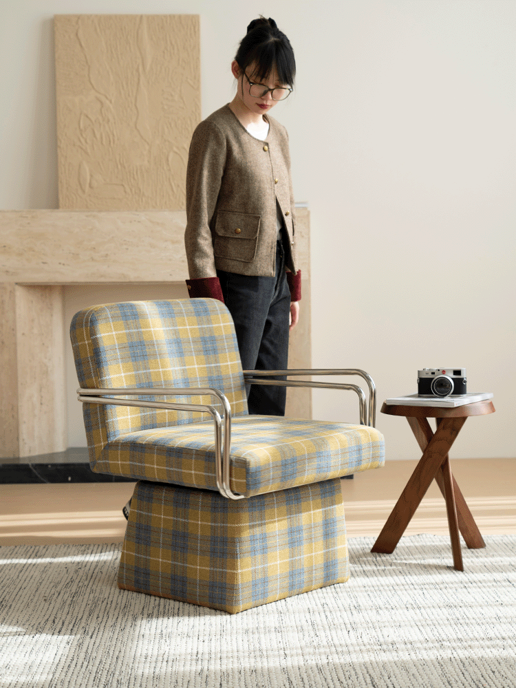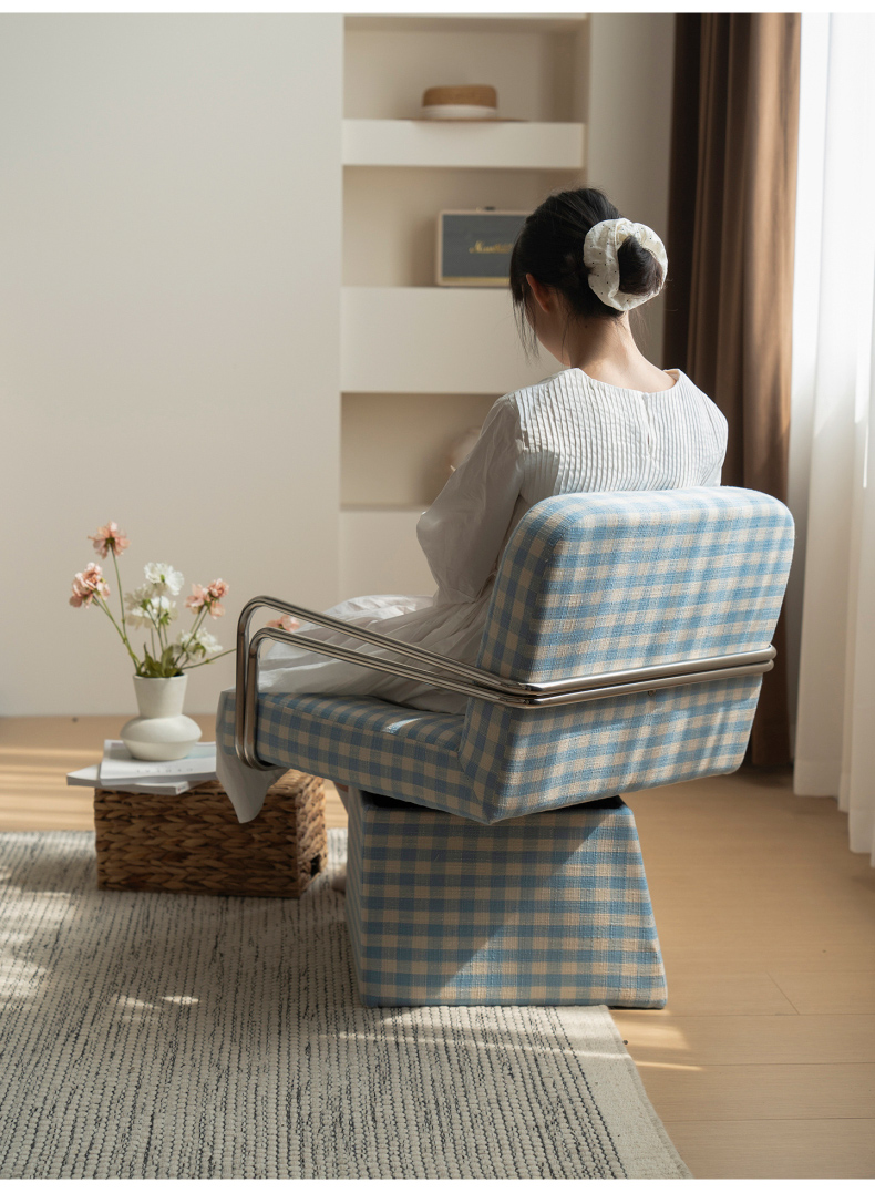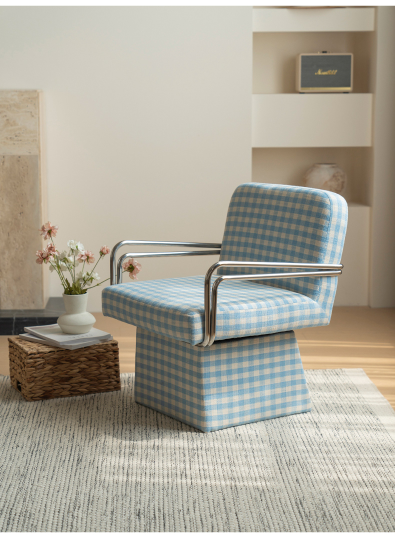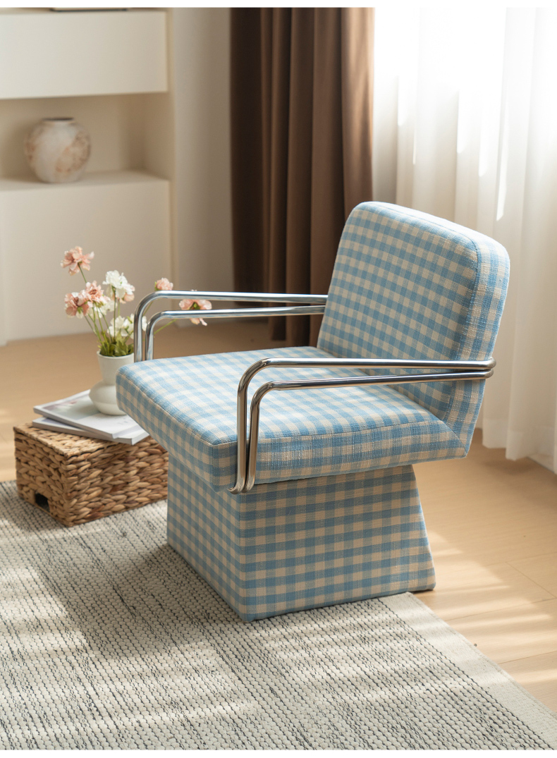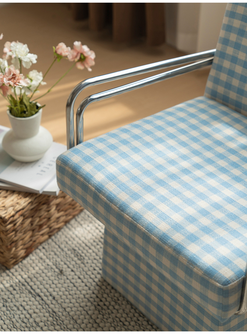 - 【高品質な素材とデザイン】ステンレス製の手すりと積層合板フレームを使用し、耐久性と安定性を兼ね備えています。レトロなチェック柄が施されたファブリックが魅力的です。