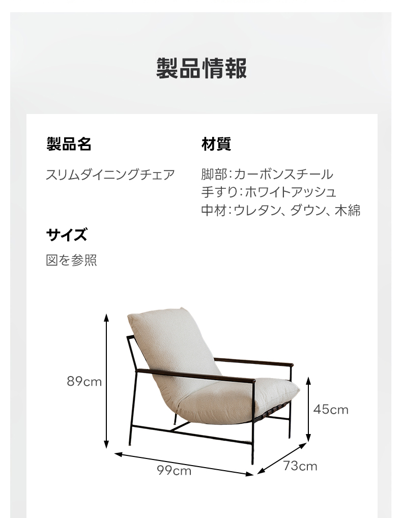 - 【高品質素材】:脚部はカーボンスチール、手すりはホワイトアッシュ、中材にはウレタン、ダウン、木綿を使用し、快適な座り心地を提供します。