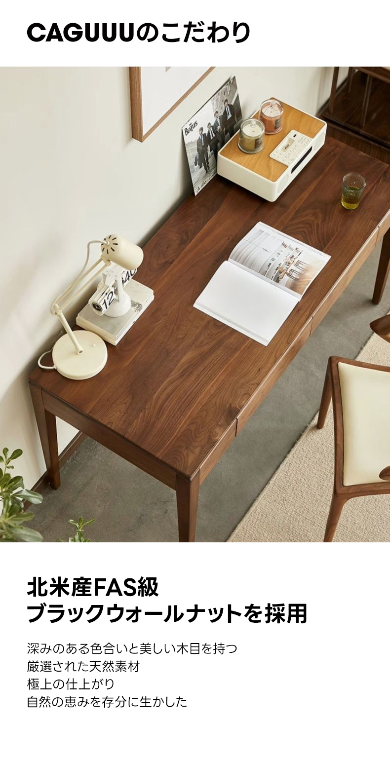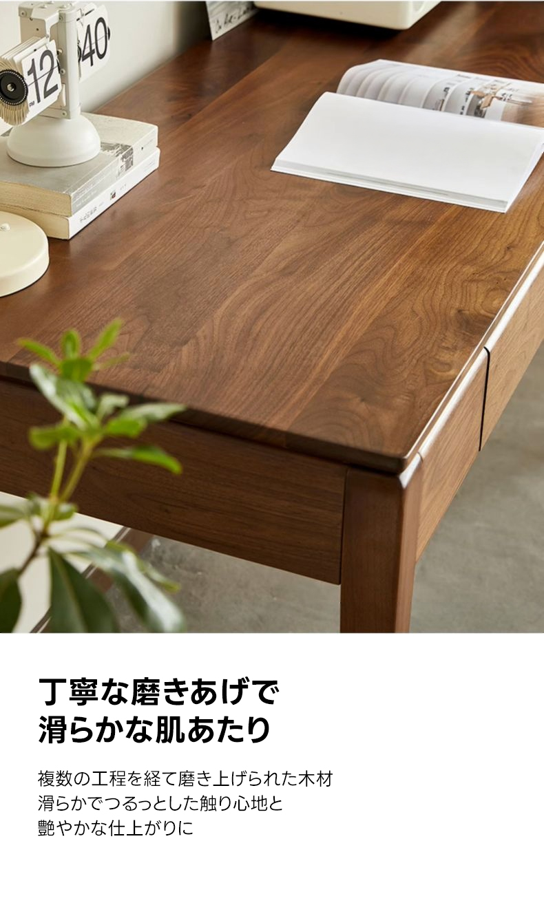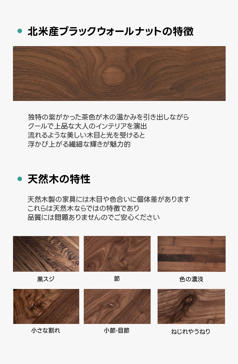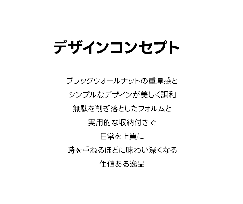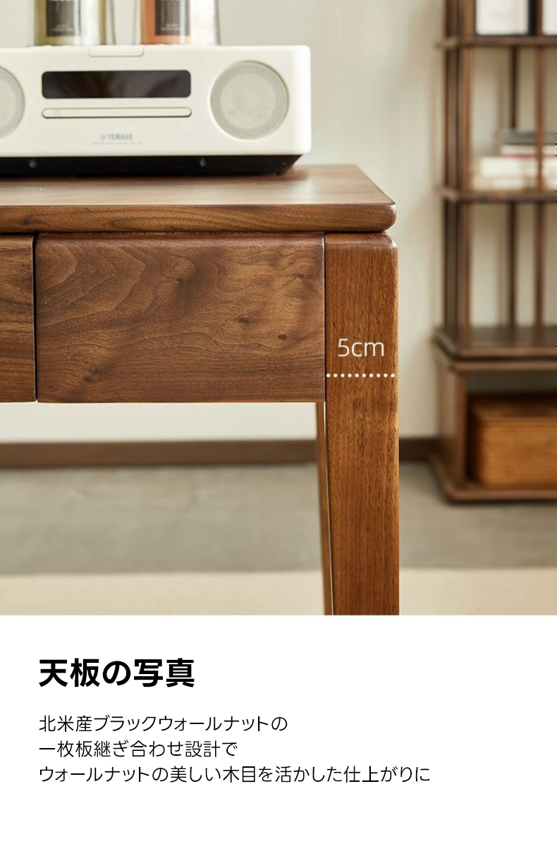 - 【高級ブラックウォールナット材使用】北米産FAS級ブラックウォールナット材を使用し、合板や突板を一切使用しない天然素材の魅力を活かした仕上がりです。美しい木目と深みのある色合いが特徴です。