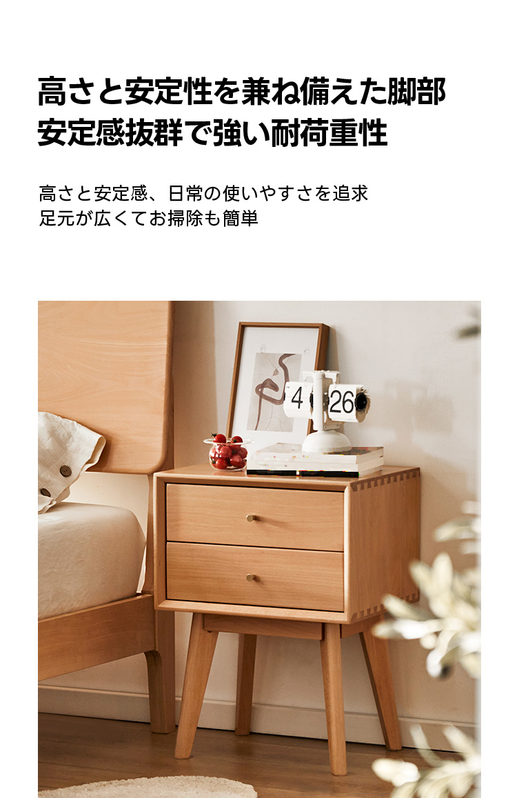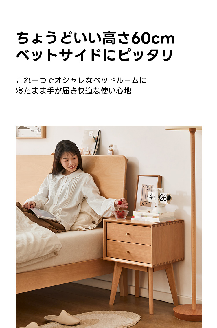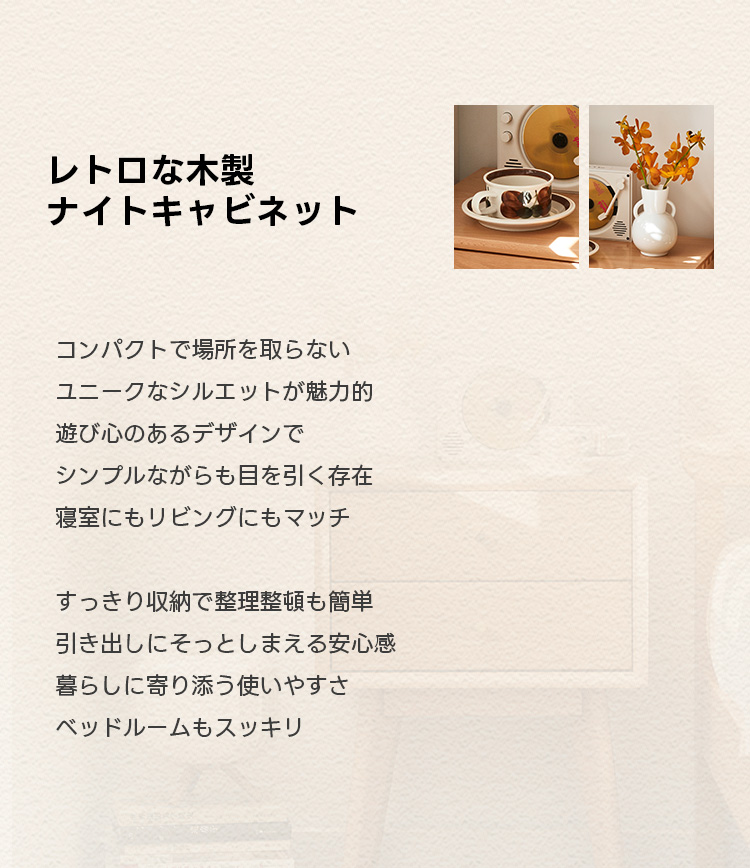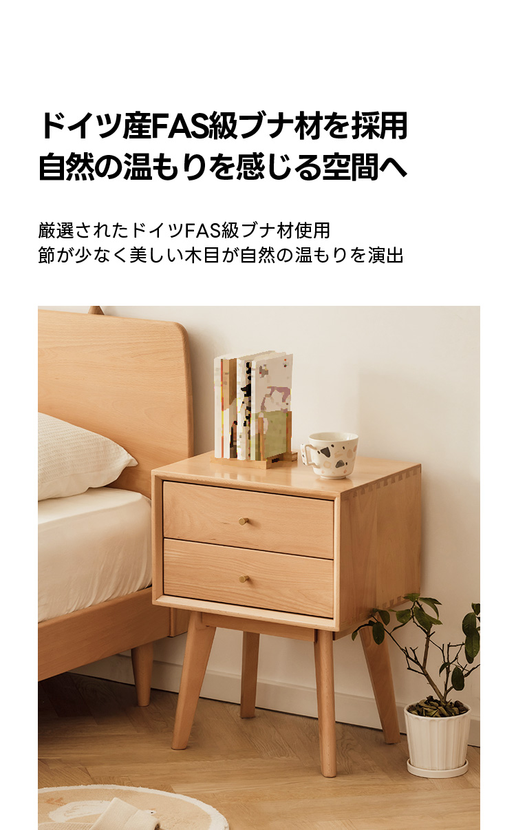 - 【高品質な素材とデザイン】ドイツ産FAS級ブナ材を使用した高品質なナイトキャビネットです。ナチュラルなブラウンカラーがどんなインテリアにも自然に溶け込み、レトロなデザインが寝室をおしゃれに演出します。