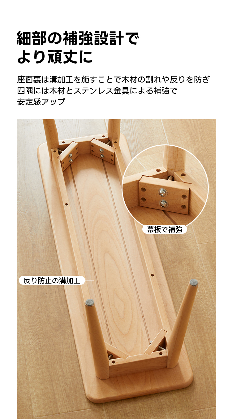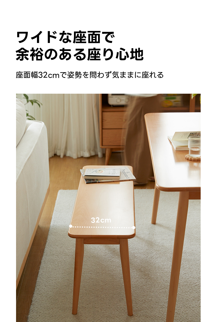 - 【快適な座り心地】座面の幅は32cmで、厚さ20mmのしっかりとした木材が使用されており、安定感のある座り心地を提供します。エッジは丸く滑らかに仕上げられており、安全性も考慮されています。