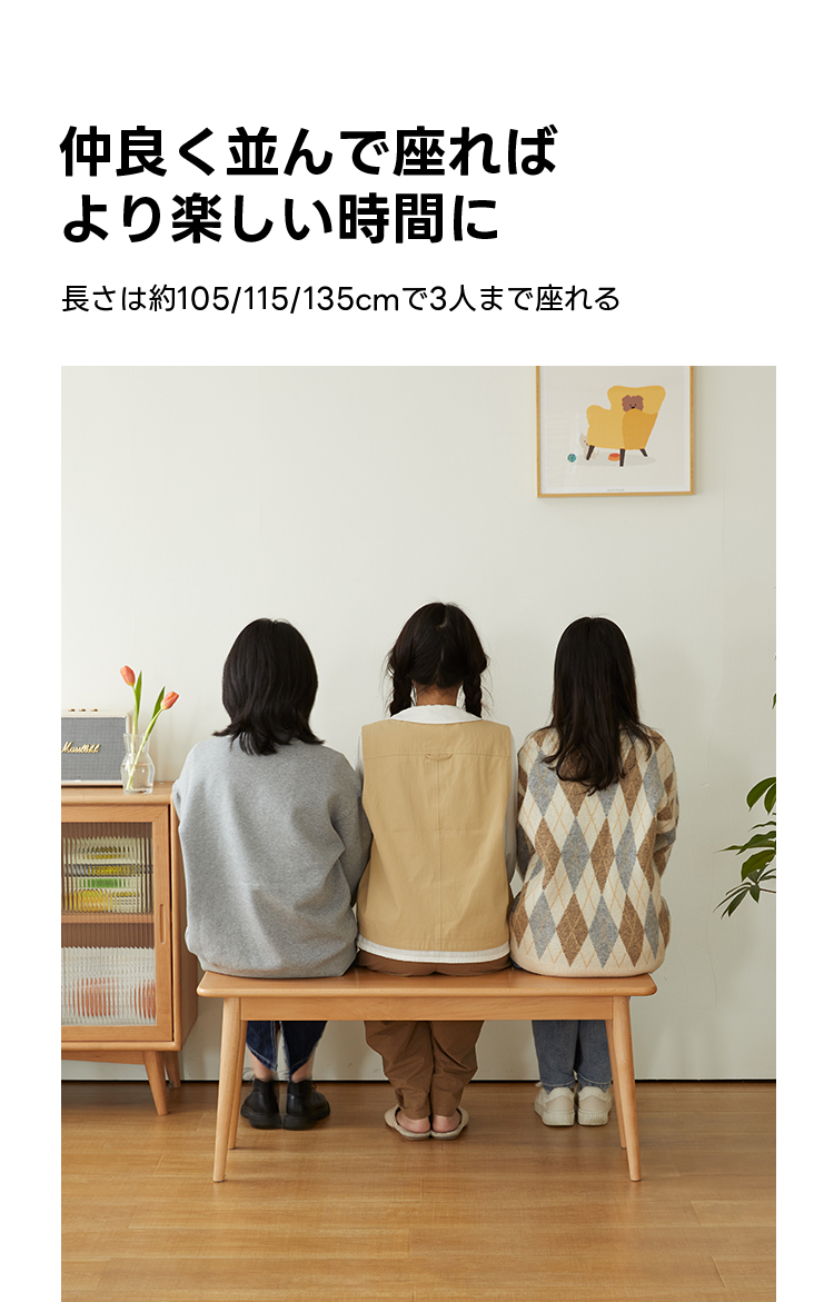 - 【多用途なデザイン】このベンチは、ダイニングだけでなく、ベッドサイドやリビングでも活用可能です。長さは105cm、115cm、135cmの3サイズから選べ、2人から3人まで快適に座ることができます。