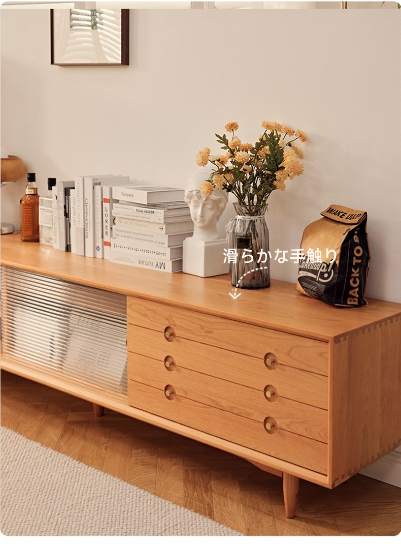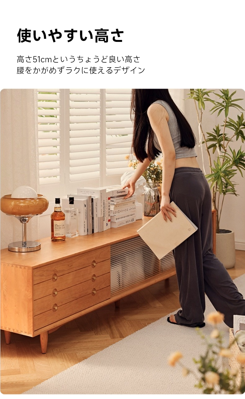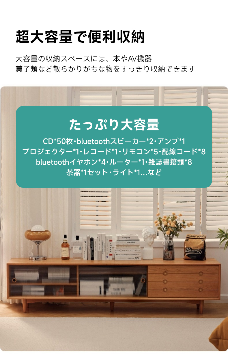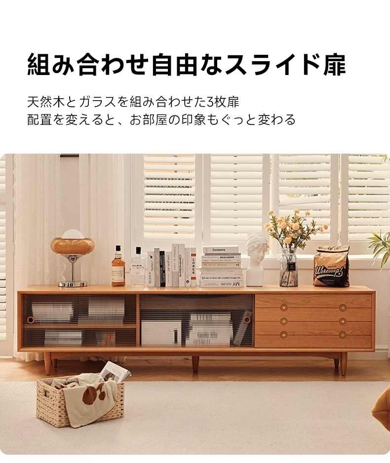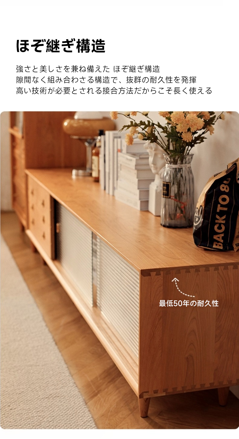 - 【大容量収納と機能性】チェリー材を使用したテレビキャビネットは、幅180cmと210cmの2サイズ展開で、大容量の収納スペースを提供します。CDやAV機器、本などをすっきりと整理整頓でき、リモコンやケーブルなどの小物も簡単に収納可能です。