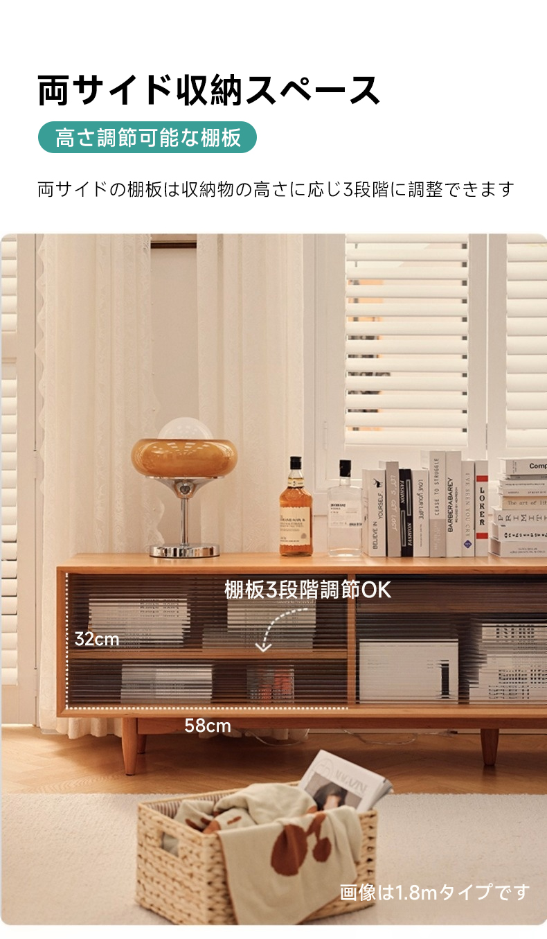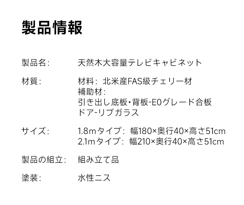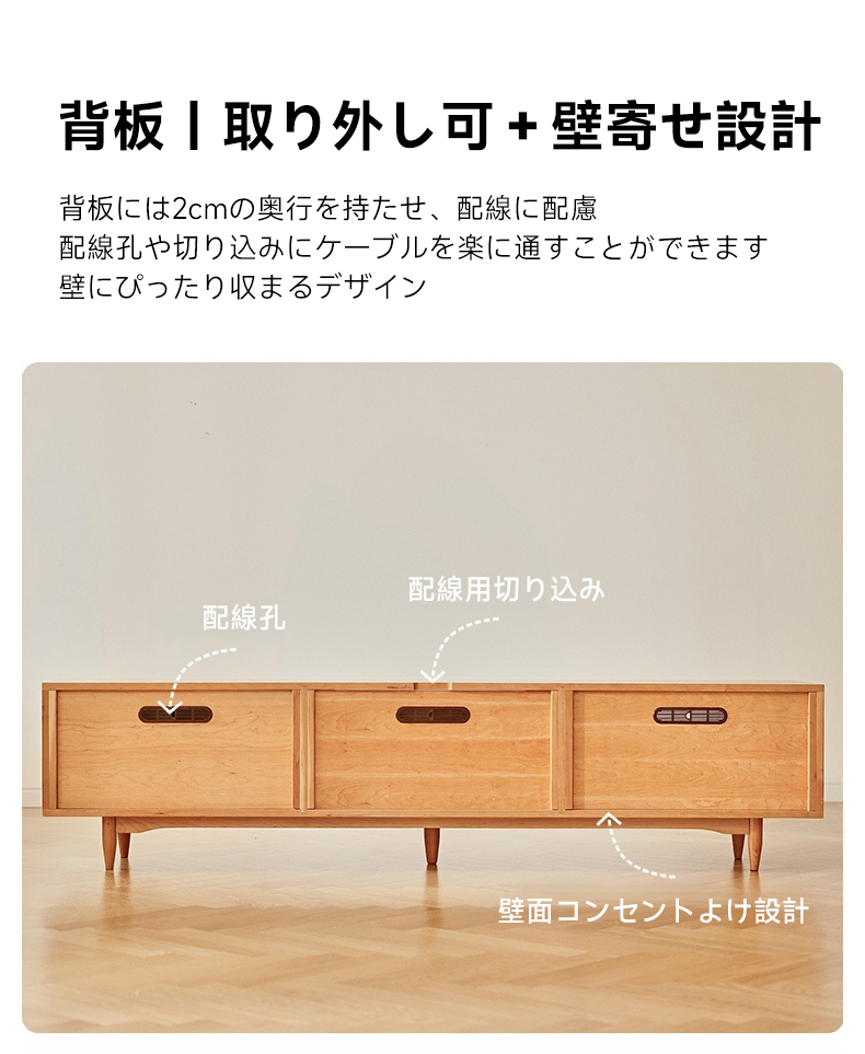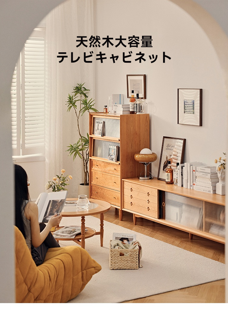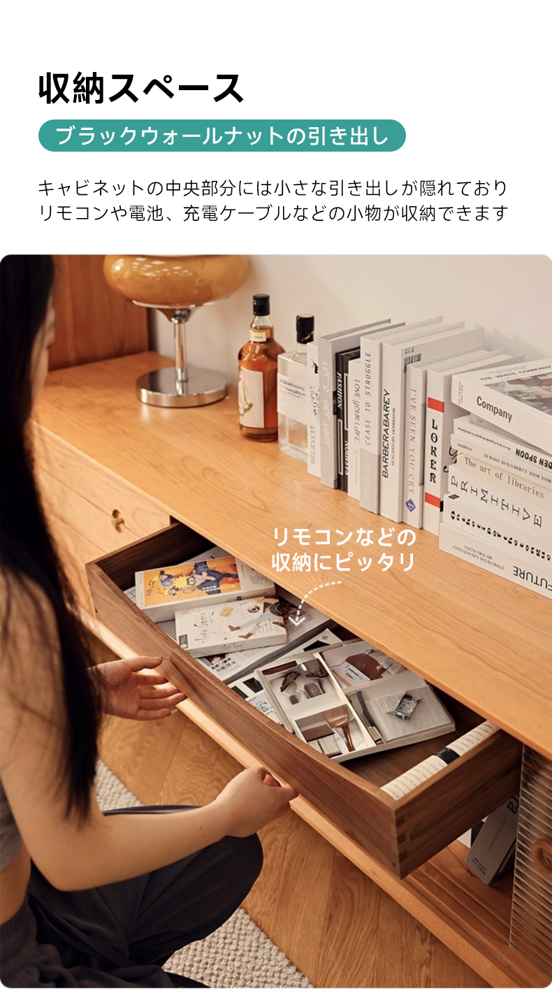 - 【大容量収納と機能性】チェリー材を使用したテレビキャビネットは、幅180cmと210cmの2サイズ展開で、大容量の収納スペースを提供します。CDやAV機器、本などをすっきりと整理整頓でき、リモコンやケーブルなどの小物も簡単に収納可能です。