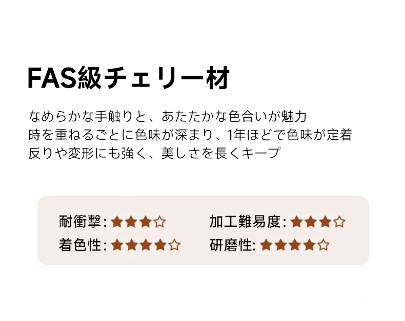 - 【高品質な素材とデザイン】北米産FAS級チェリー材を使用し、滑らかな手触りと温かみのある色合いが特徴です。経年変化により色味が深まり、長く美しさを保ちます。ほぞ継ぎ構造により、高い耐久性を誇ります。