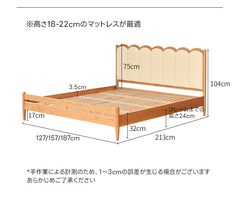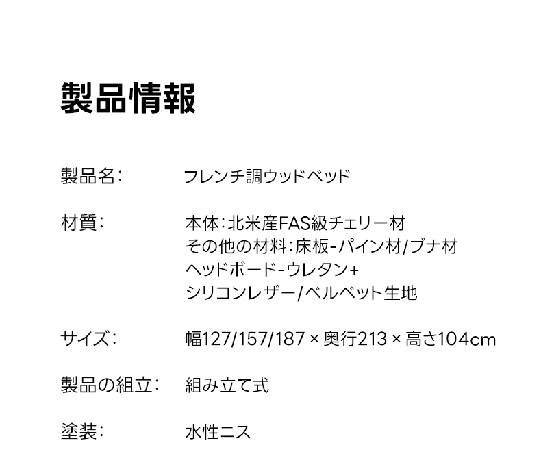 - 【優雅なデザインと高級感】北欧風のフレンチ調デザインが特徴のウッドベッド。チェリー材を使用し、美しい木目と耐久性を兼ね備えています。寝室に高級感をプラスし、長く愛用するほどに味わいが増します。