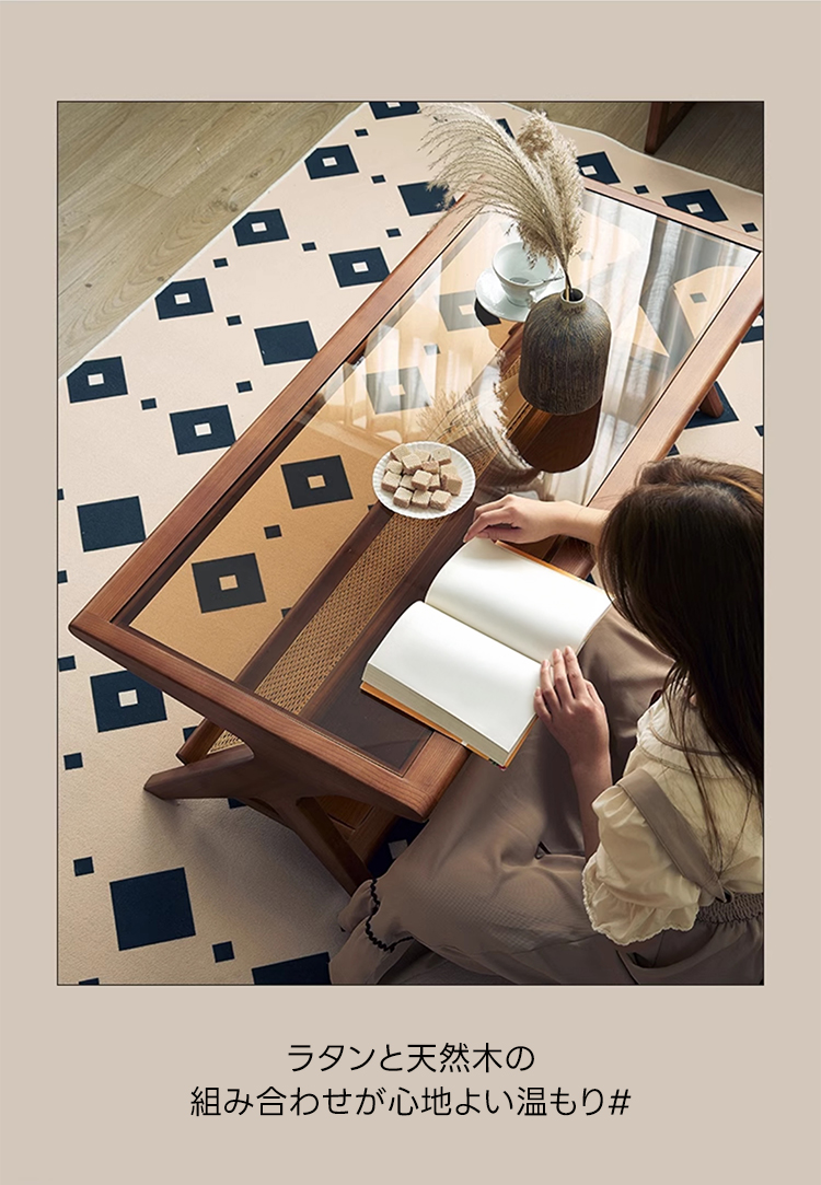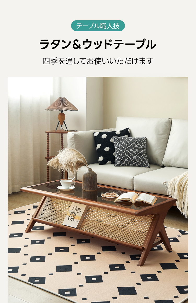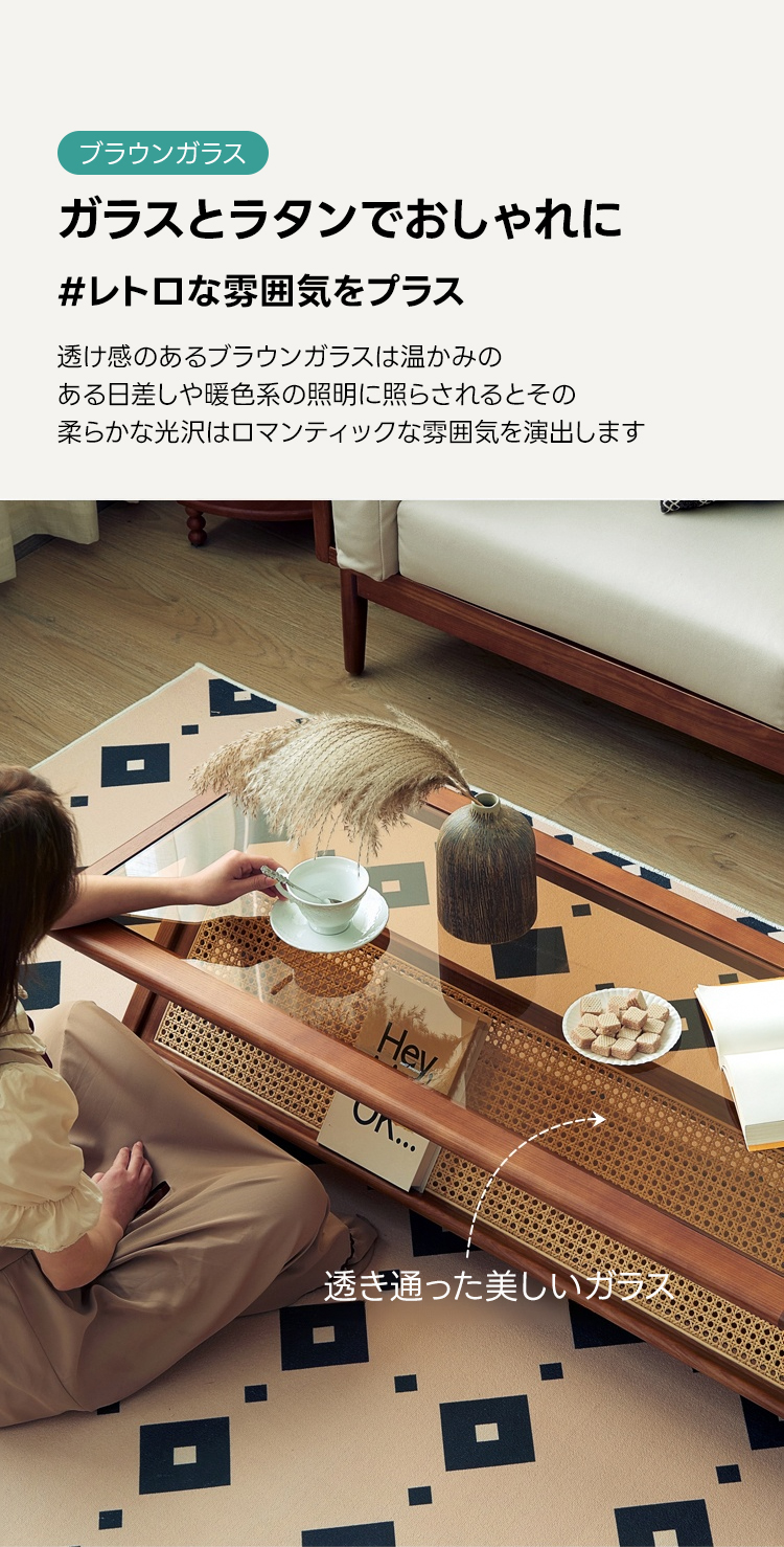 - 【多機能ヴィンテージテーブル】:ラタン&ウッドテーブルは、ヴィンテージ感とモダンなデザインを兼ね備えた多機能テーブルです。ホワイトアッシュ材とラタンの組み合わせが耐久性と通気性を実現し、ブラウンガラスの天板がロマンティックな雰囲気を演出します。
