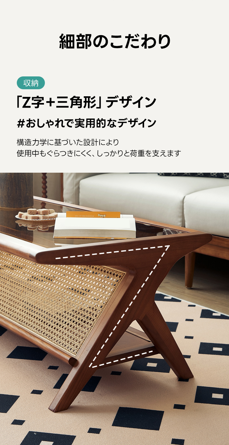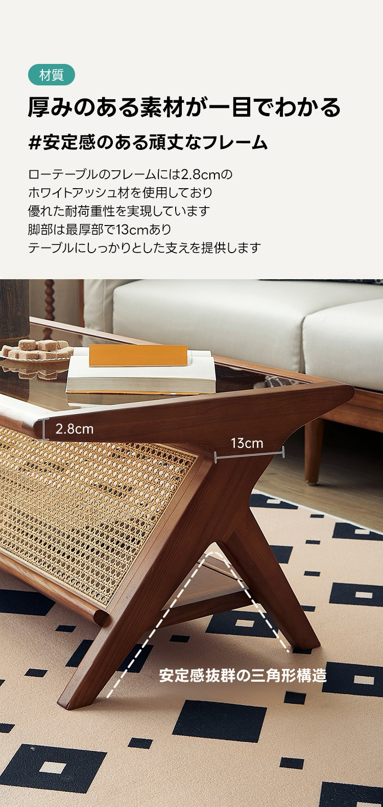 - 【高品質素材とデザイン】:主材には北米産FAS級ホワイトアッシュと八角形ラタンを使用し、補助材には天然木積層合板が使われています。「Z字+三角形」デザインは、構造力学に基づいて設計され、使用中もぐらつきにくく、しっかりと荷重を支えます。