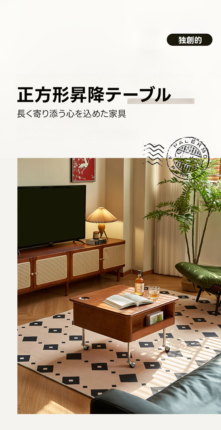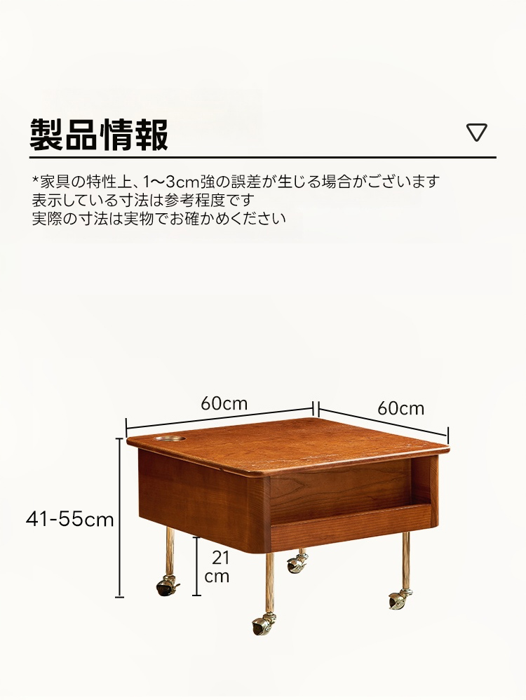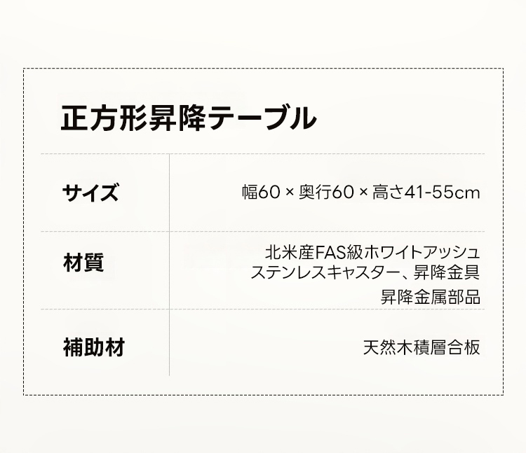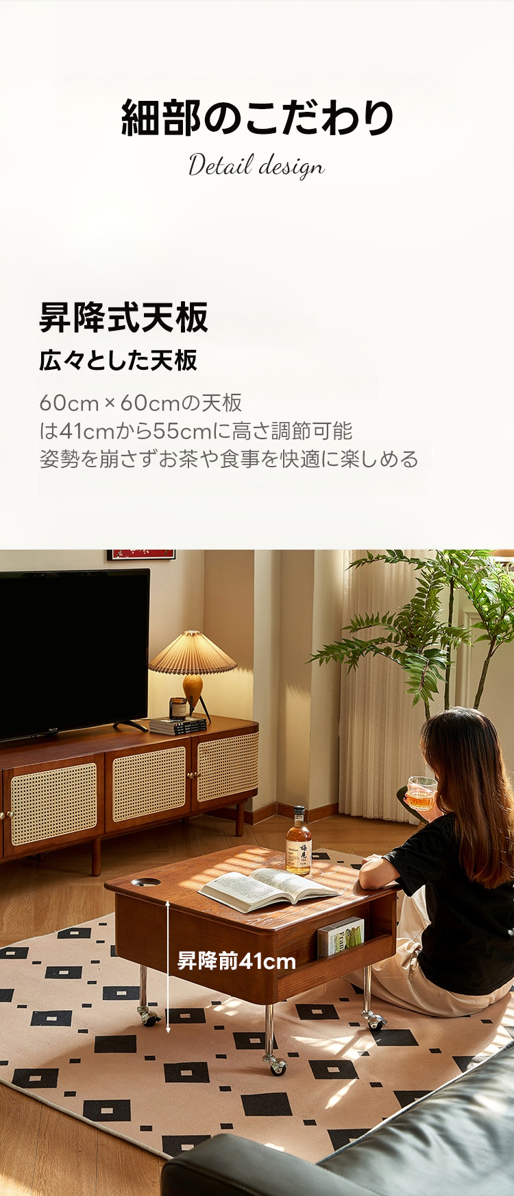- 【昇降式天板で快適な使用感】この正方形昇降テーブルは、60cm×60cmの広々とした天板が41cmから55cmまで調節可能です。座ったままでも快適にお茶や食事を楽しむことができ、リビングでの使用に最適です。