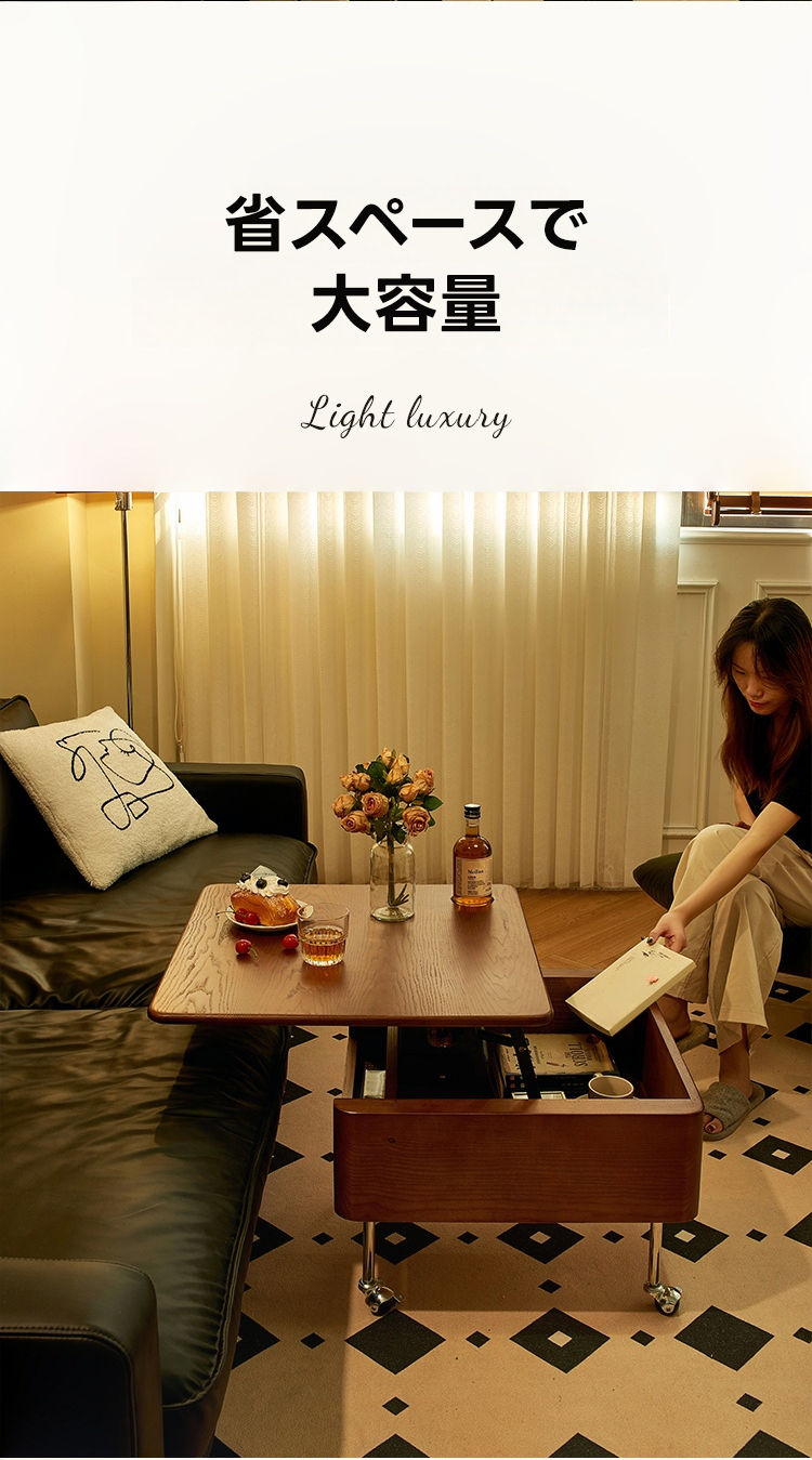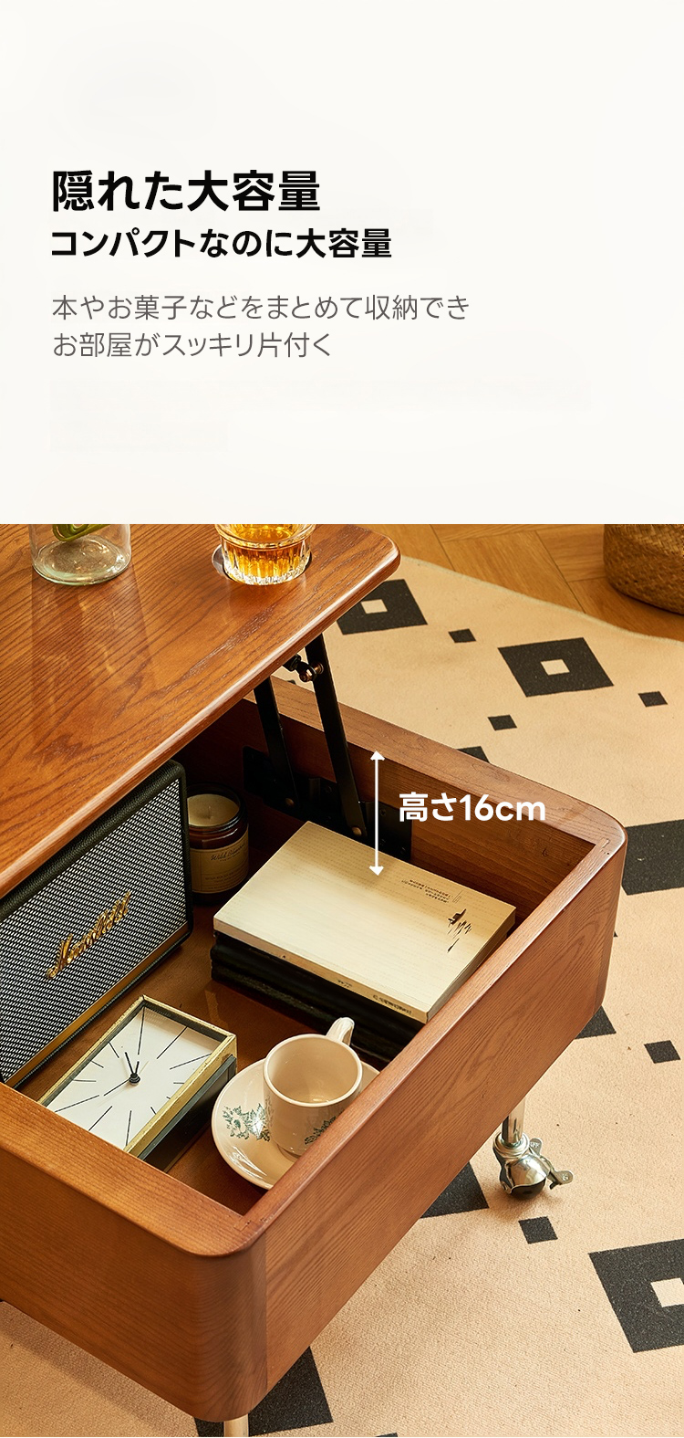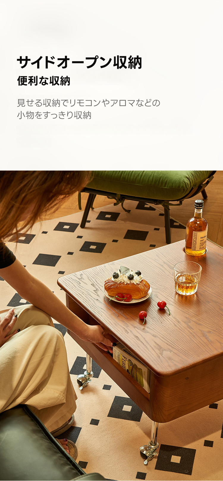 - 【多機能な収納力】隠し収納スペースを備えたこのテーブルは、16cmの高さで本や小物をすっきりと収納可能です。さらに、サイドオープン収納もあり、リモコンやアロマなどの小物を整理整頓できます。