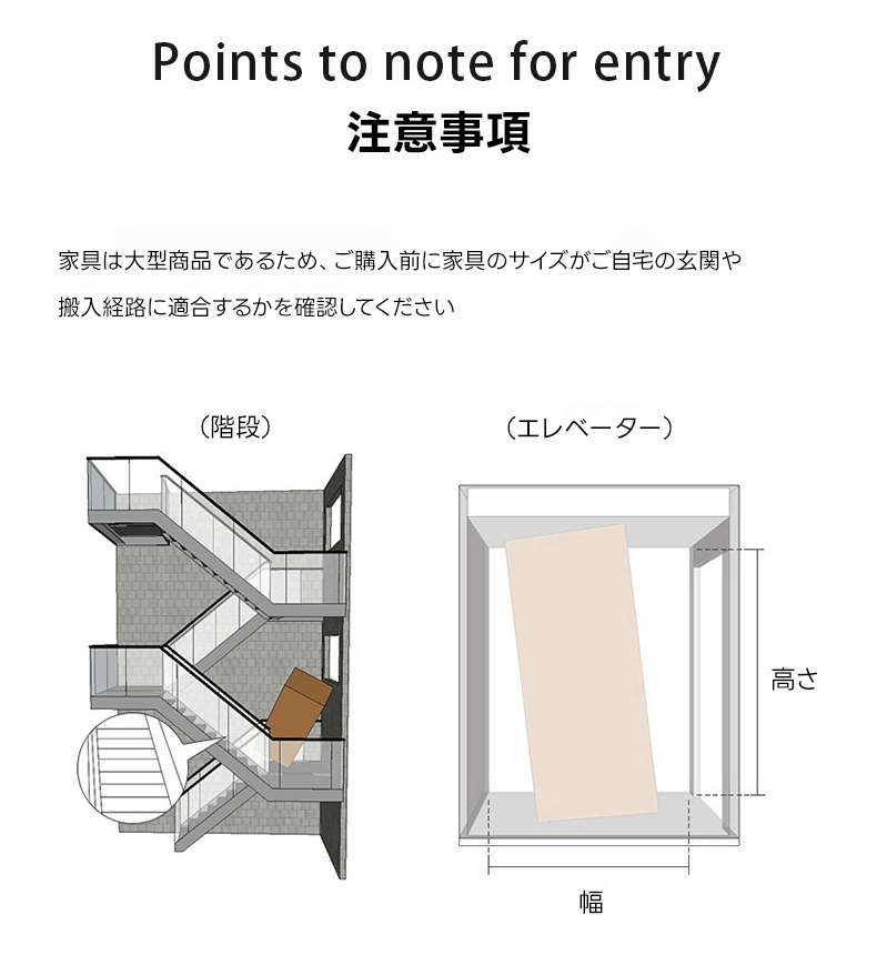 ※搬入不可等の理由による注文キャンセルは、ご返送にかかる費用をお客様にご請求いたします。ご注文前に大型家具の搬入方法をご確認ください。
