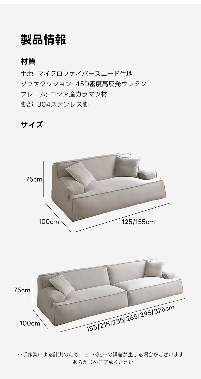 - 【高品質な素材と頑丈な構造】ソファのフレームにはロシア産カラマツ材を使用し、脚部は304ステンレスで頑丈な作りです。高級マイクロファイバースエード生地が上品な雰囲気を演出します。