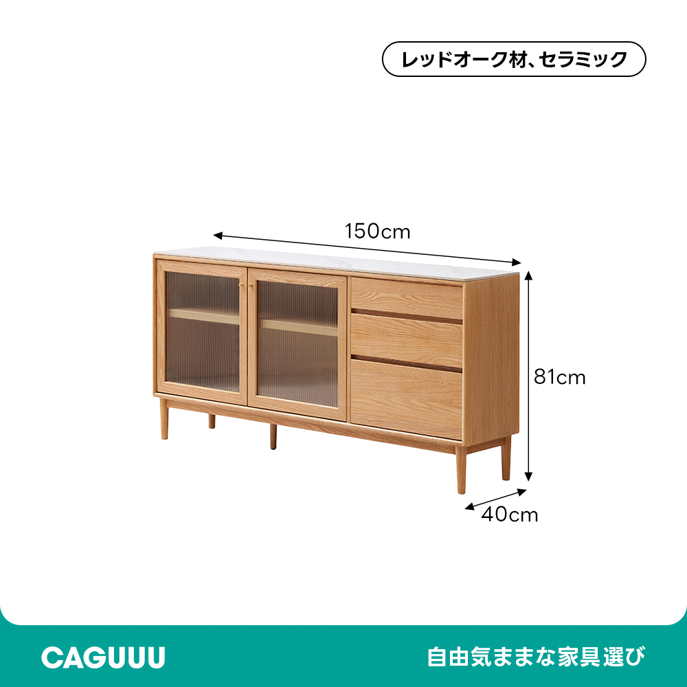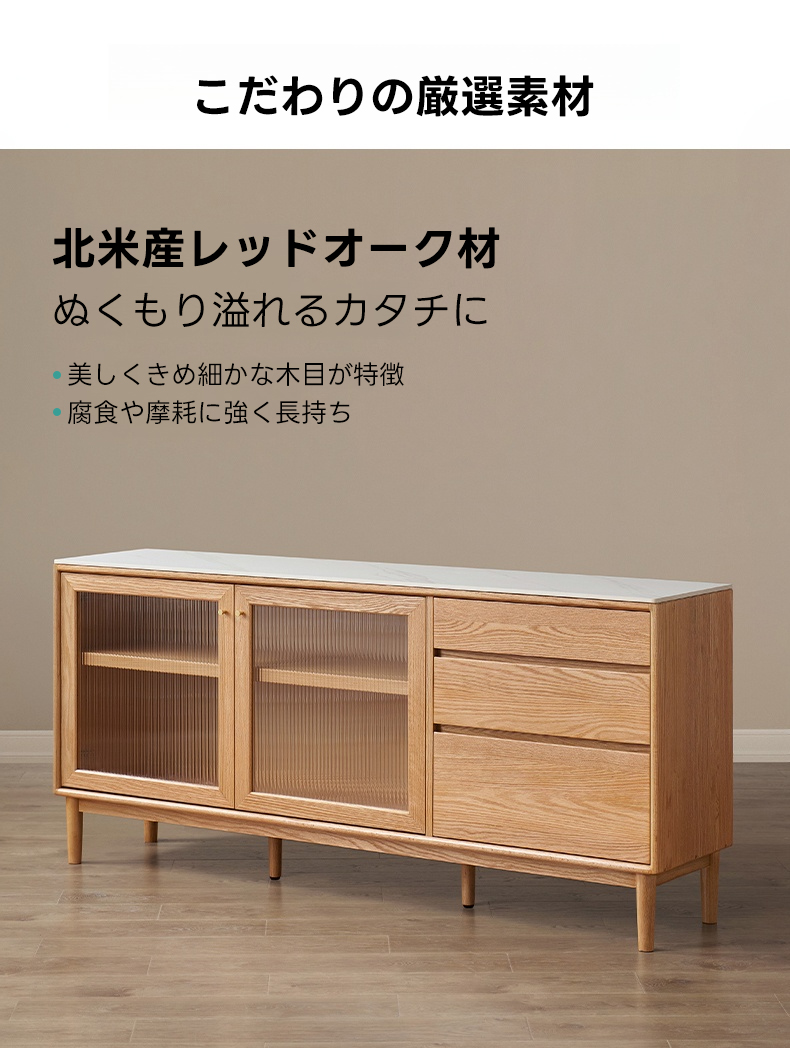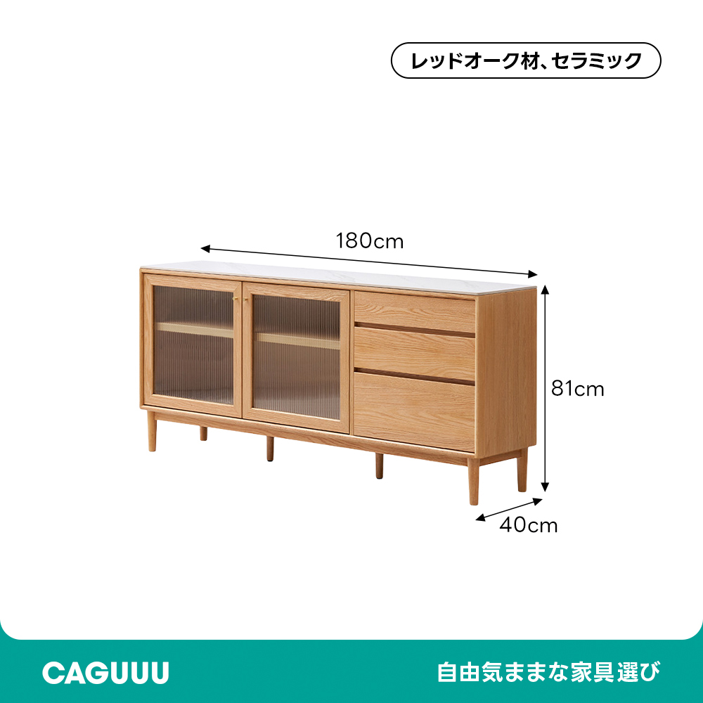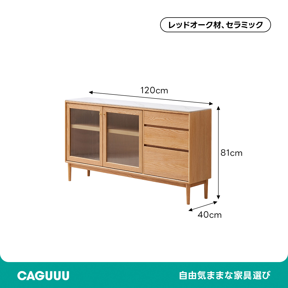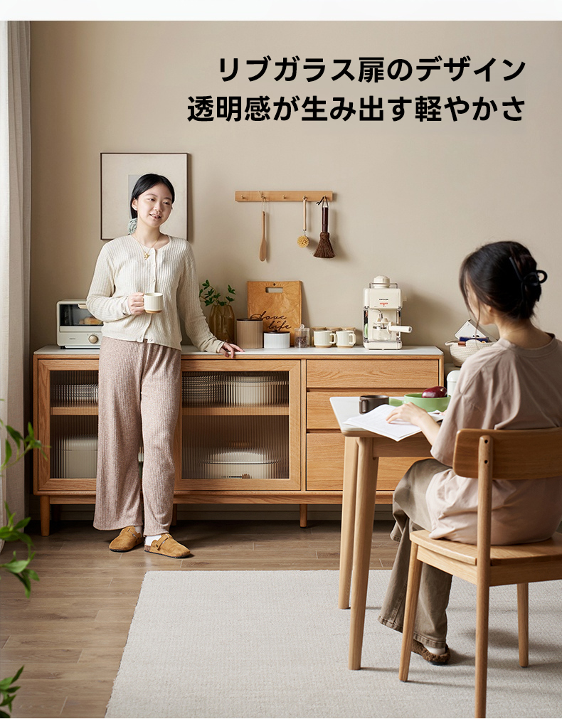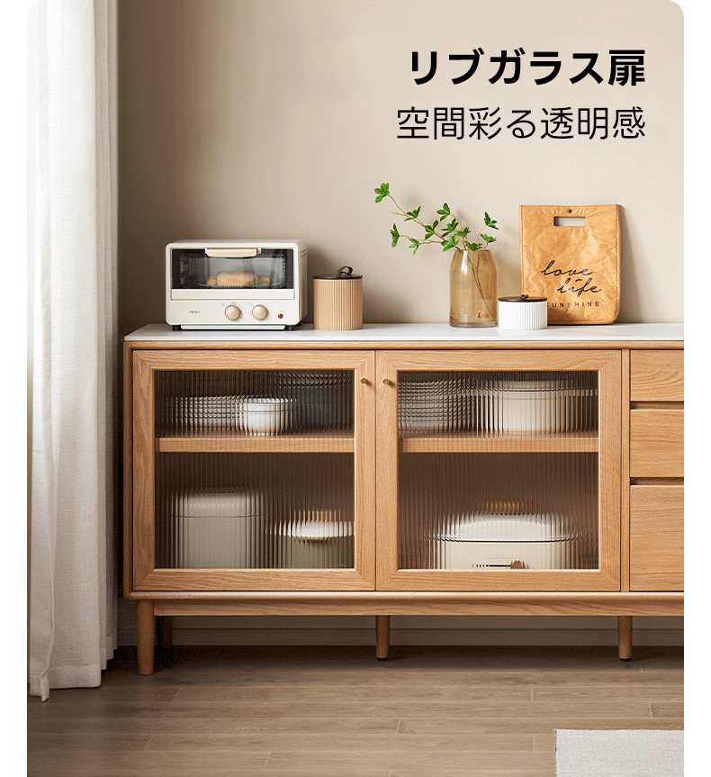 - 【高品質な材料とデザイン】主材には高品質な北米産レッドオーク材を使用し、ぬくもり溢れる木目が美しい仕上がりを実現しています。セラミック天板は耐熱性と耐傷性に優れ、お手入れも簡単で、日常使いに最適です。リブガラス扉は透明感を生かしたデザインで、軽やかさを演出します。