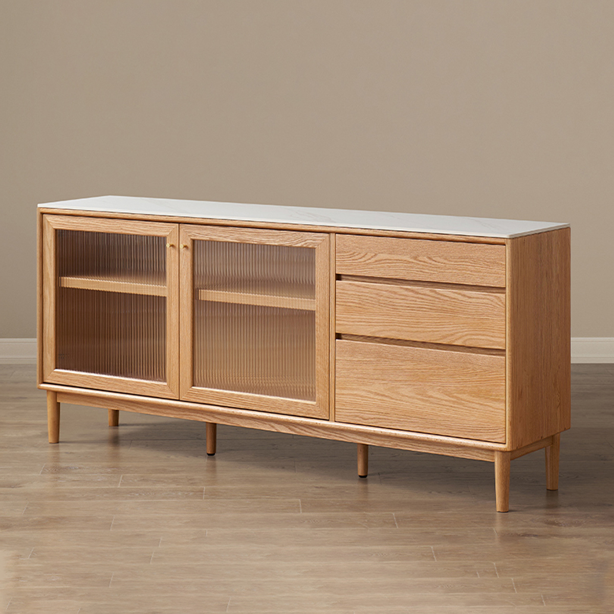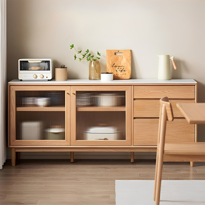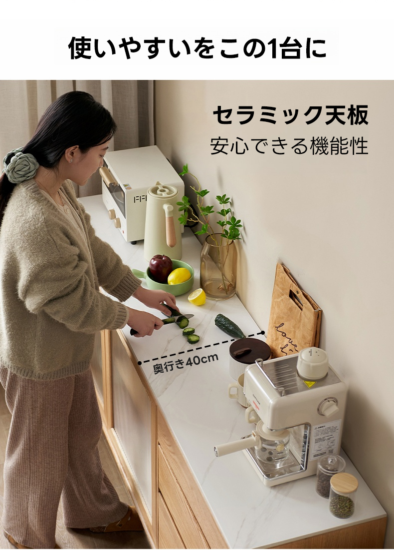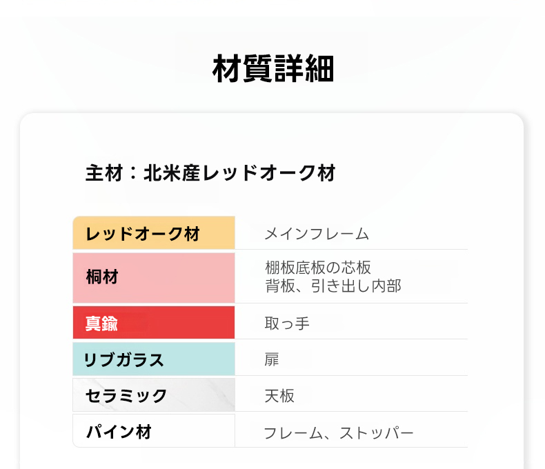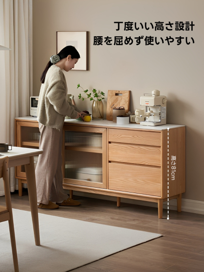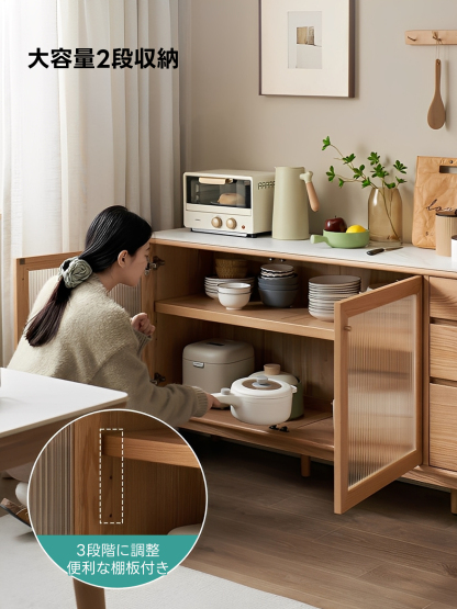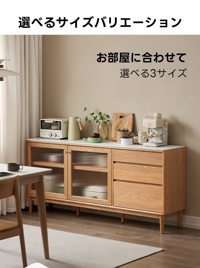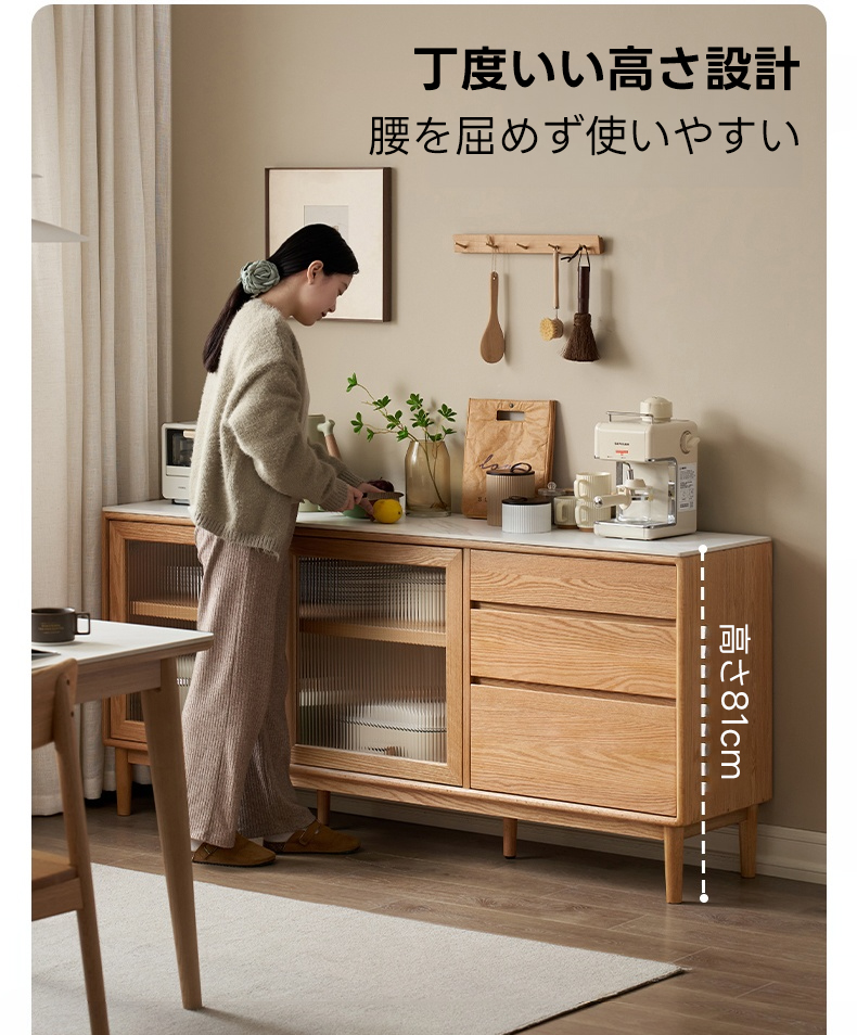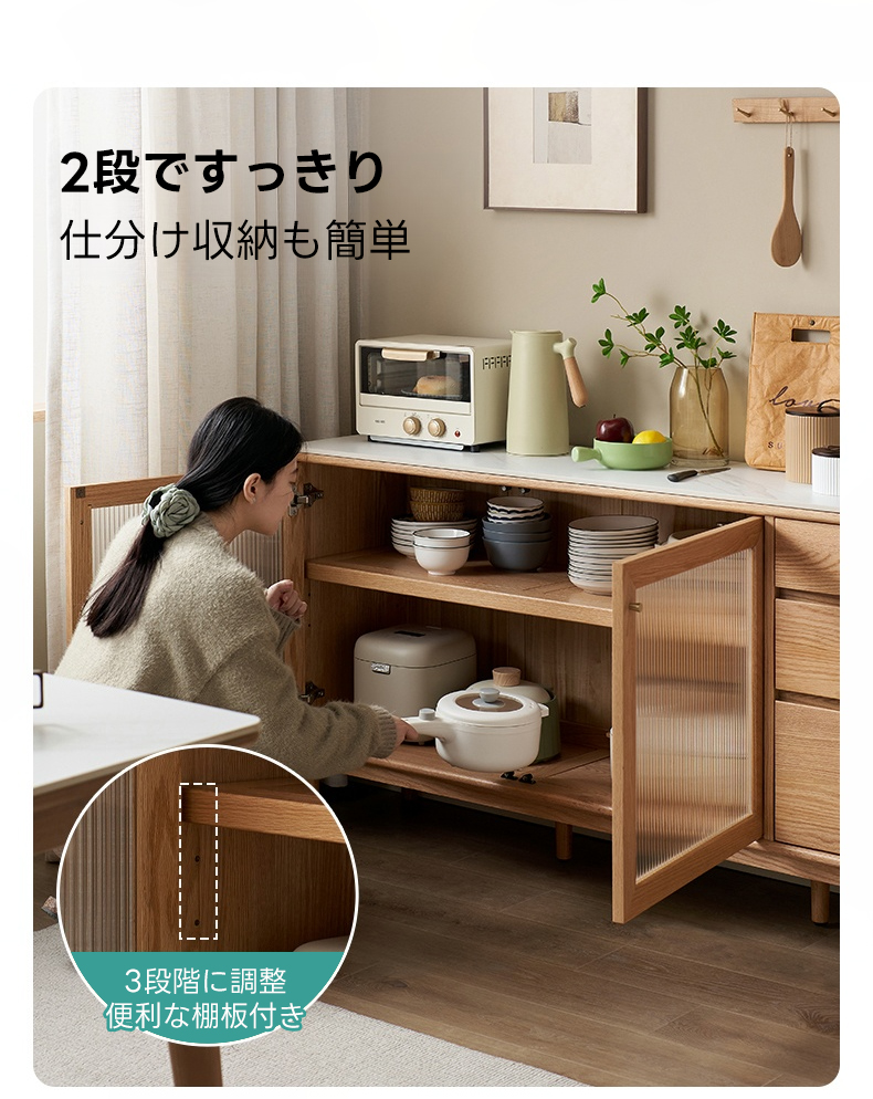 - 【高品質な材料とデザイン】主材には高品質な北米産レッドオーク材を使用し、ぬくもり溢れる木目が美しい仕上がりを実現しています。セラミック天板は耐熱性と耐傷性に優れ、お手入れも簡単で、日常使いに最適です。リブガラス扉は透明感を生かしたデザインで、軽やかさを演出します。
