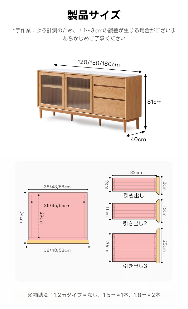 - 【多彩な収納スペース】このサイドボードは、引き出しと2段収納を備え、大容量の収納が可能です。引き出しは3サイズ(12cm、16cm、25cm)で、アイテムに合わせた収納ができます。ダイニングやキッチンでの使用に最適で、カップルやファミリーに向けたデザインとなっています。