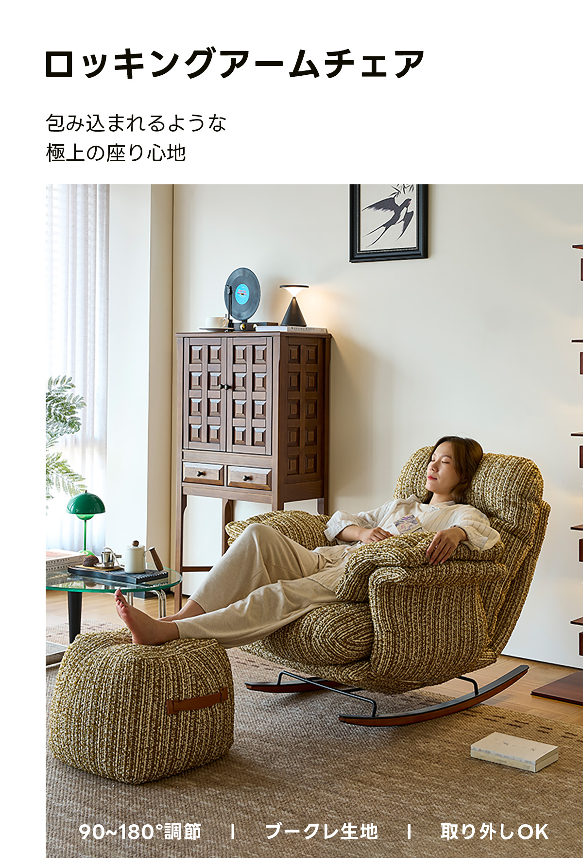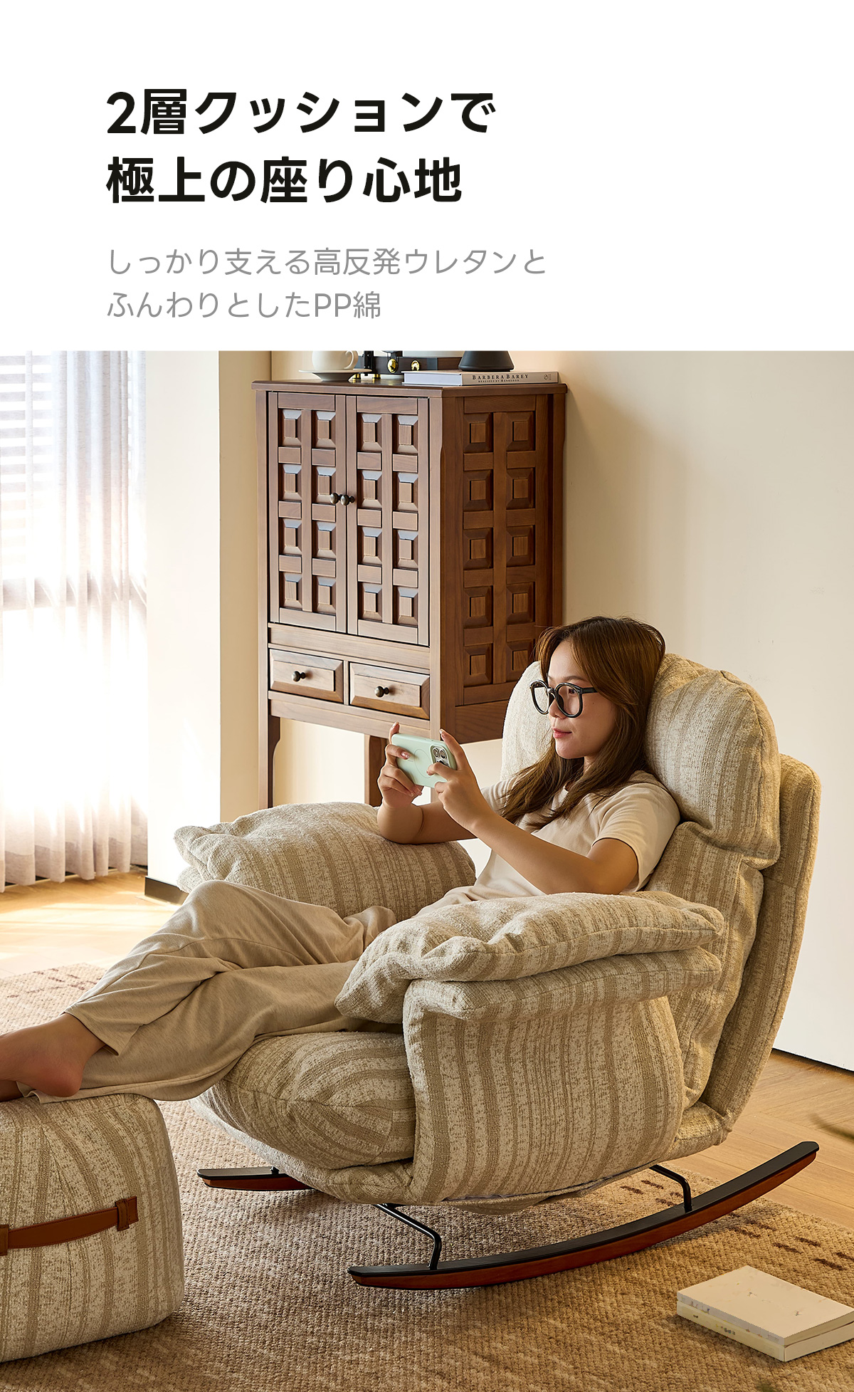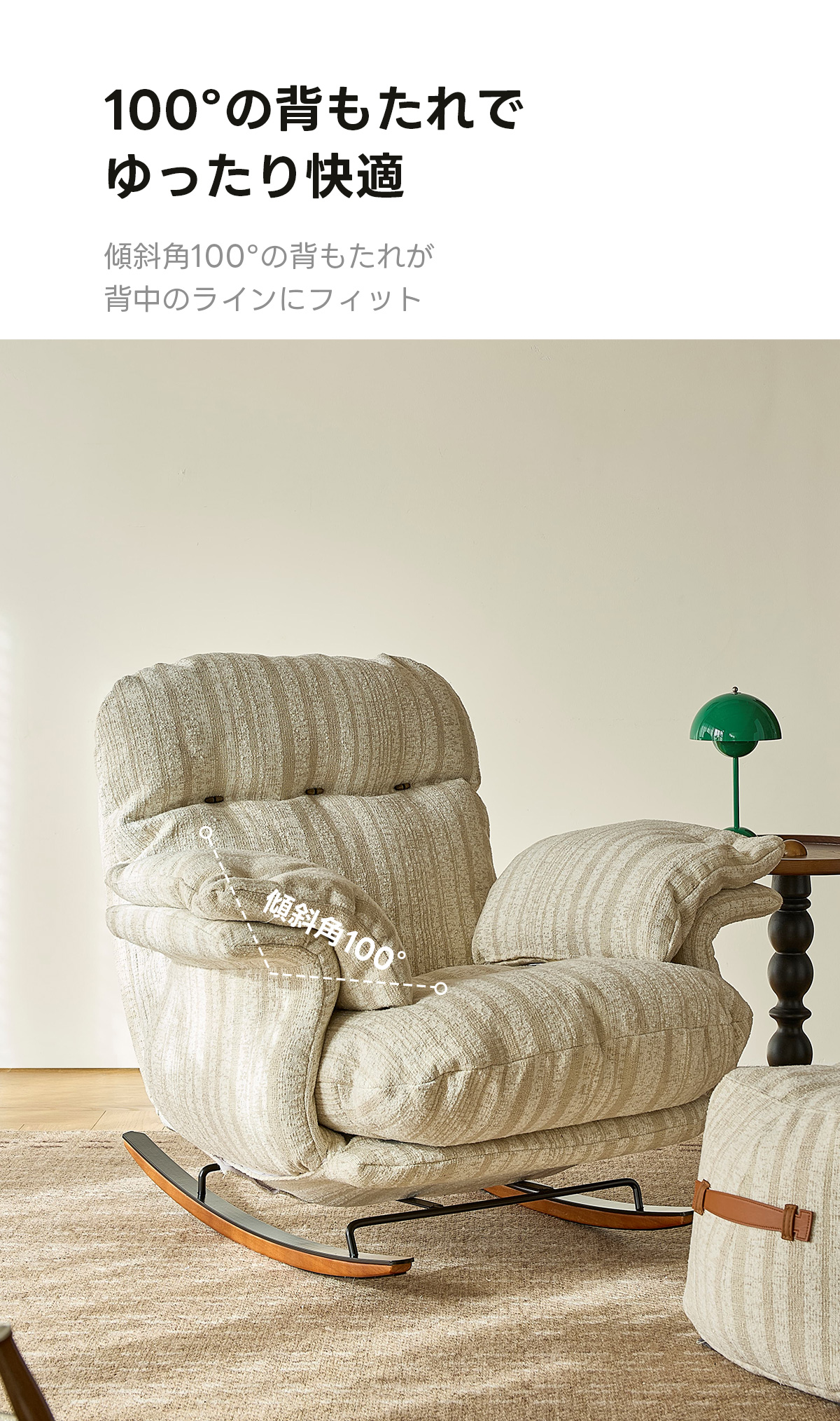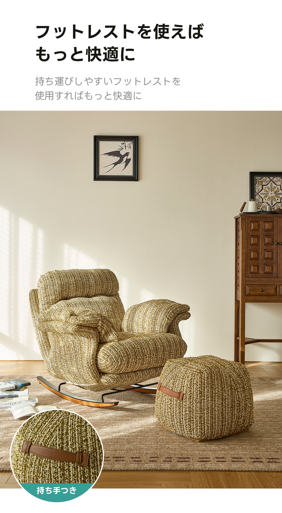 - 【快適なロッキング機能】このロッキングアームチェアは、5度の角度でリラックスできる快適なロッキング機能を備えています。安定感のある脚部により、読書やドラマ視聴に最適で、長時間座っても疲れにくい設計です。