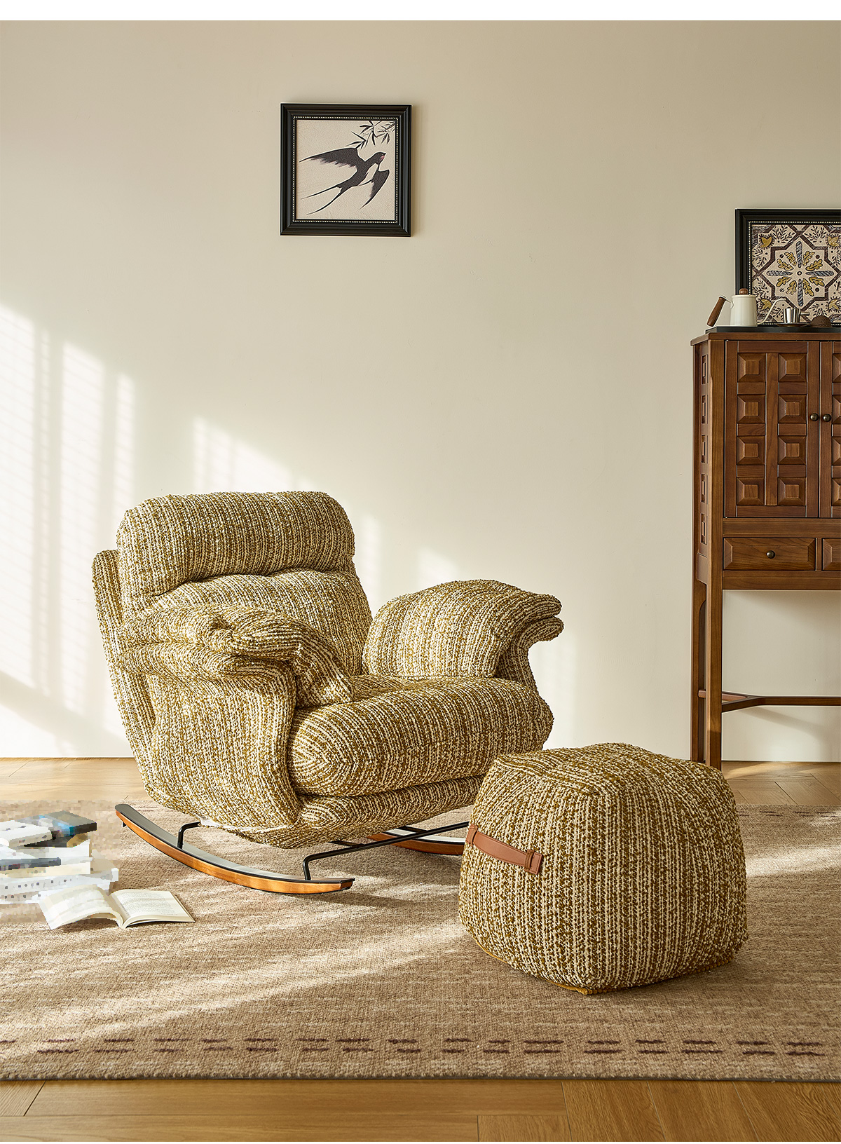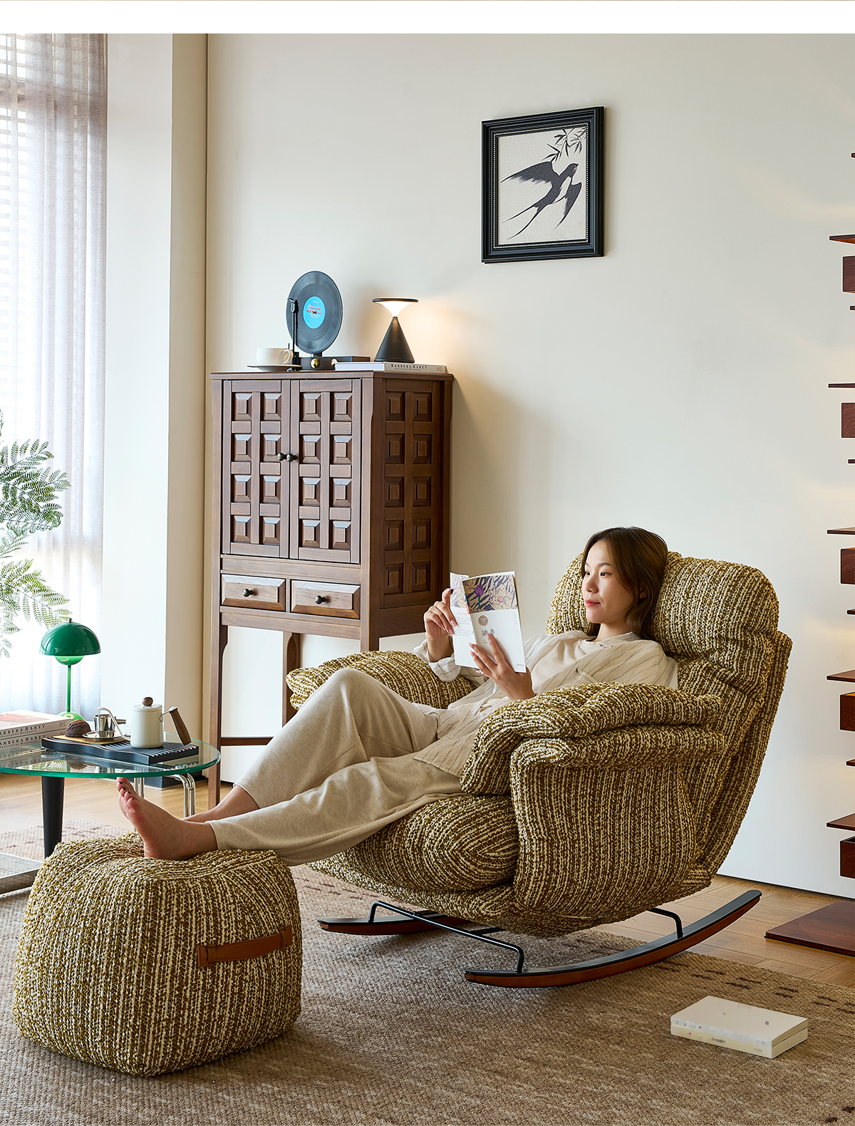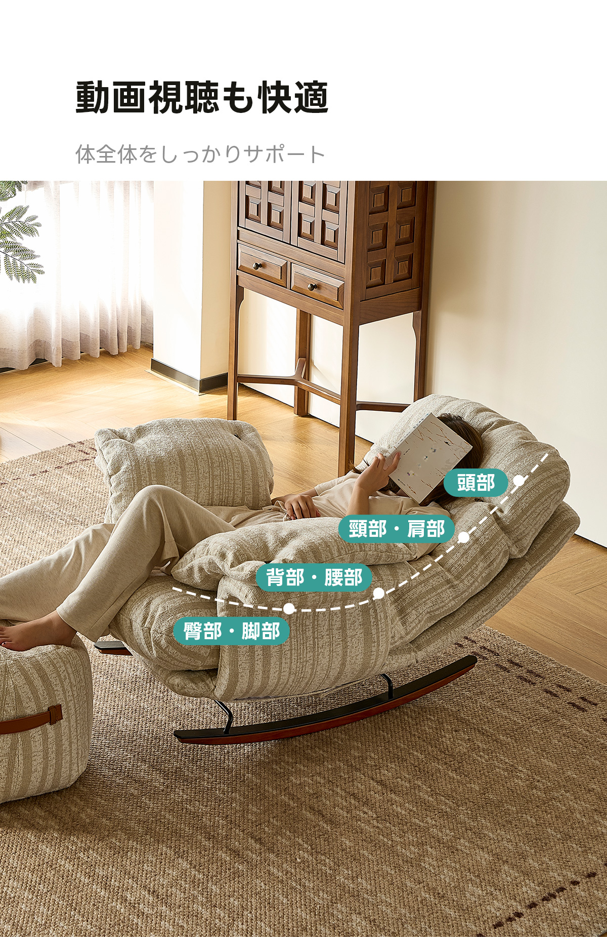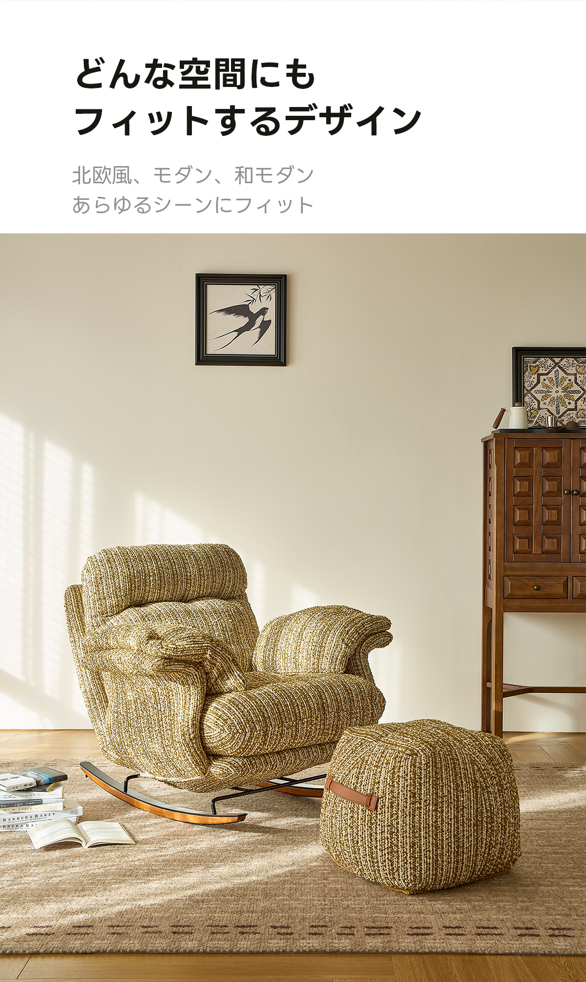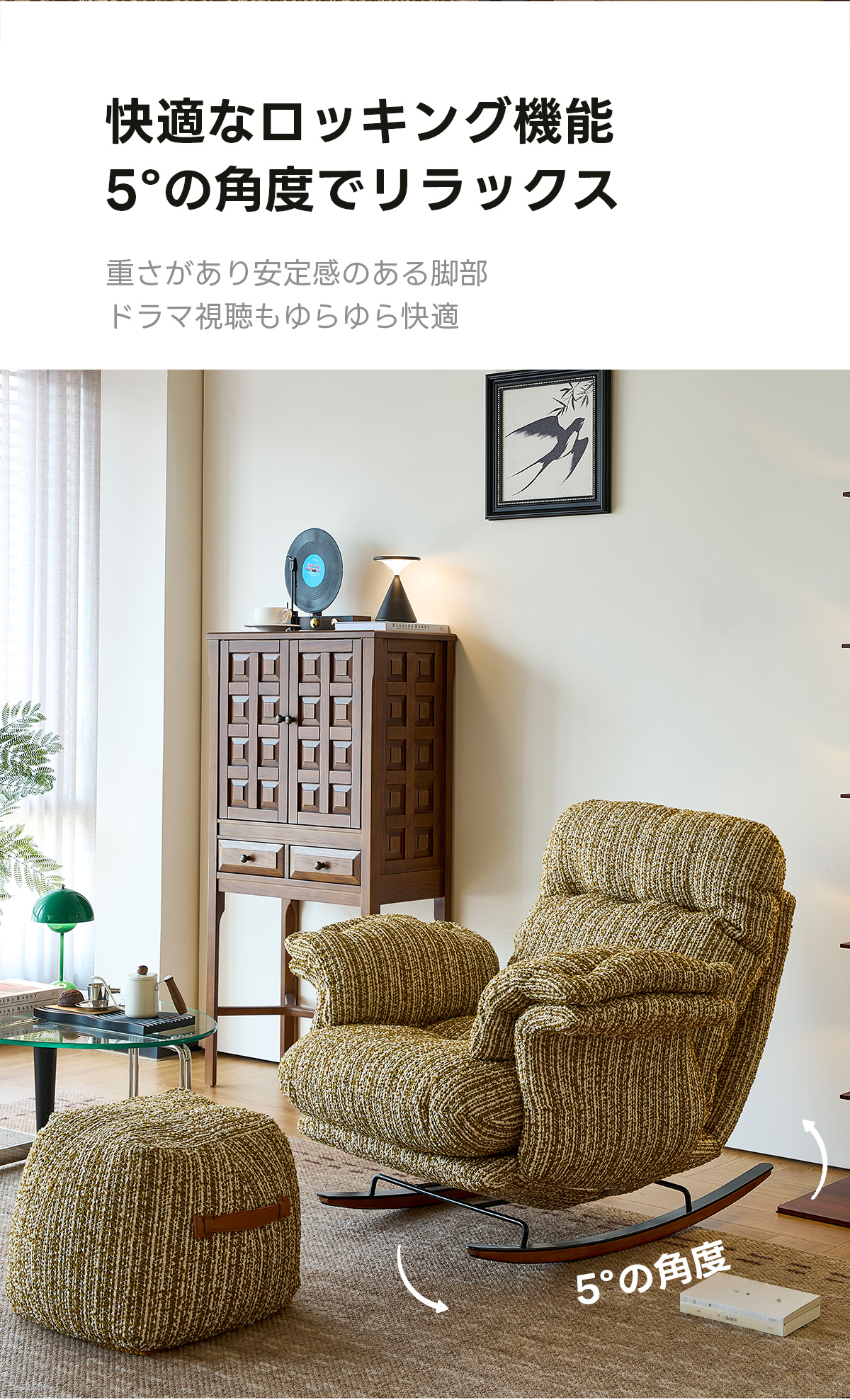 - 【快適なロッキング機能】このロッキングアームチェアは、5度の角度でリラックスできる快適なロッキング機能を備えています。安定感のある脚部により、読書やドラマ視聴に最適で、長時間座っても疲れにくい設計です。