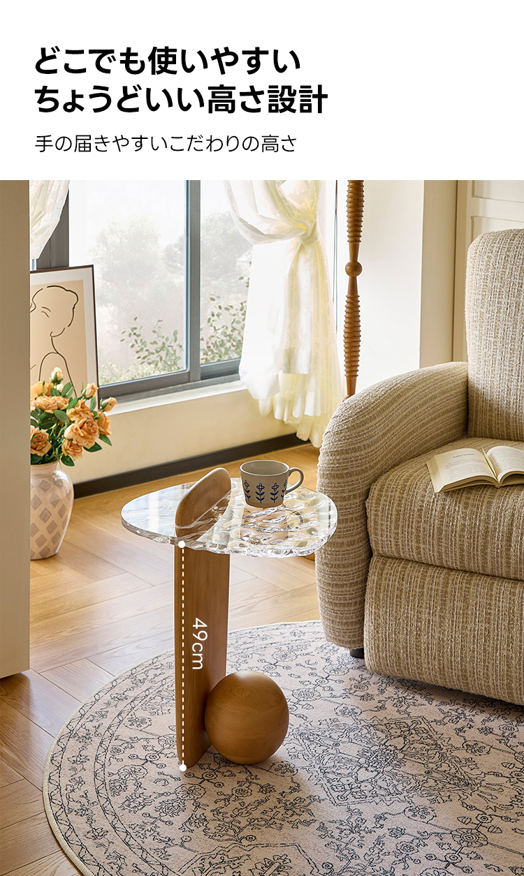 - 【優雅なデザインと実用性】波ガラスサイドテーブルは、モダンでナチュラルなデザインが特徴です。波のような美しい模様のアクリル天板が光を反射し、優雅な雰囲気を演出します。ソファサイドにぴったりの高さ設計で、手の届きやすさを考えたデザインです。