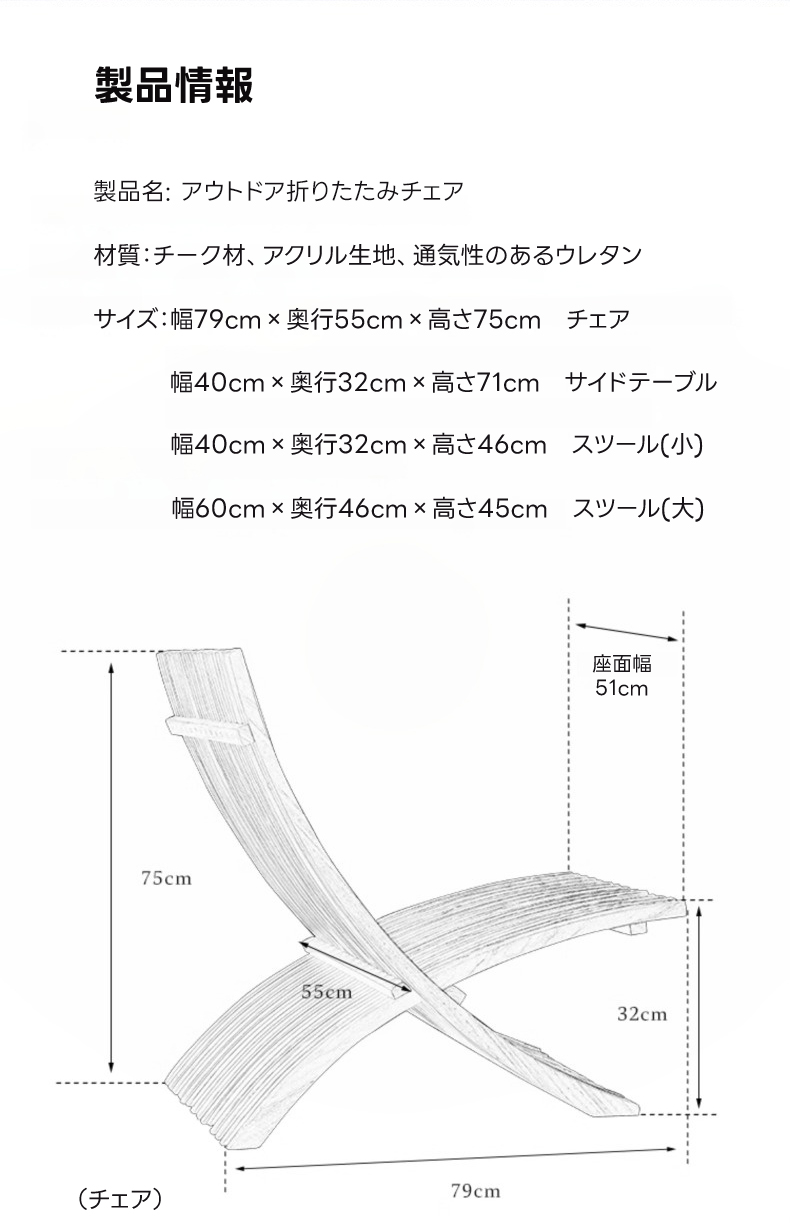 - 【優れた機能性と快適性】:アウトドア折りたたみスツールは、ナチュラルでスタイリッシュなデザインが特徴です。高品質なチーク材を使用し、耐久性に優れた作りとなっています。アクリルとウレタンフォームを使用しており、日差しに強く、通気性や速乾性に優れています。
