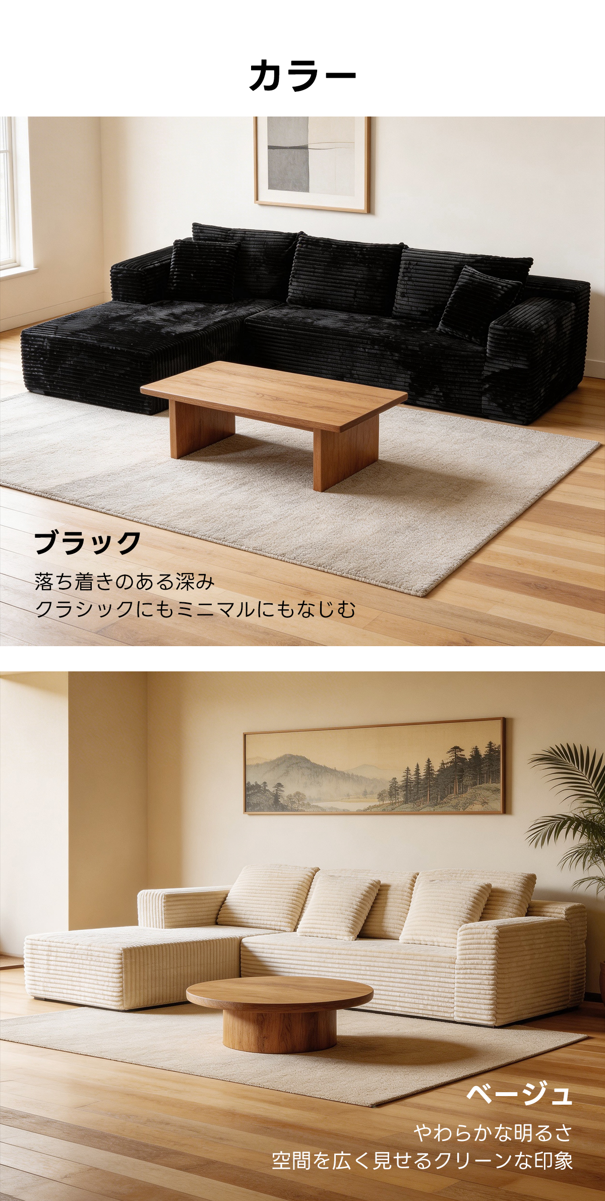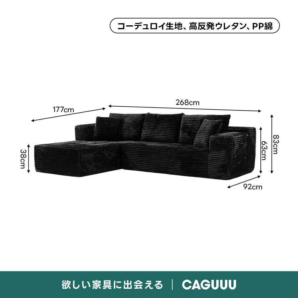 - 【広々としたスペースとカラー展開】サイズは268cm x 177cm x 83cmで、3人掛けの広々としたスペースを提供します。カラーは落ち着いたブラックと、空間を広く見せるホワイトの2色展開です。