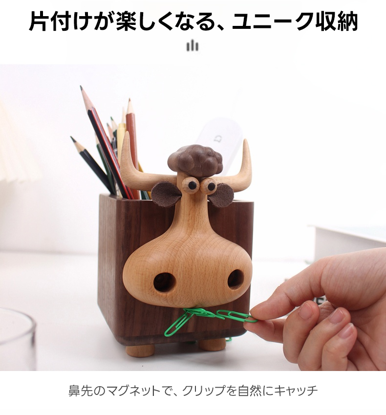 - 【ユニークなデザインと実用性】ウシマグ収納スタンドは、ウシの顔を模した遊び心あふれるデザインで、デスクや子供部屋に楽しい雰囲気を演出します。鼻先にマグネットが付いており、クリップを簡単にキャッチできます。日常の小物整理を楽しくし、インテリアとしても素敵なアクセントを加えます。