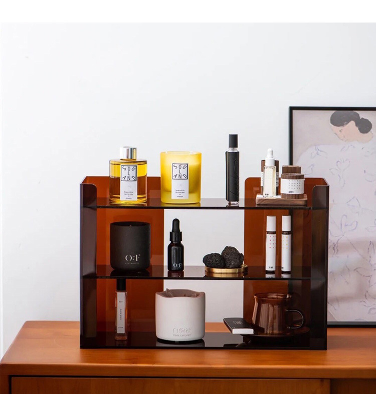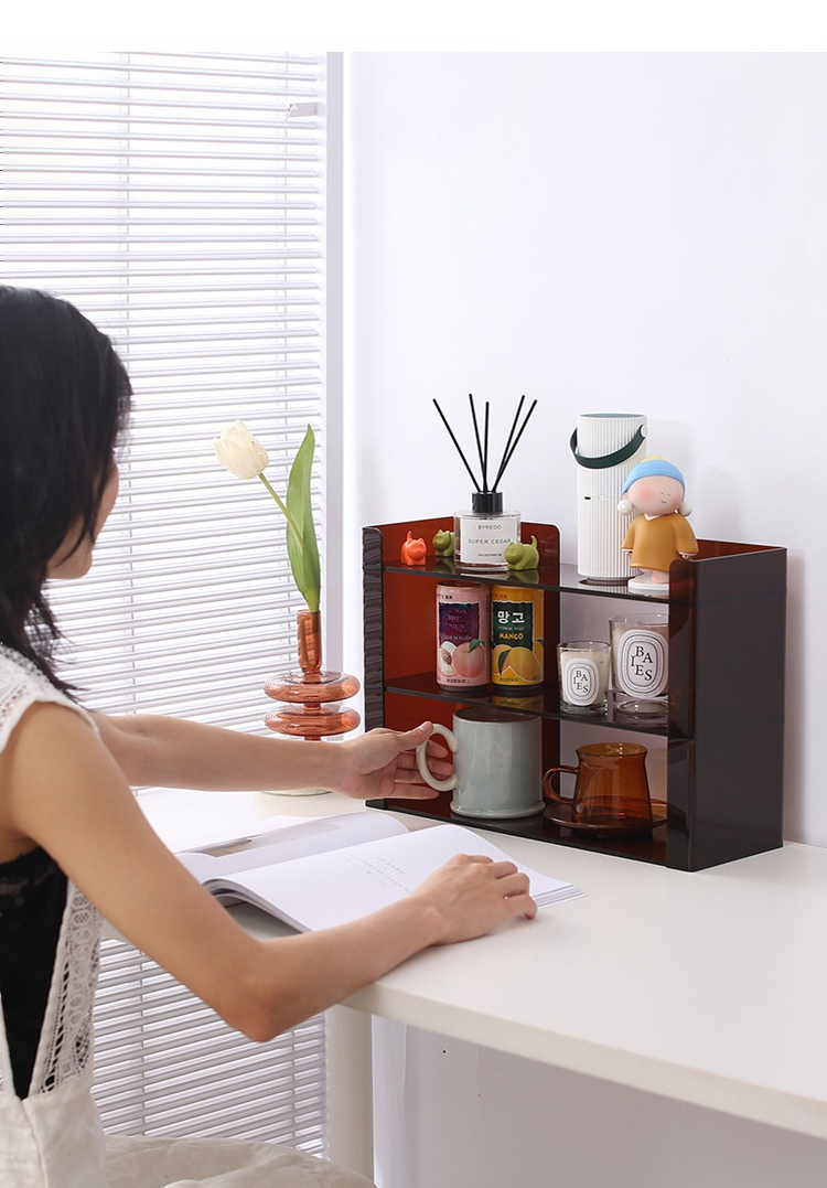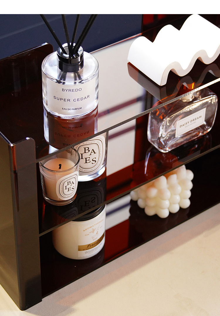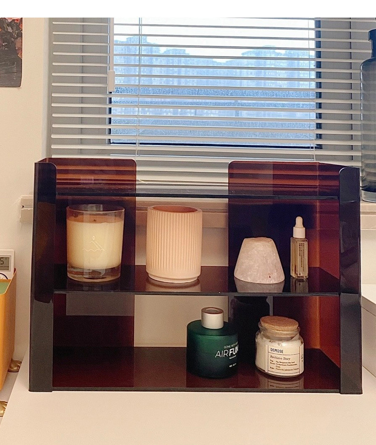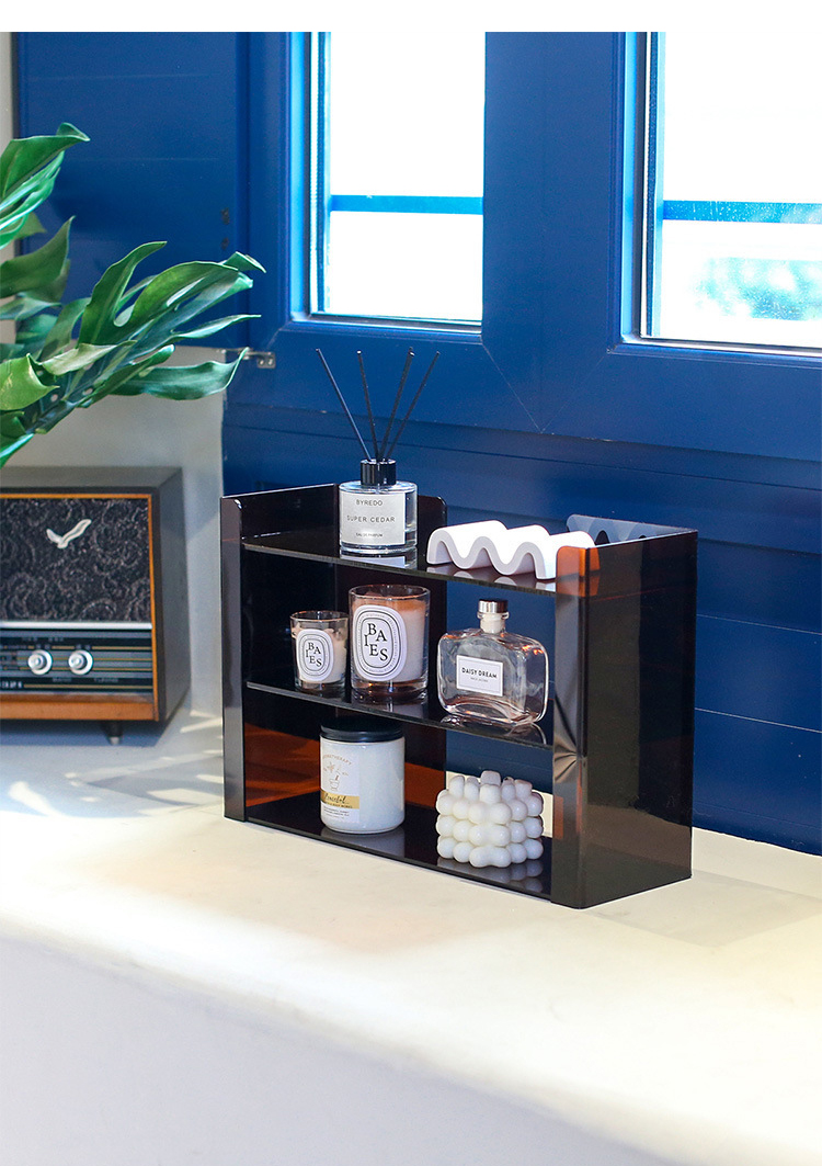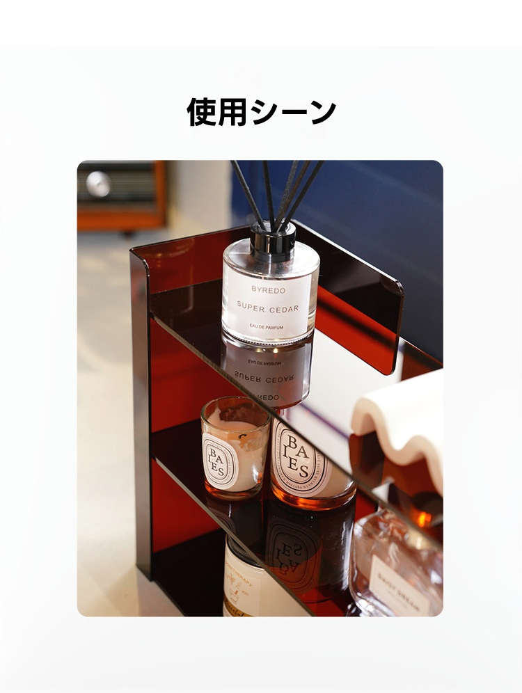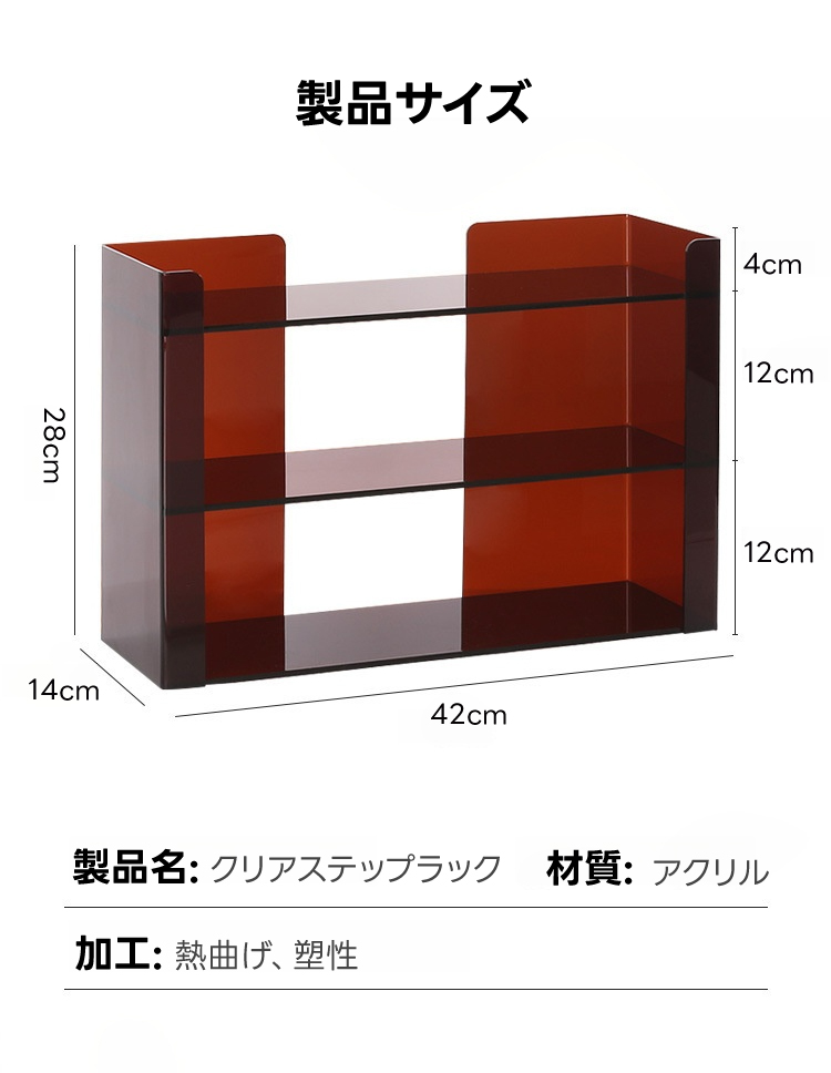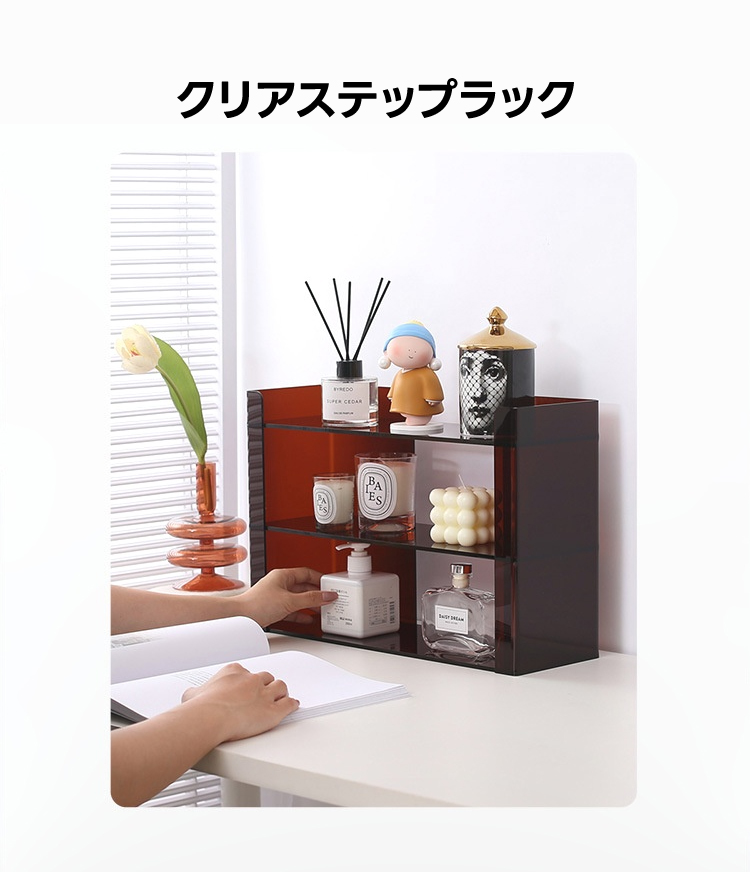 - 【多機能収納ラック】クリアステップラックは、シンプルモダンなデザインとアクリル素材の透明感が魅力の多機能収納ラックです。ダークブラウンの色合いが高級感を演出し、どんなインテリアにも自然に溶け込みます。幅42cm、奥行き14cm、高さ28cmのサイズで、スペースを有効活用しながら小物や雑貨をおしゃれに収納できます。