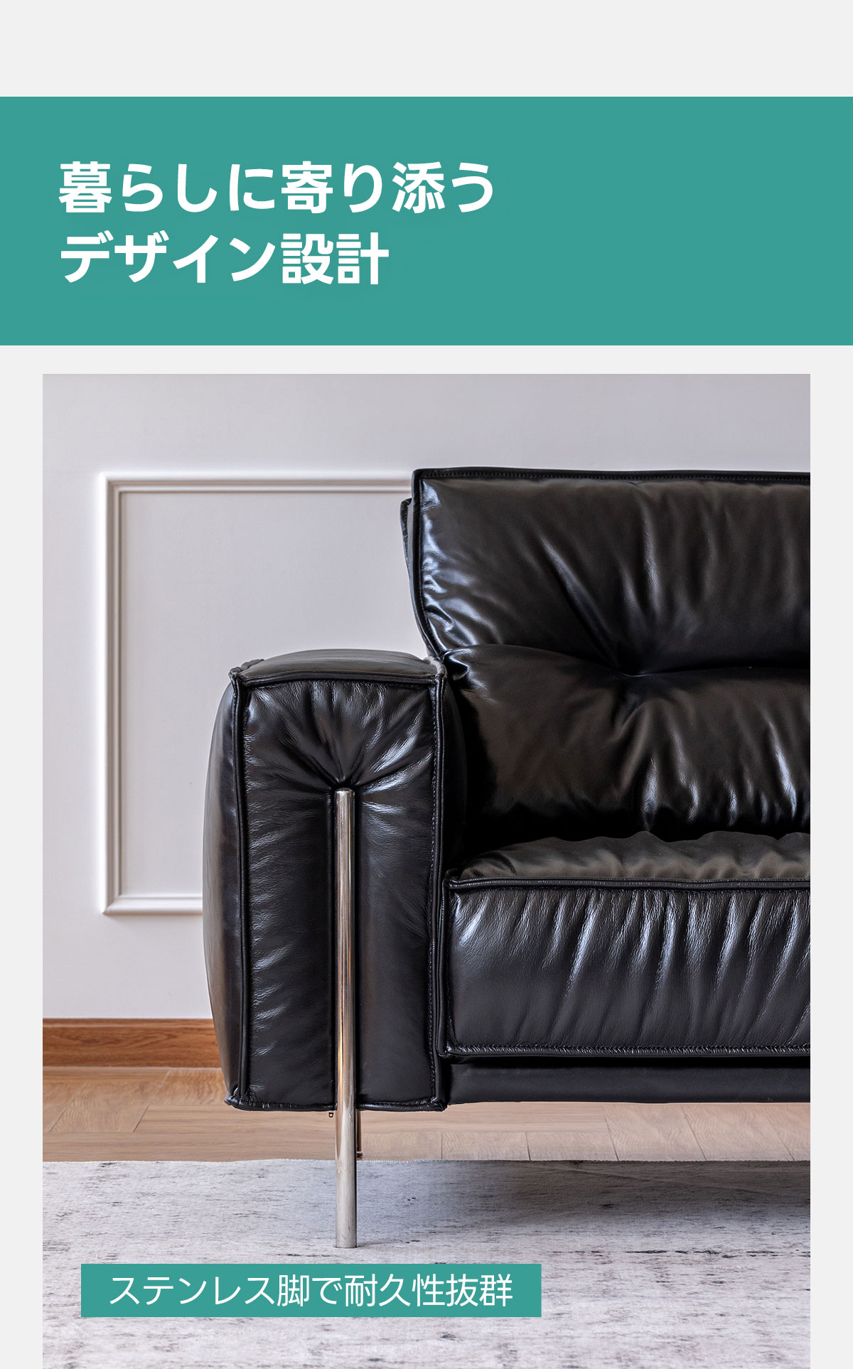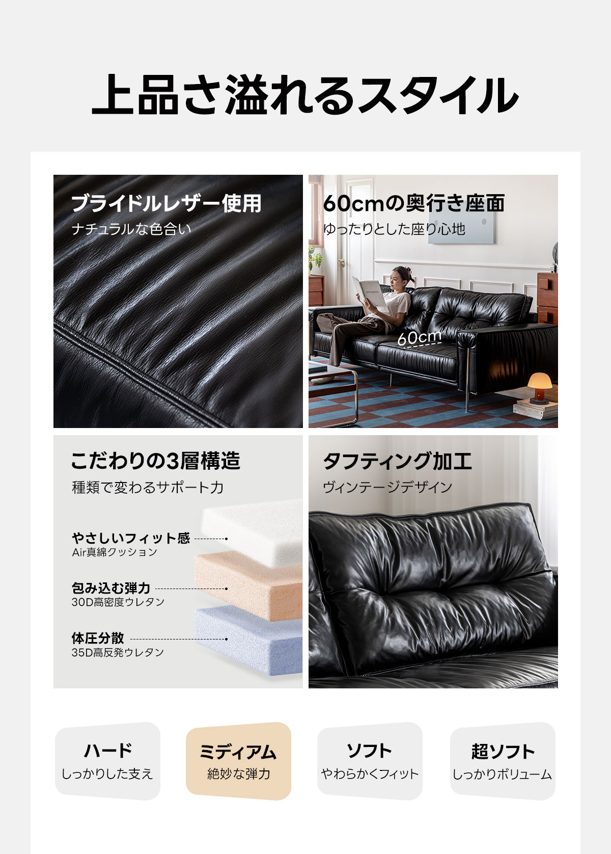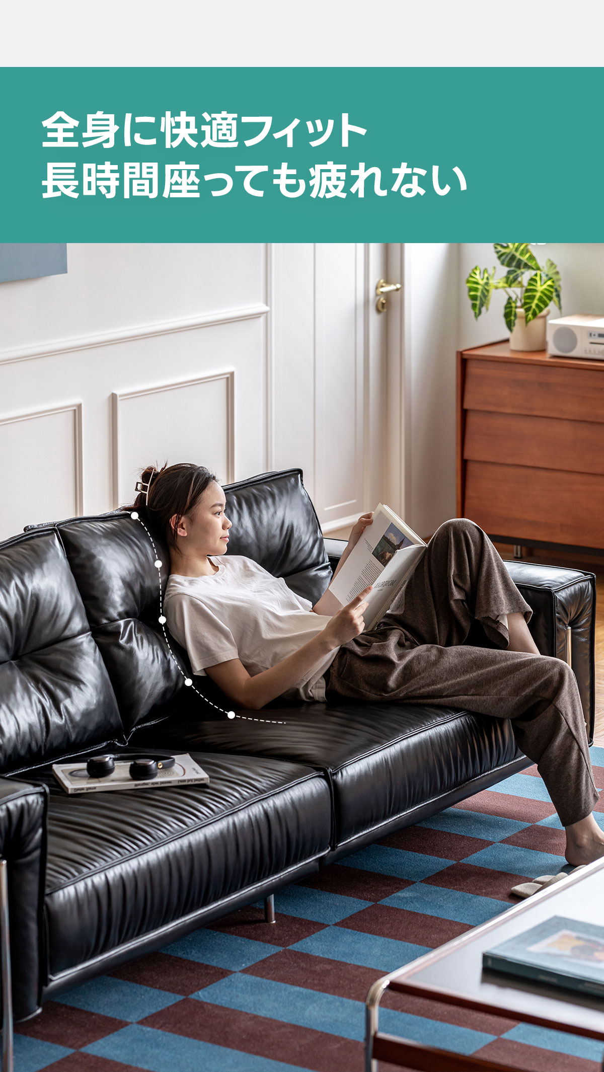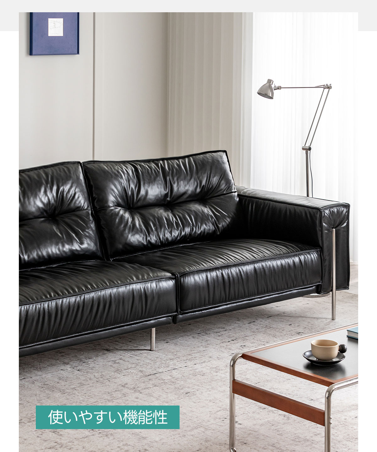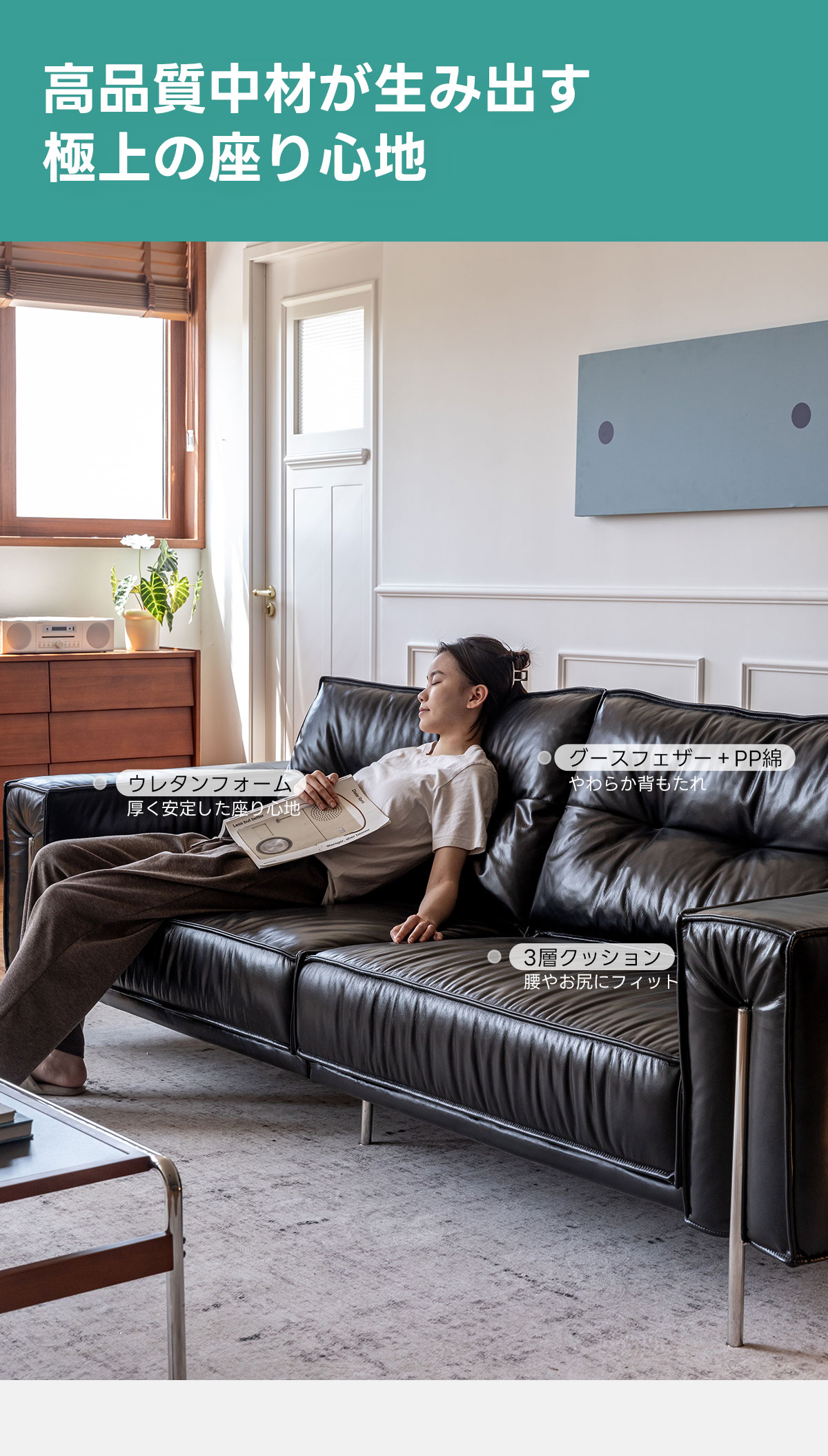 - 【快適な座り心地と高品質素材】アメリカ産のブライドルレザーを使用したモダンレザーソファは、3層構造のクッションで体圧を分散し、長時間座っても疲れにくい快適な座り心地を提供します。