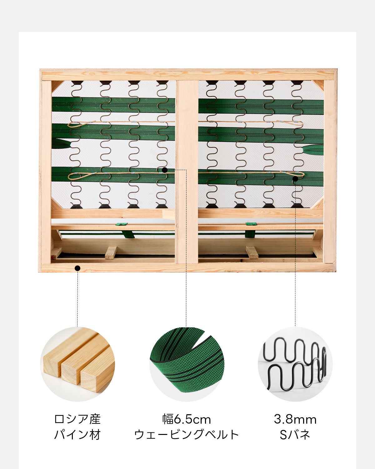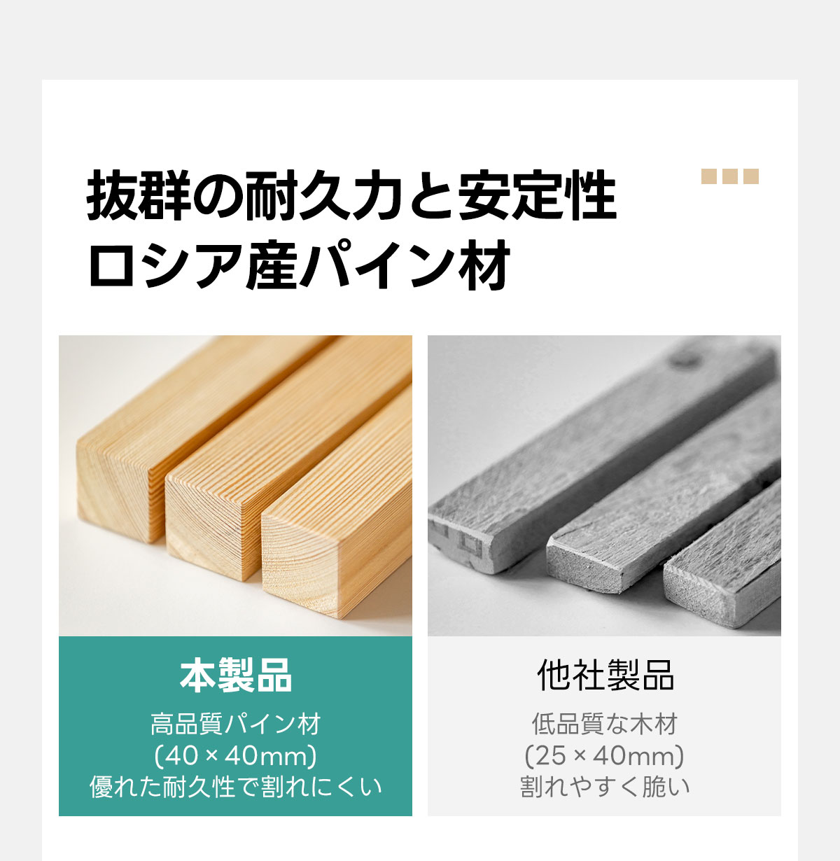 - 【頑丈で安定したフレーム】ロシア産パイン材を使用したフレームとステンレス脚部は、優れた耐久性と安定性を誇ります。長期間使用しても安心の品質です。